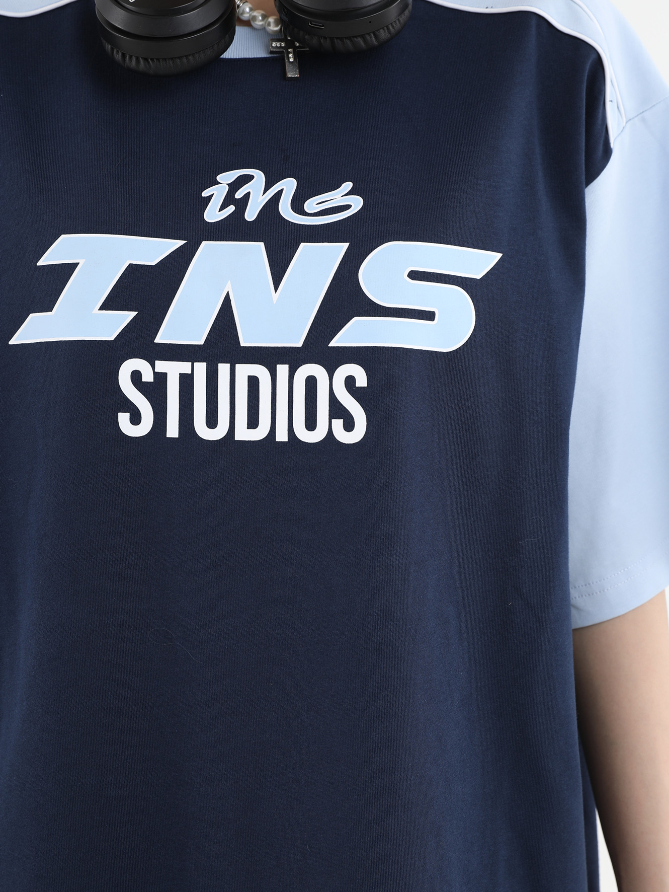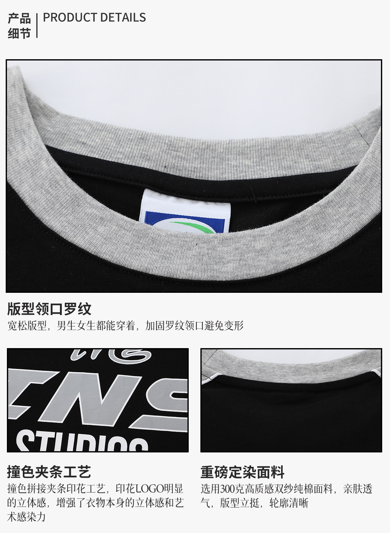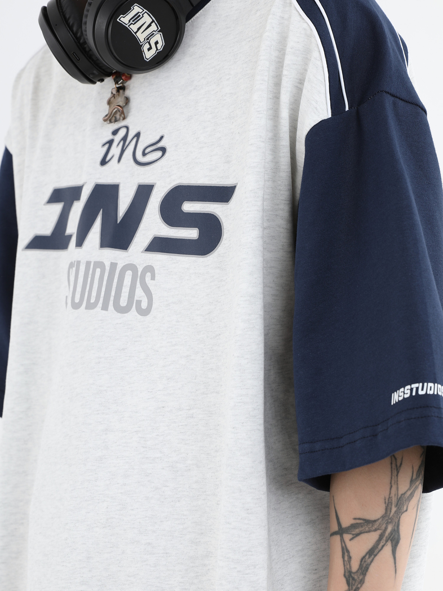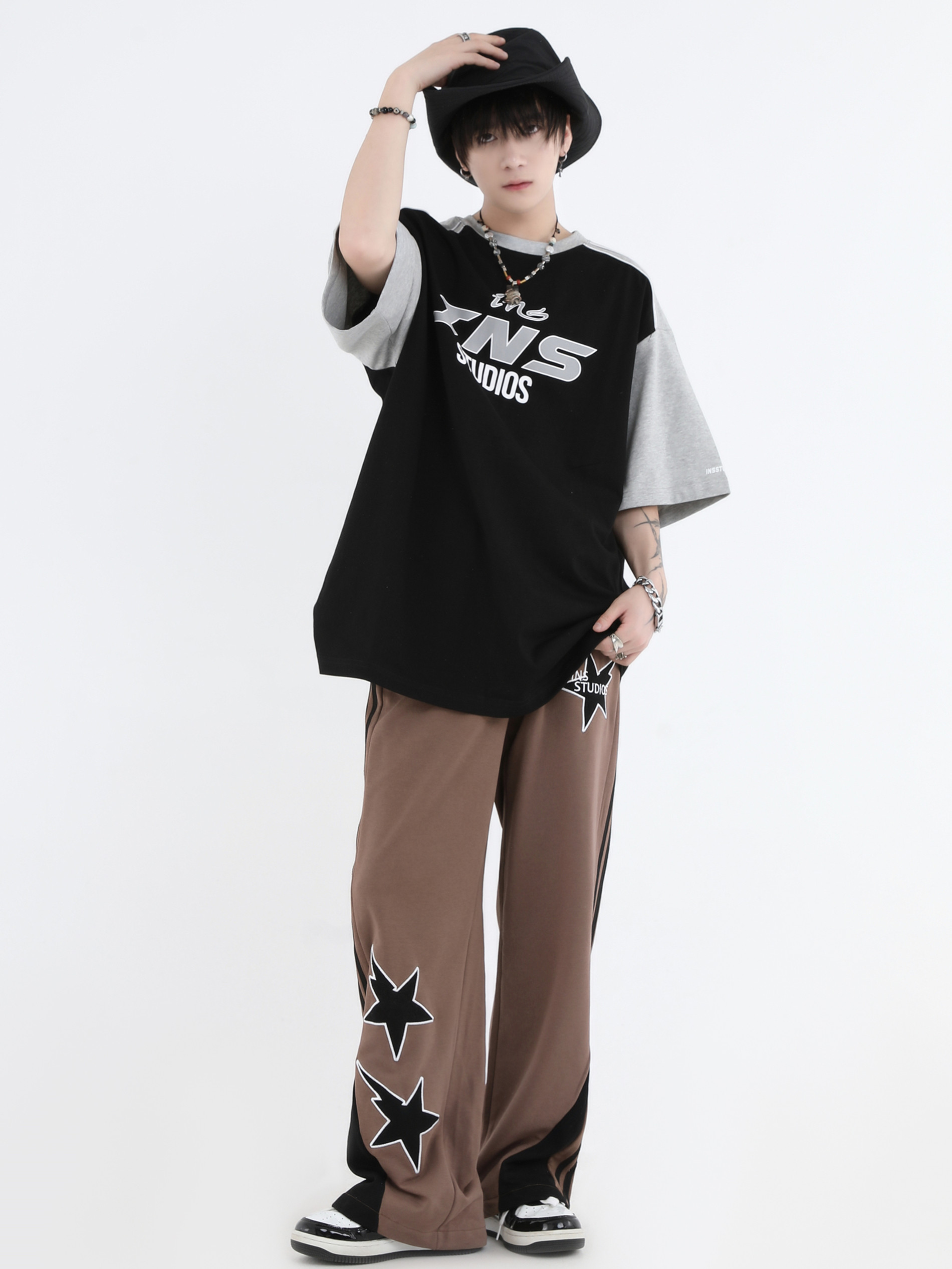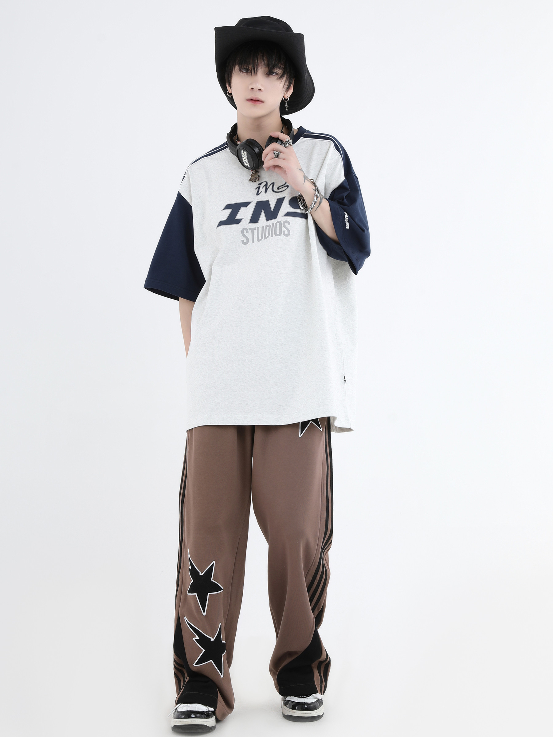 NOPASS 國潮牌情侶原創美式肩部撞色夾條印花短袖寬鬆半袖純棉T恤