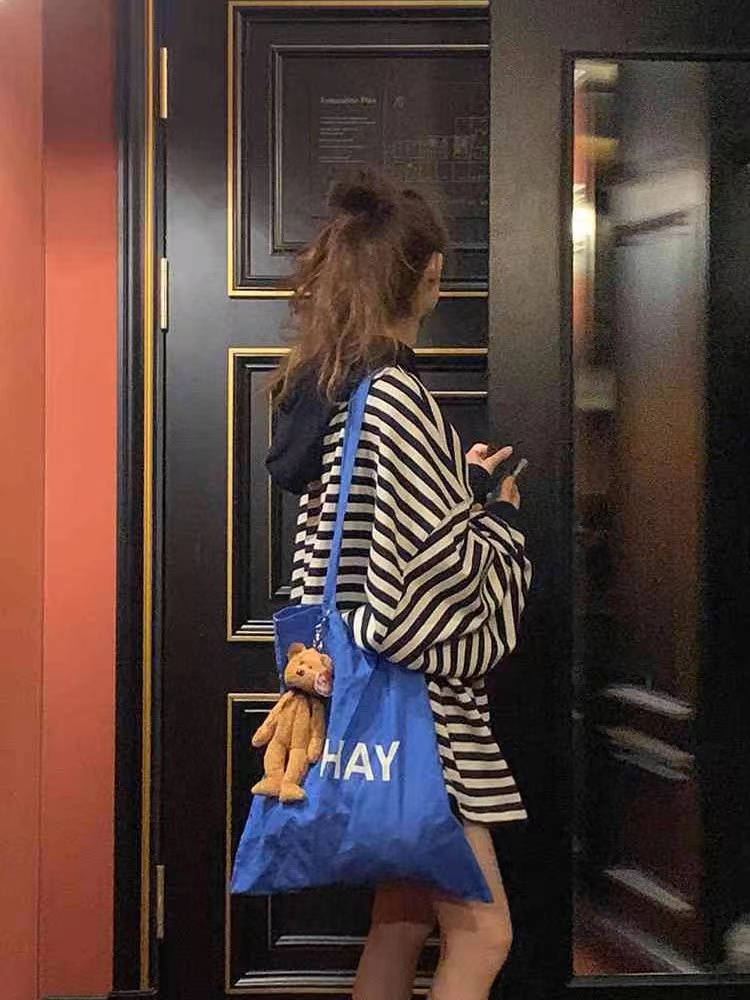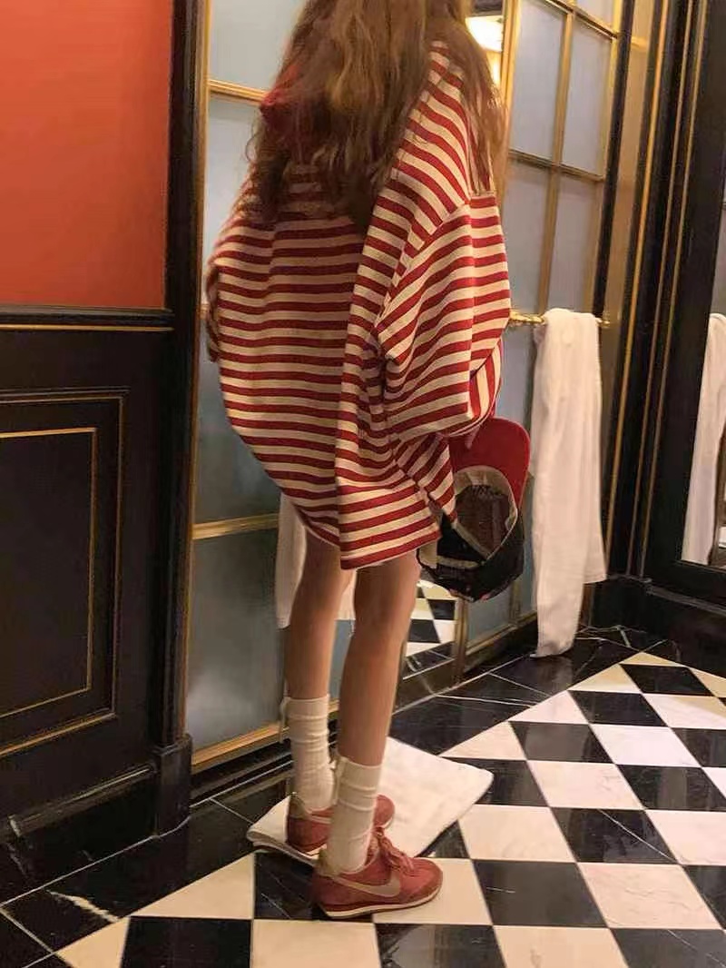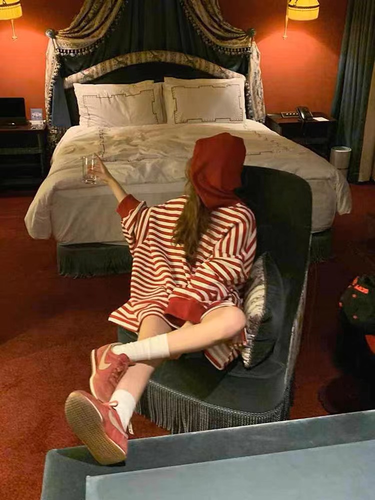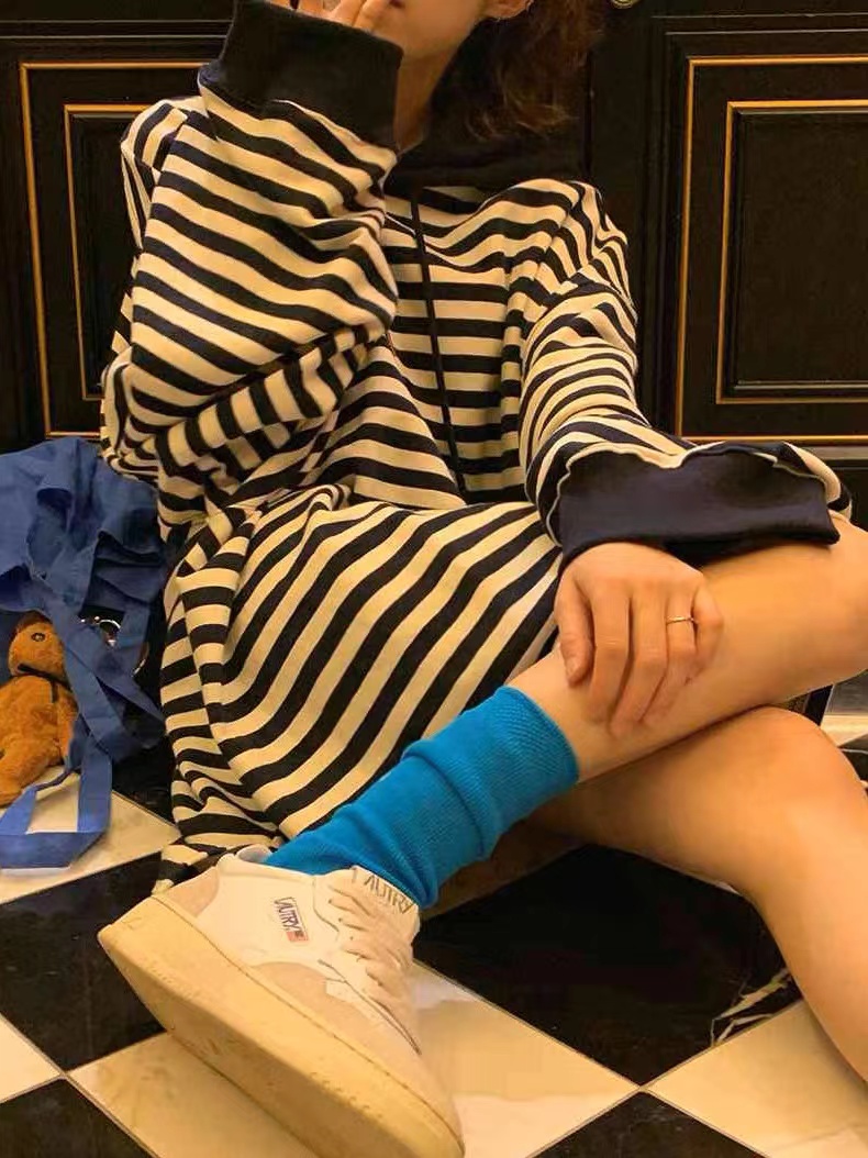 韓國東大門2023春裝新款時尚百搭條紋連帽寬鬆慵懶衛衣洋裝女潮