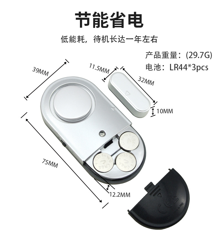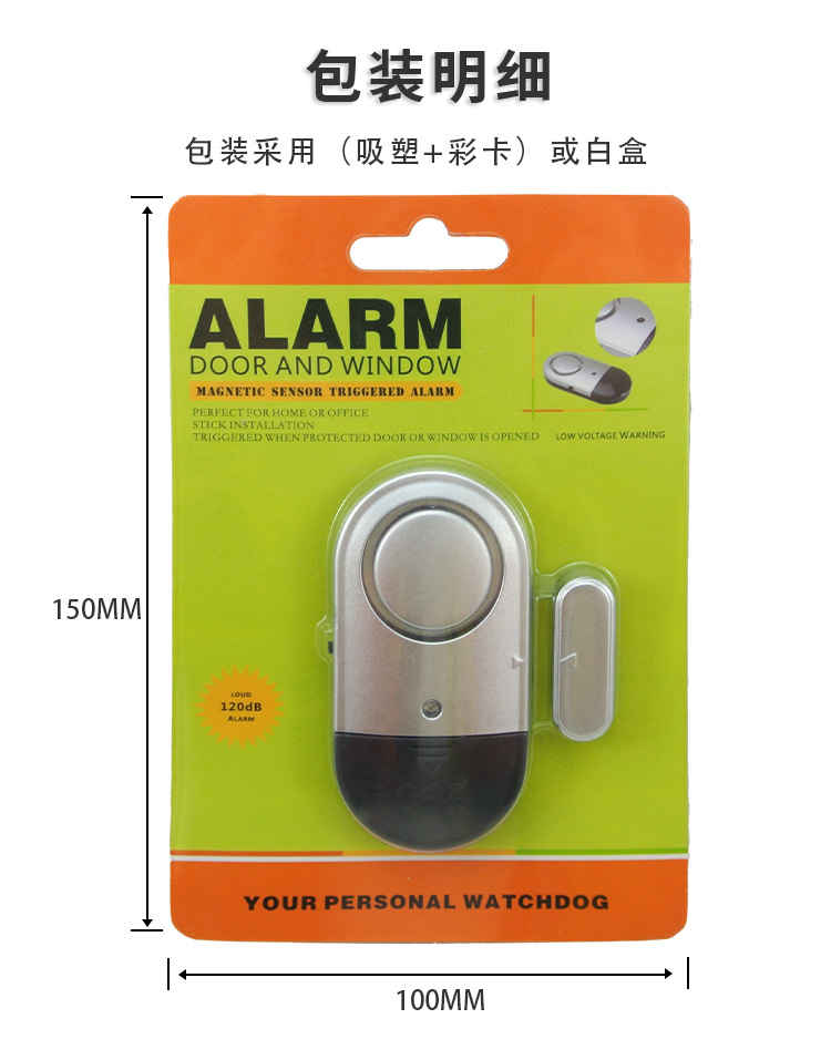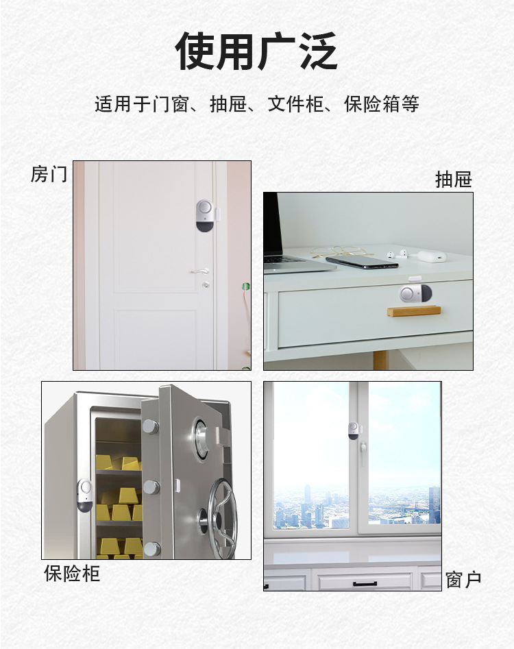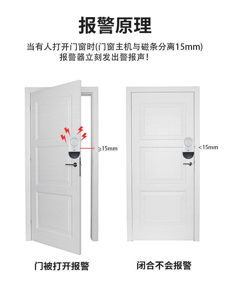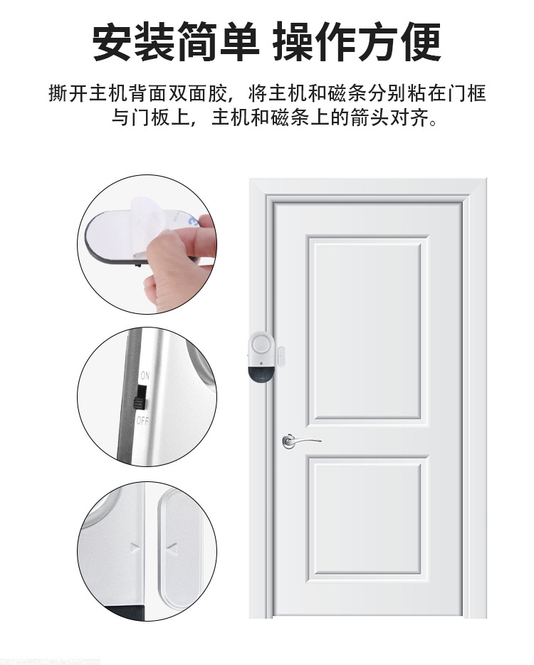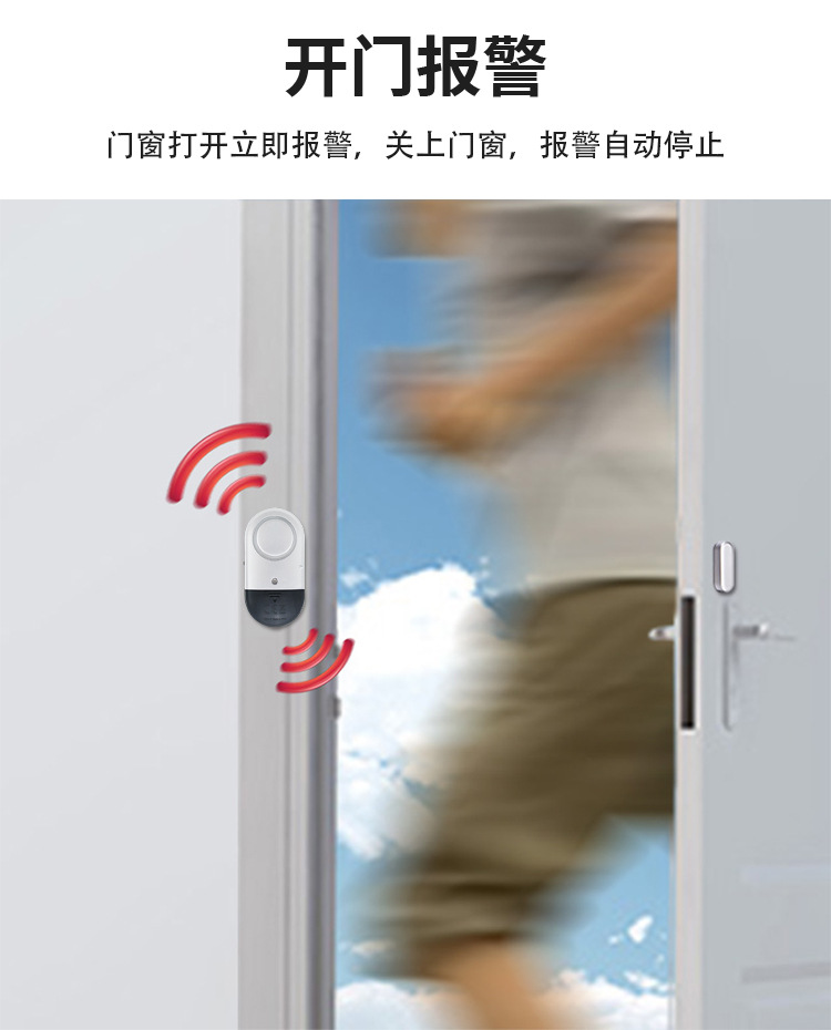 1. 产品包含报警主机和感应磁条两部分,牢固的背面贴纸,可将产品运用于任何门窗上。