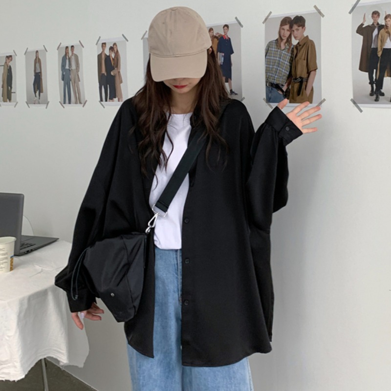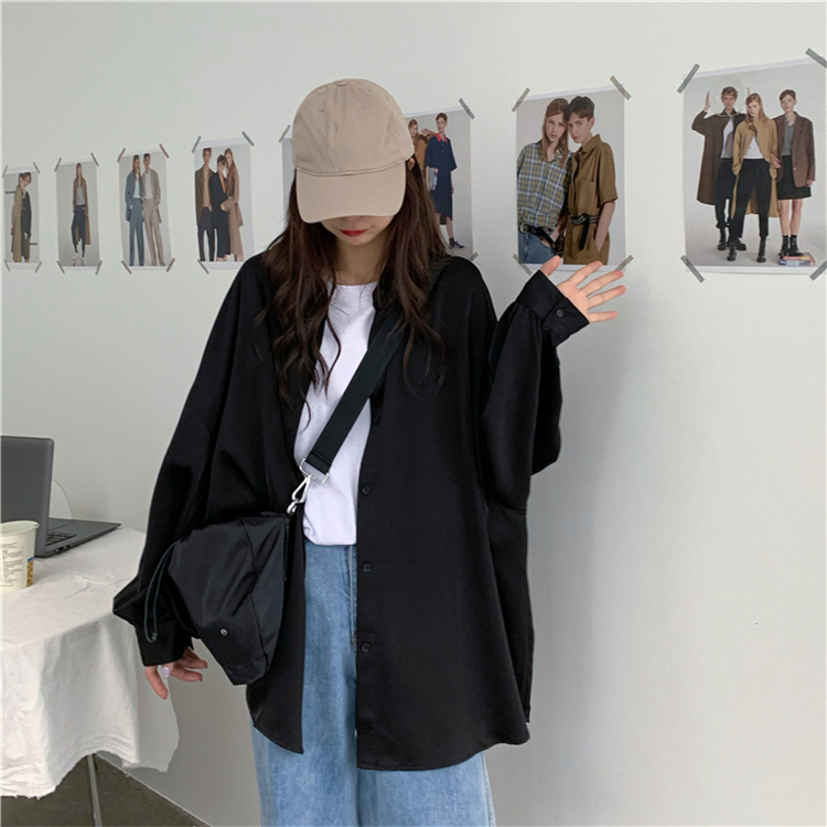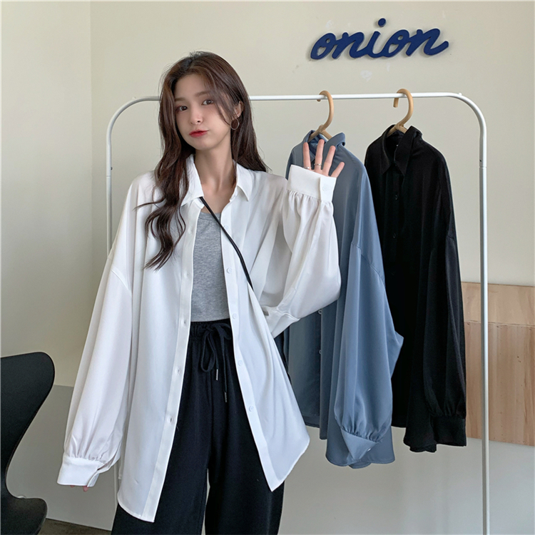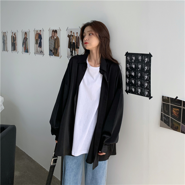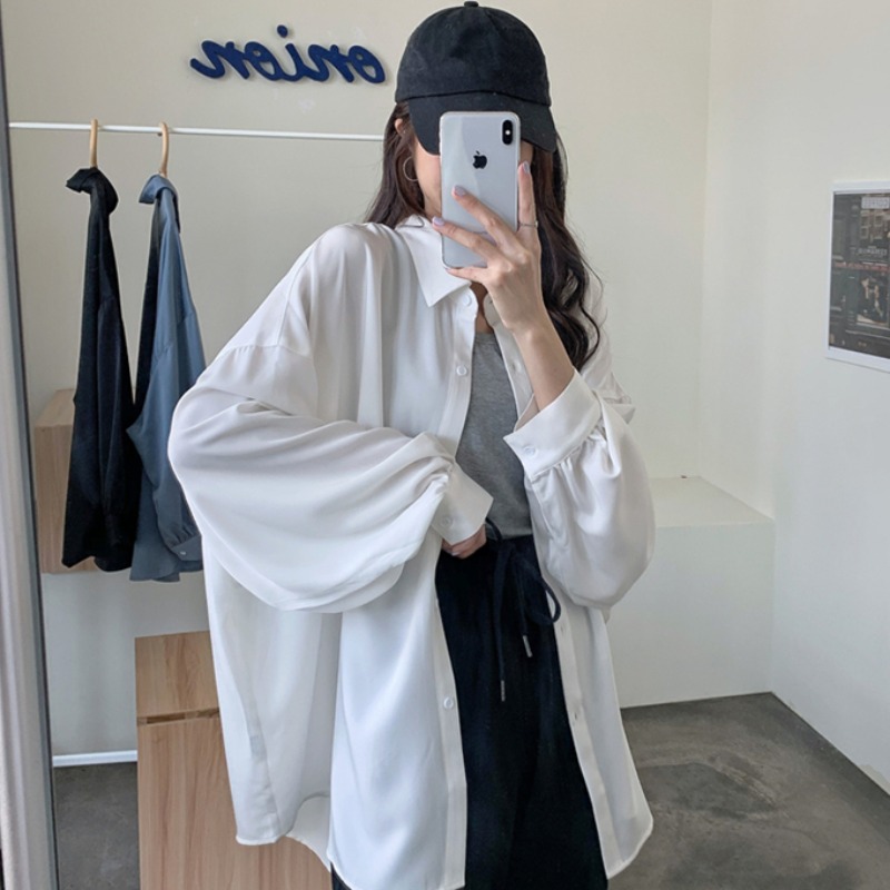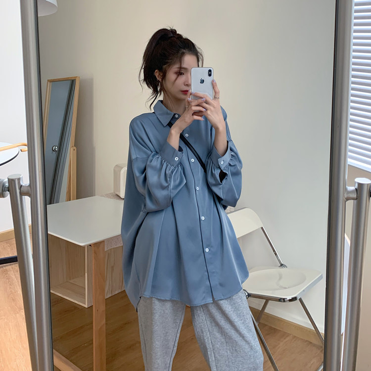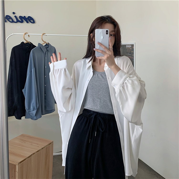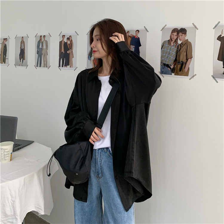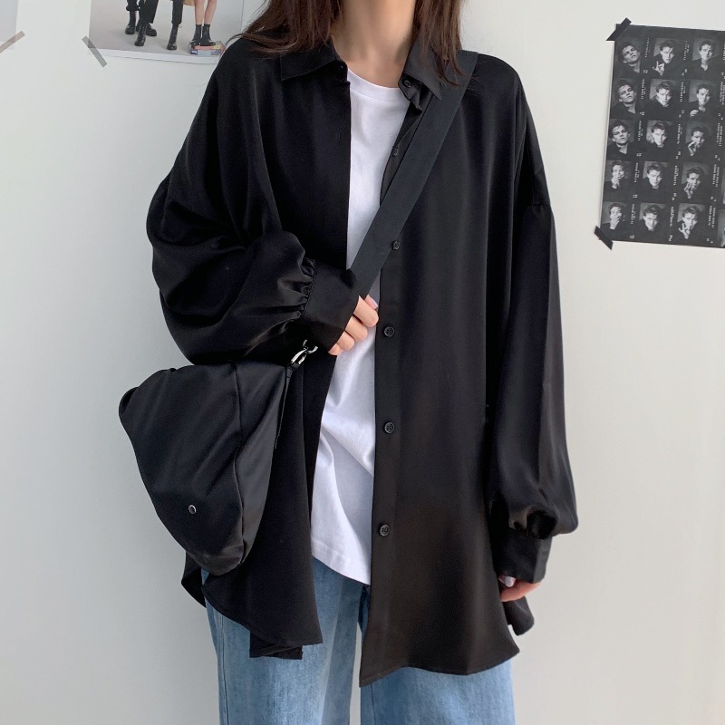 秋季新款垂感燈籠袖黑襯衫女士上衣中長版慵懶風內搭疊穿襯衫外套