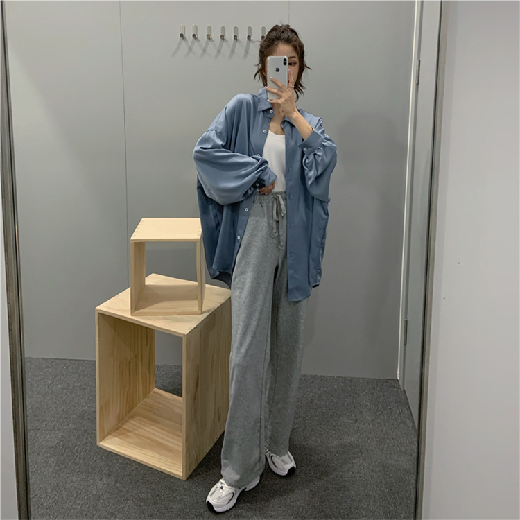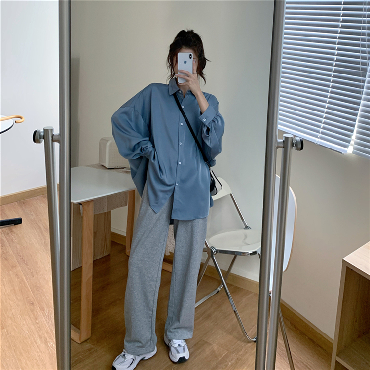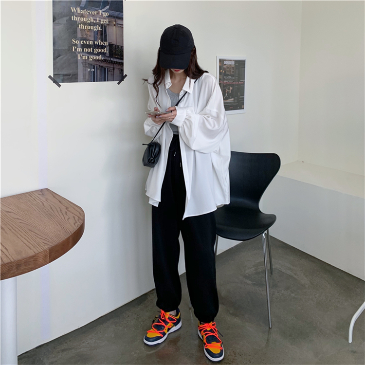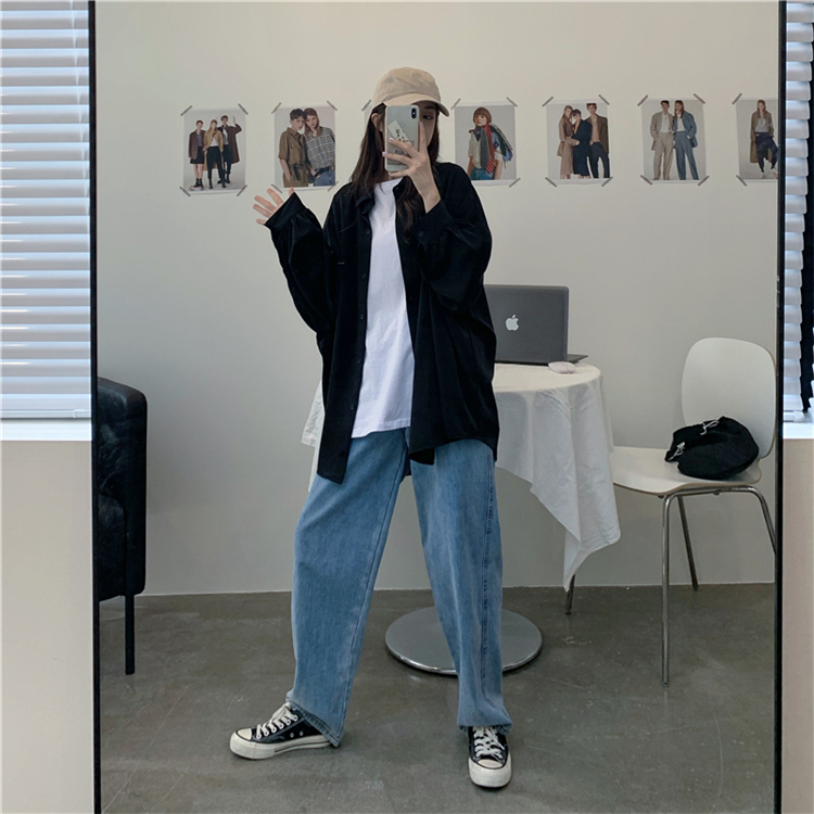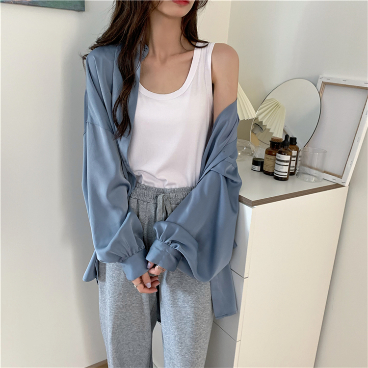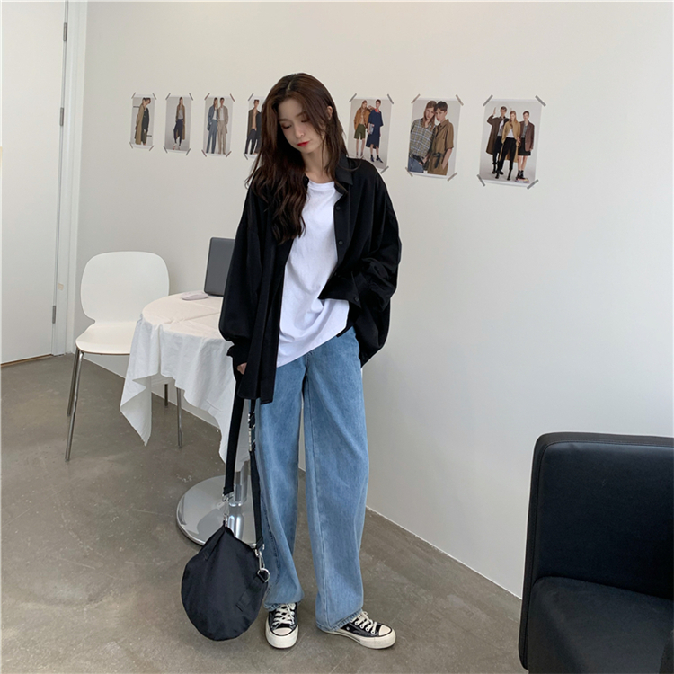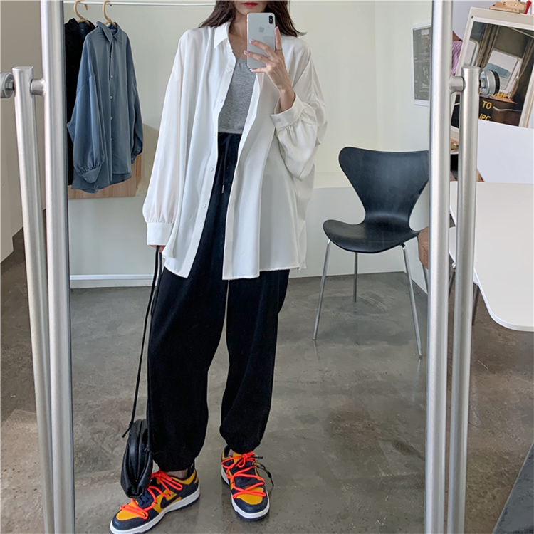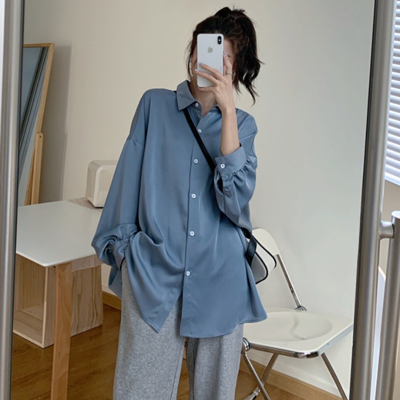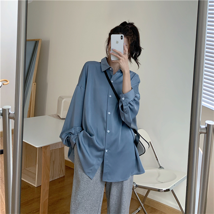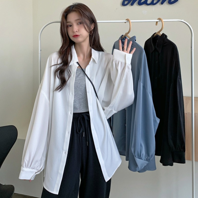秋季新款垂感燈籠袖黑襯衫女士上衣中長版慵懶風內搭疊穿襯衫外套