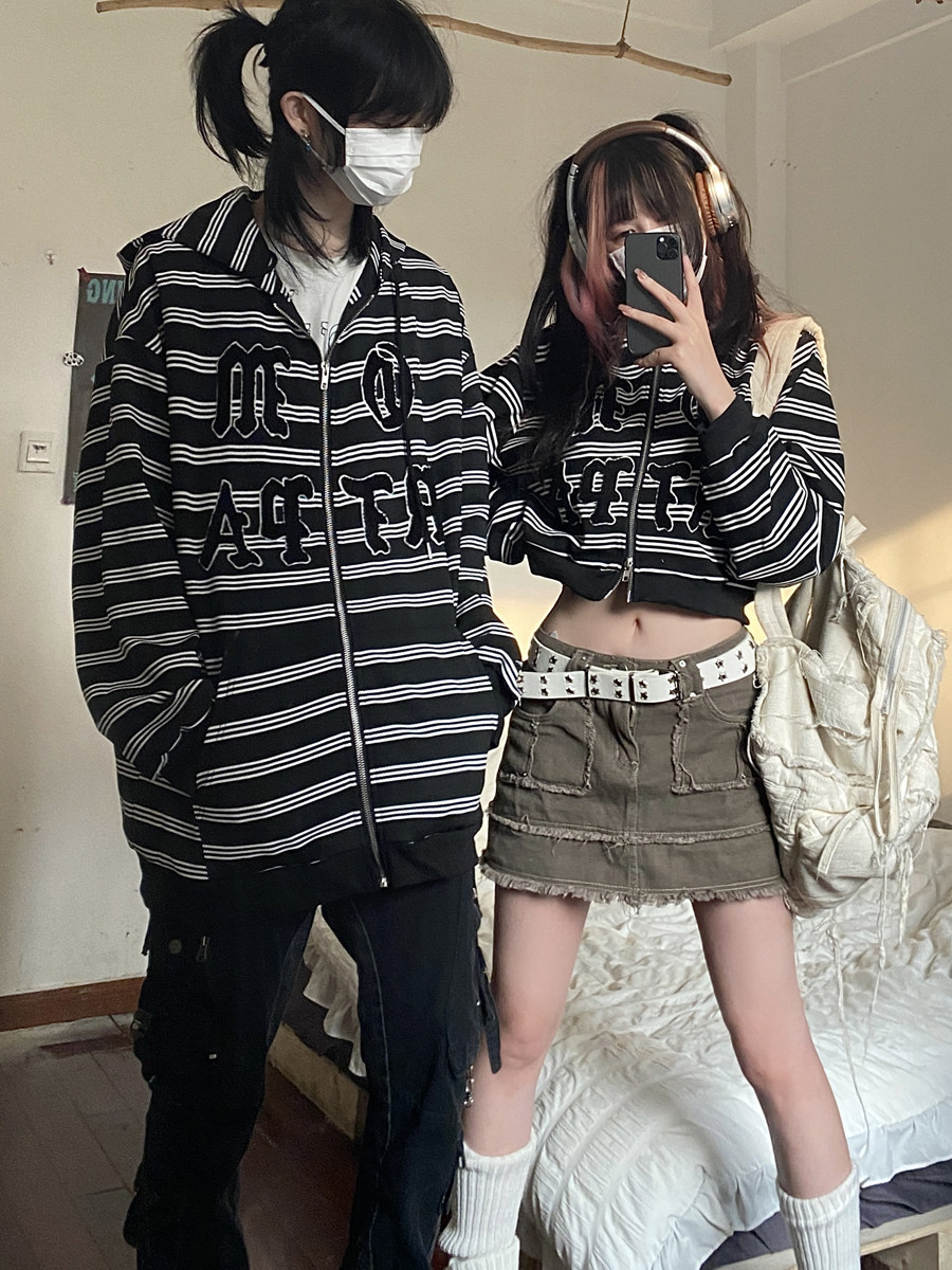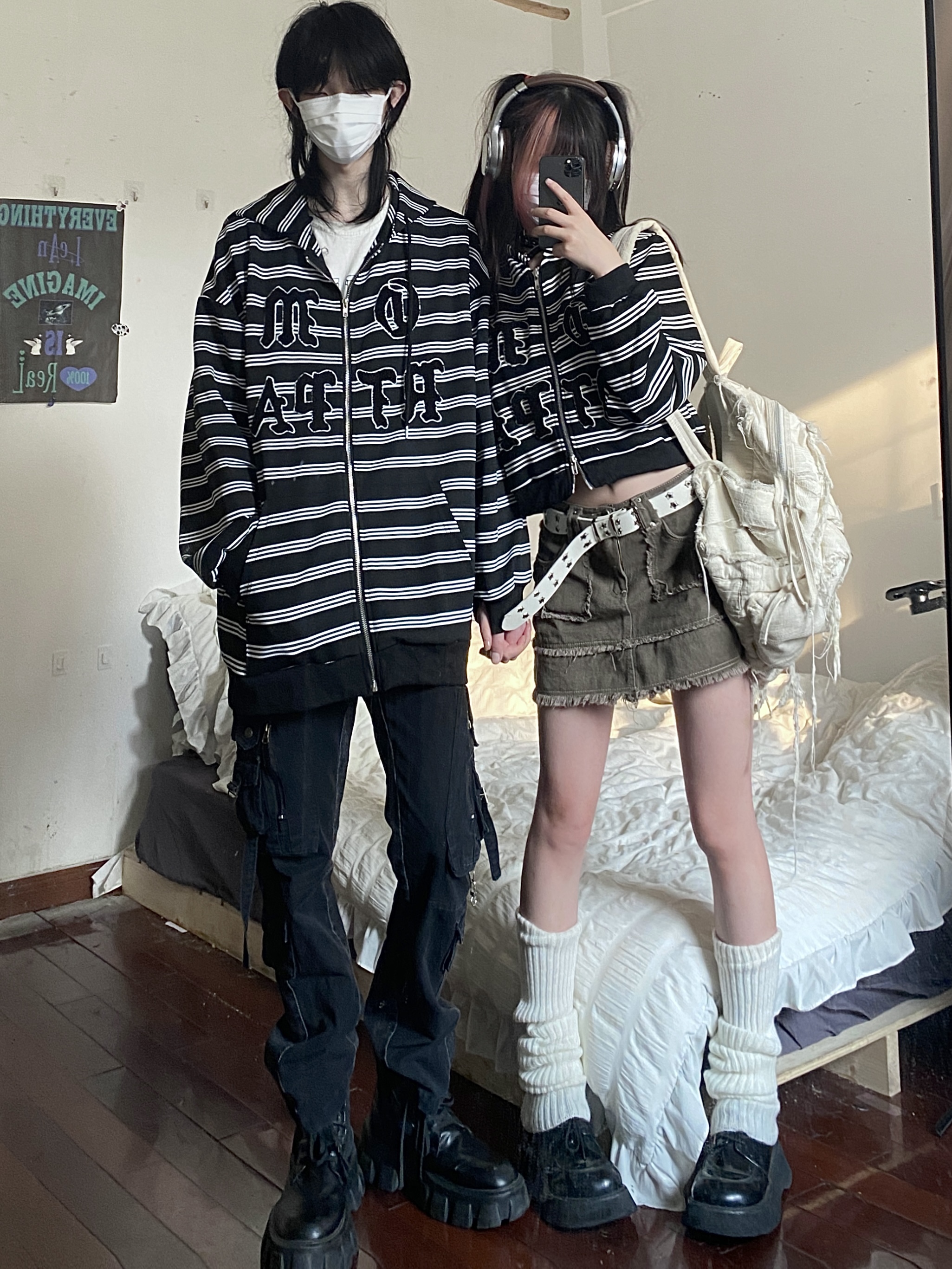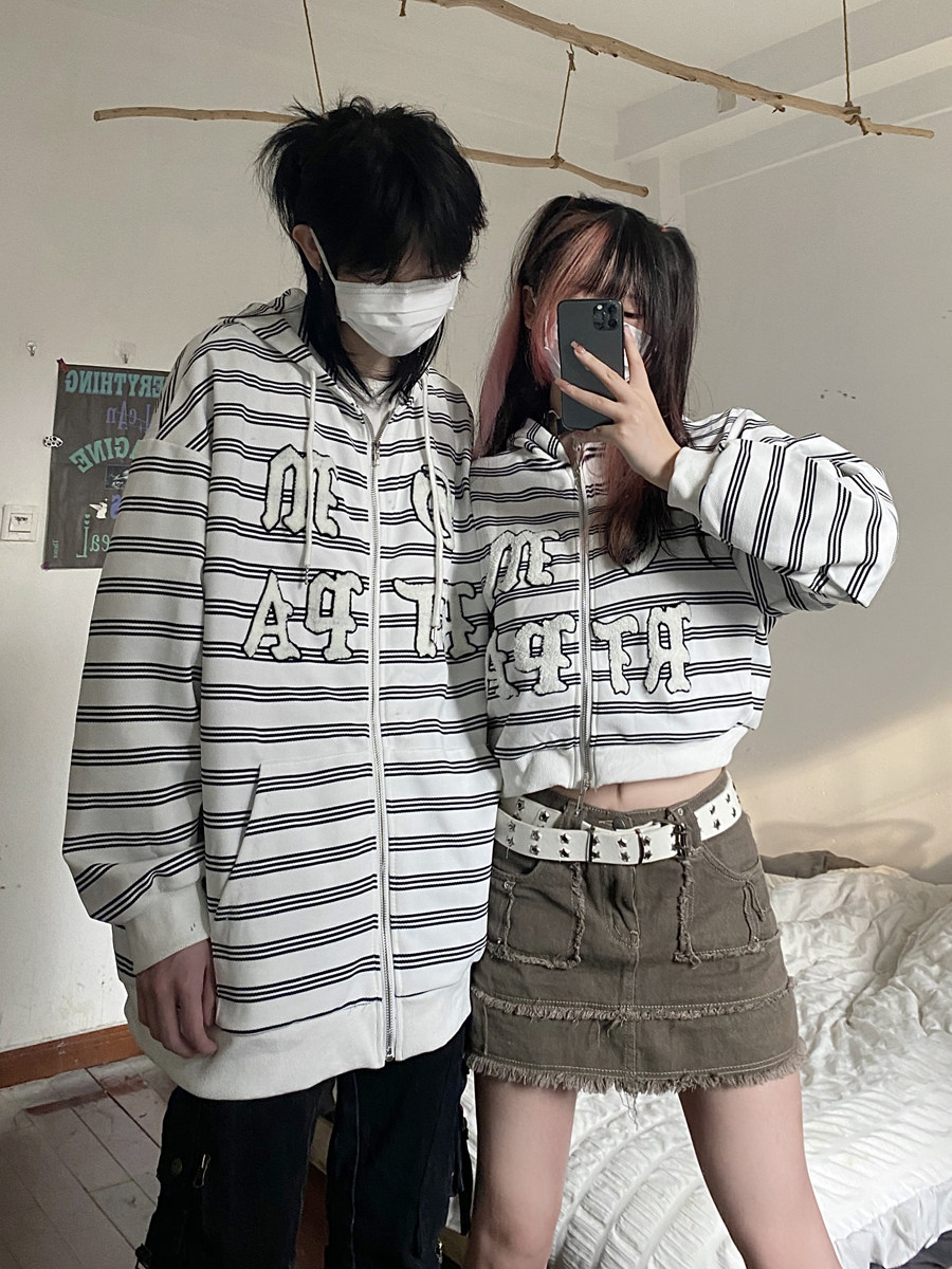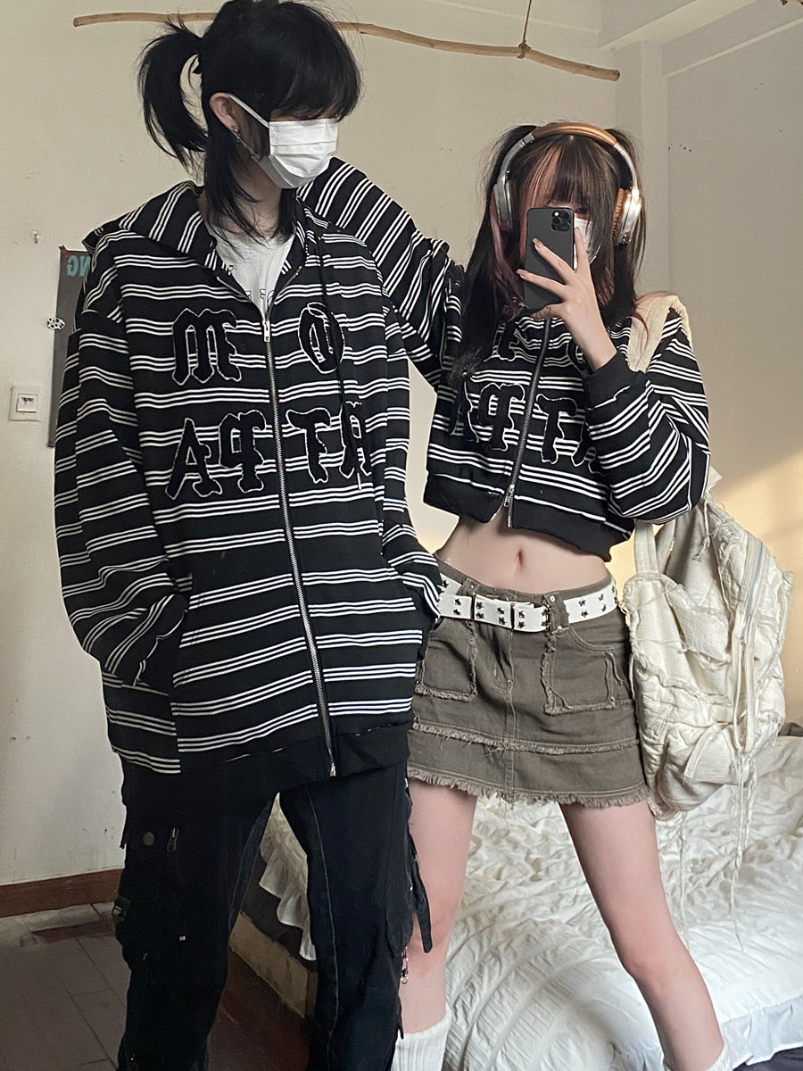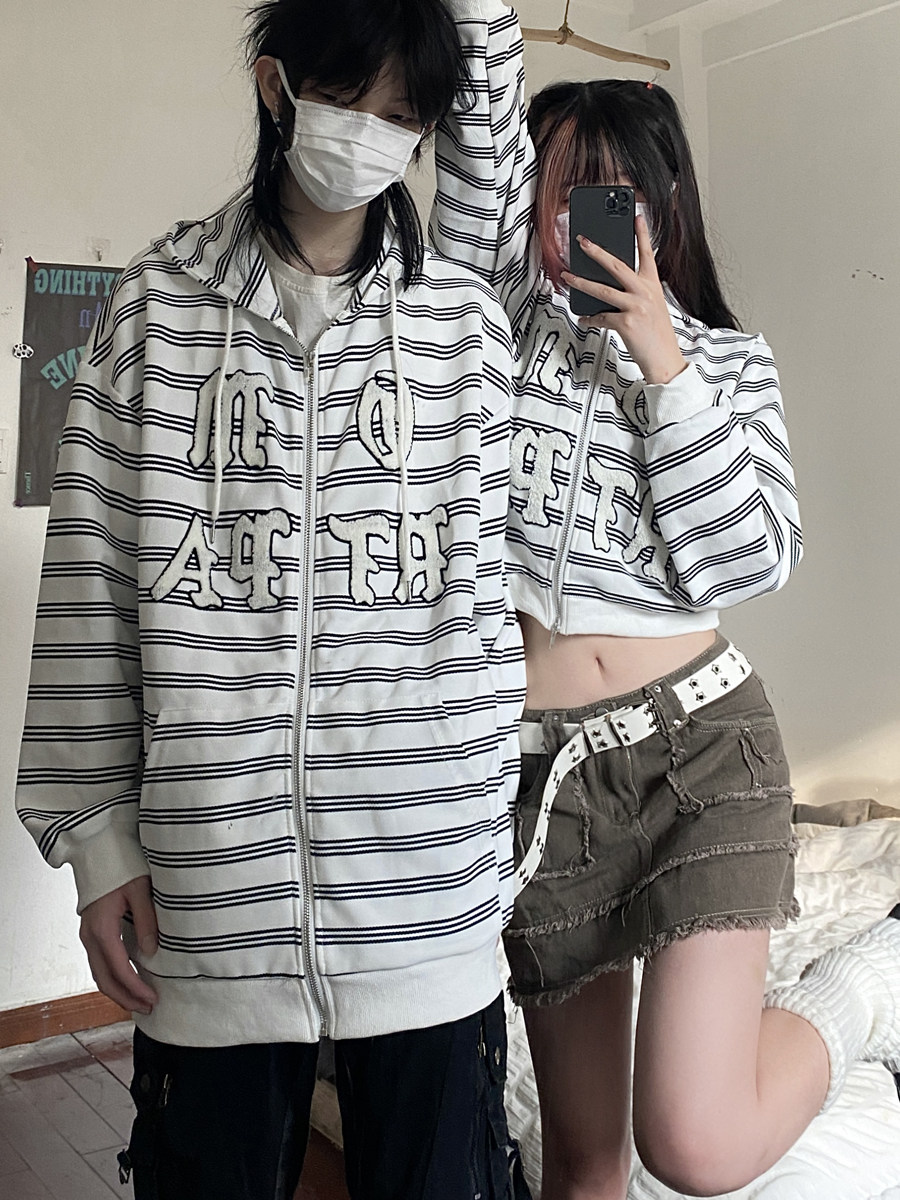 Takeoff咖哩秋新款條紋連帽開衫衛衣短外套寬鬆潮ins街頭情侶bf