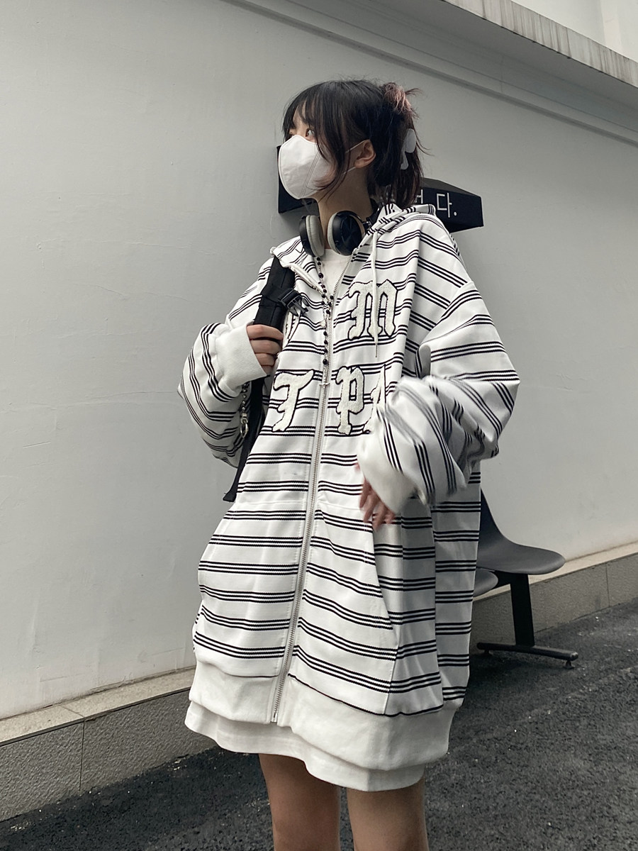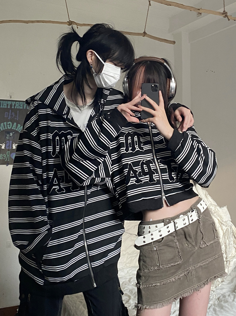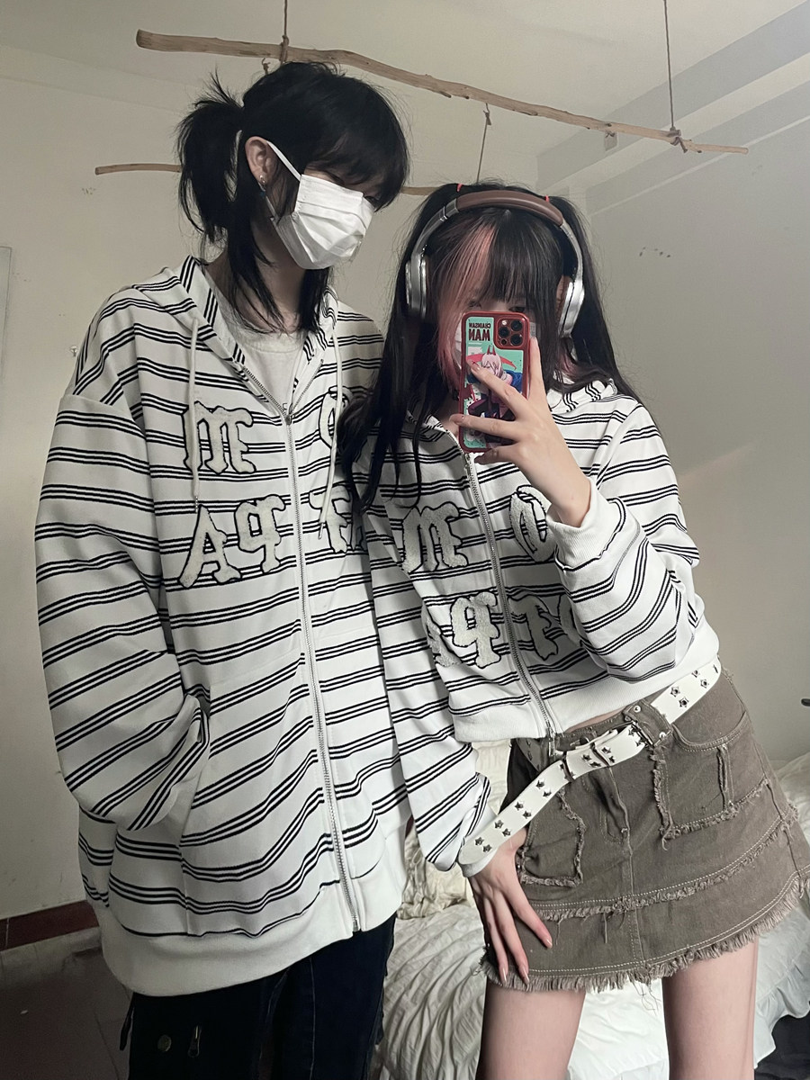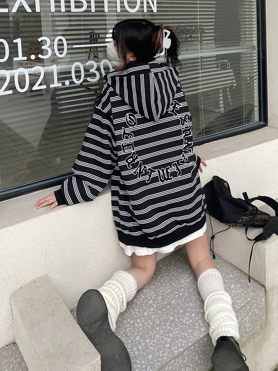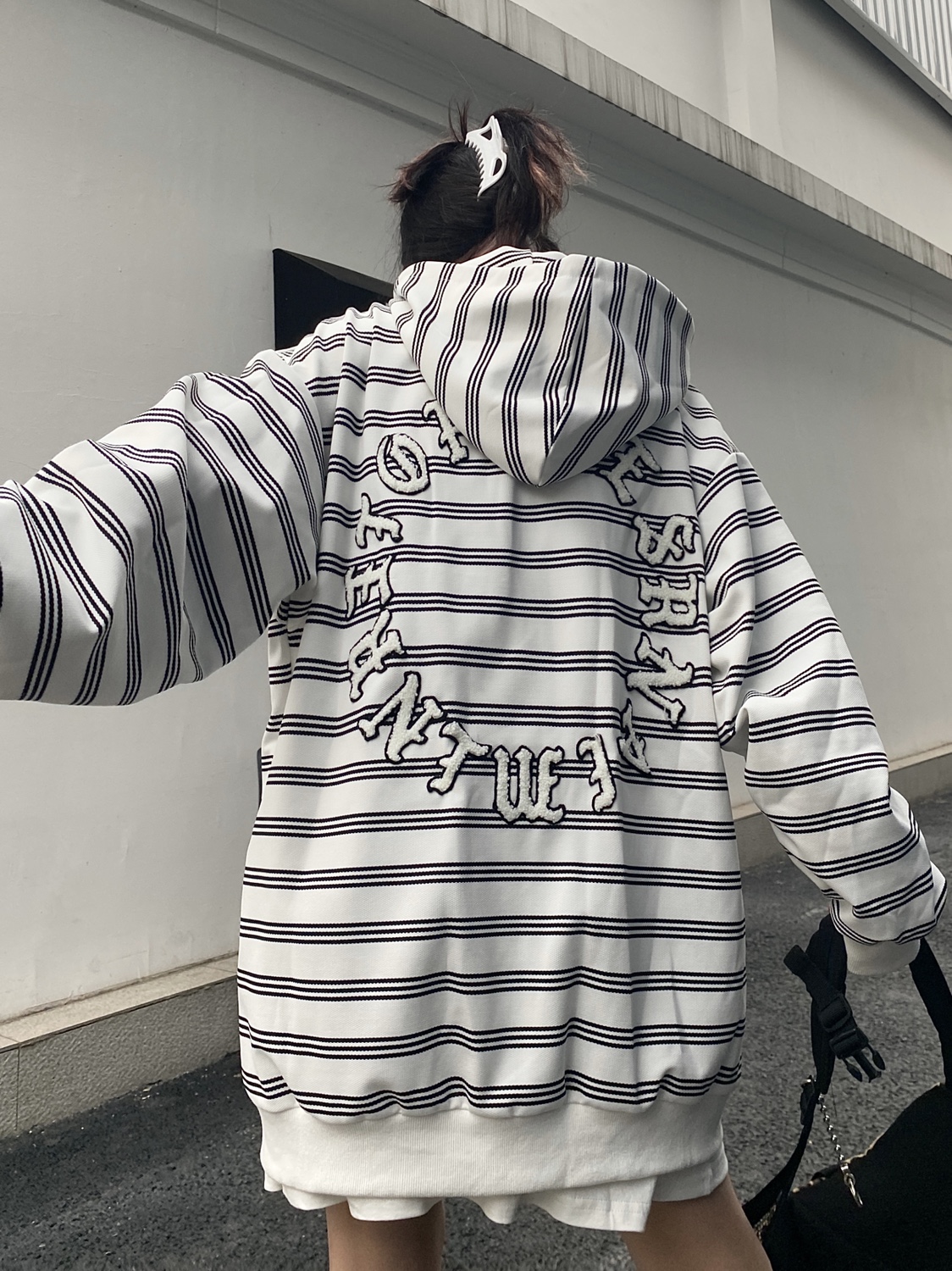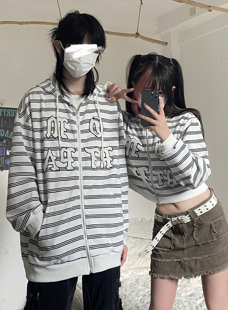 Takeoff咖哩秋新款條紋連帽開衫衛衣短外套寬鬆潮ins街頭情侶bf