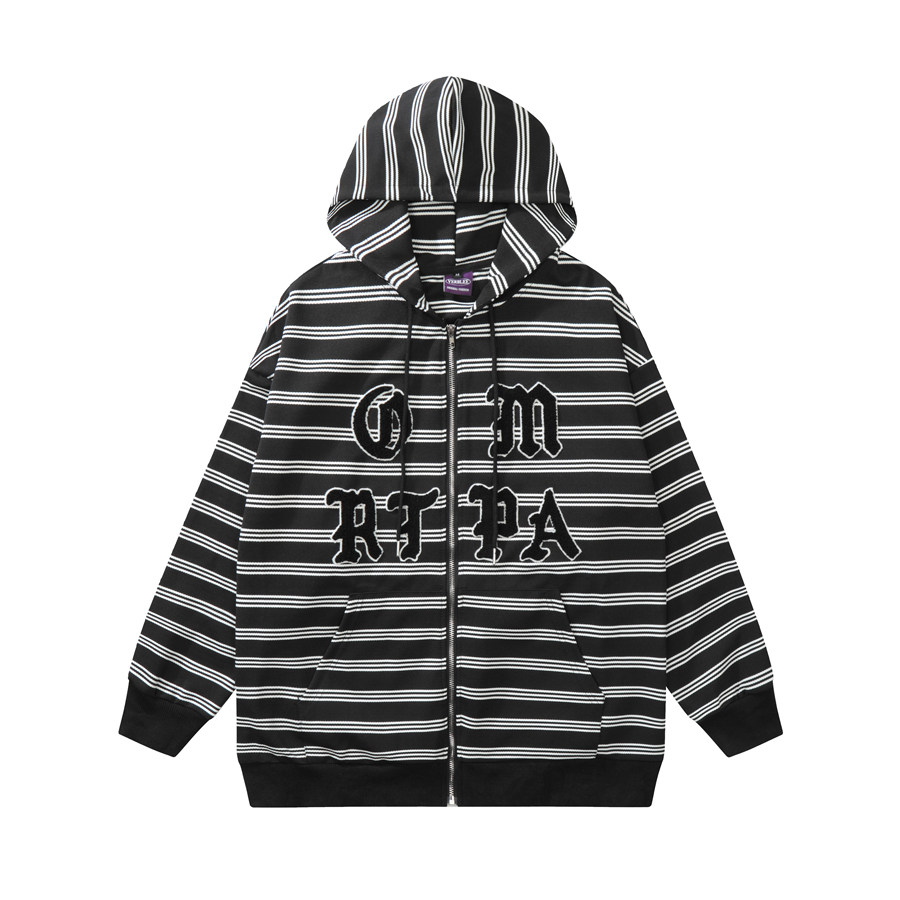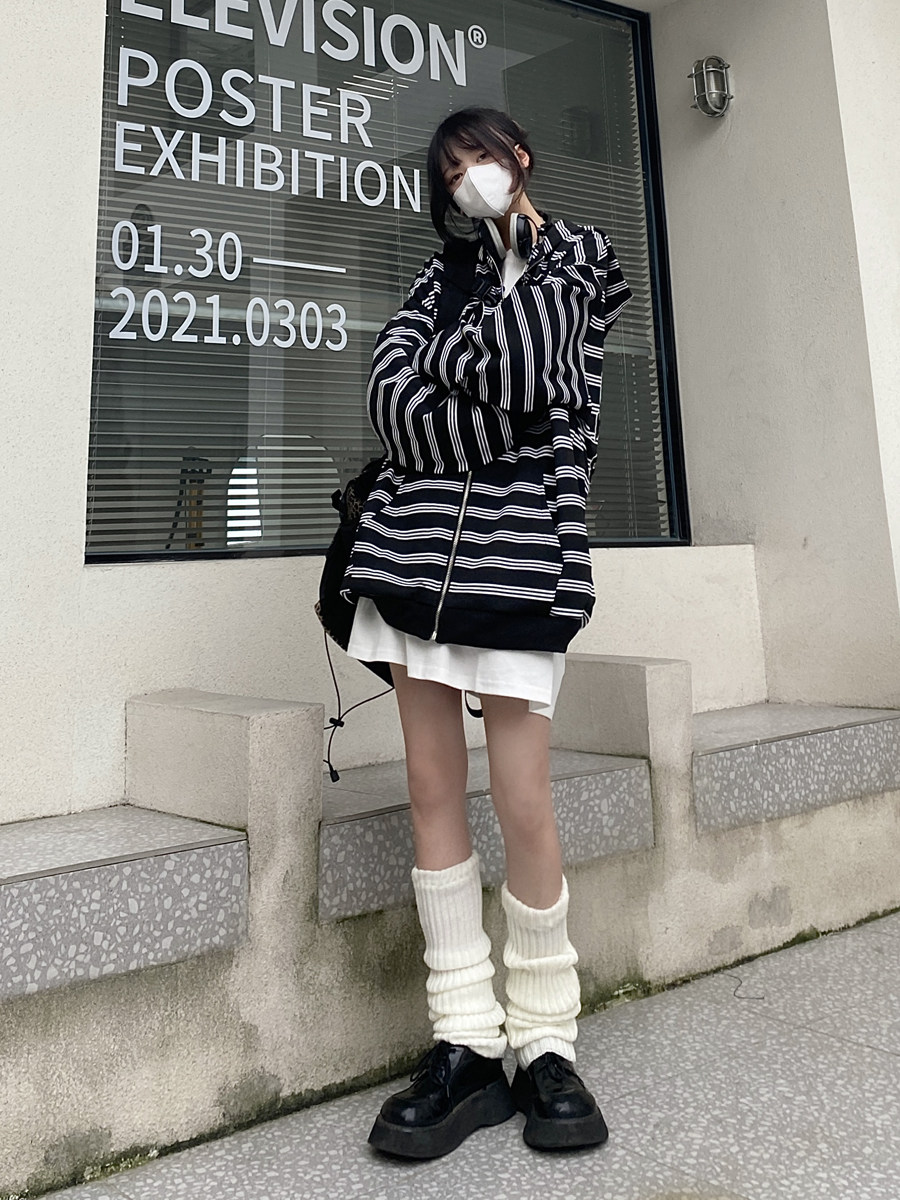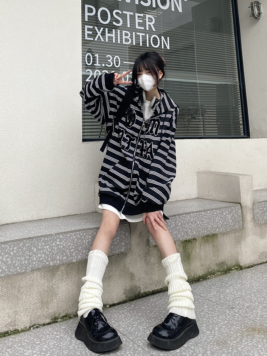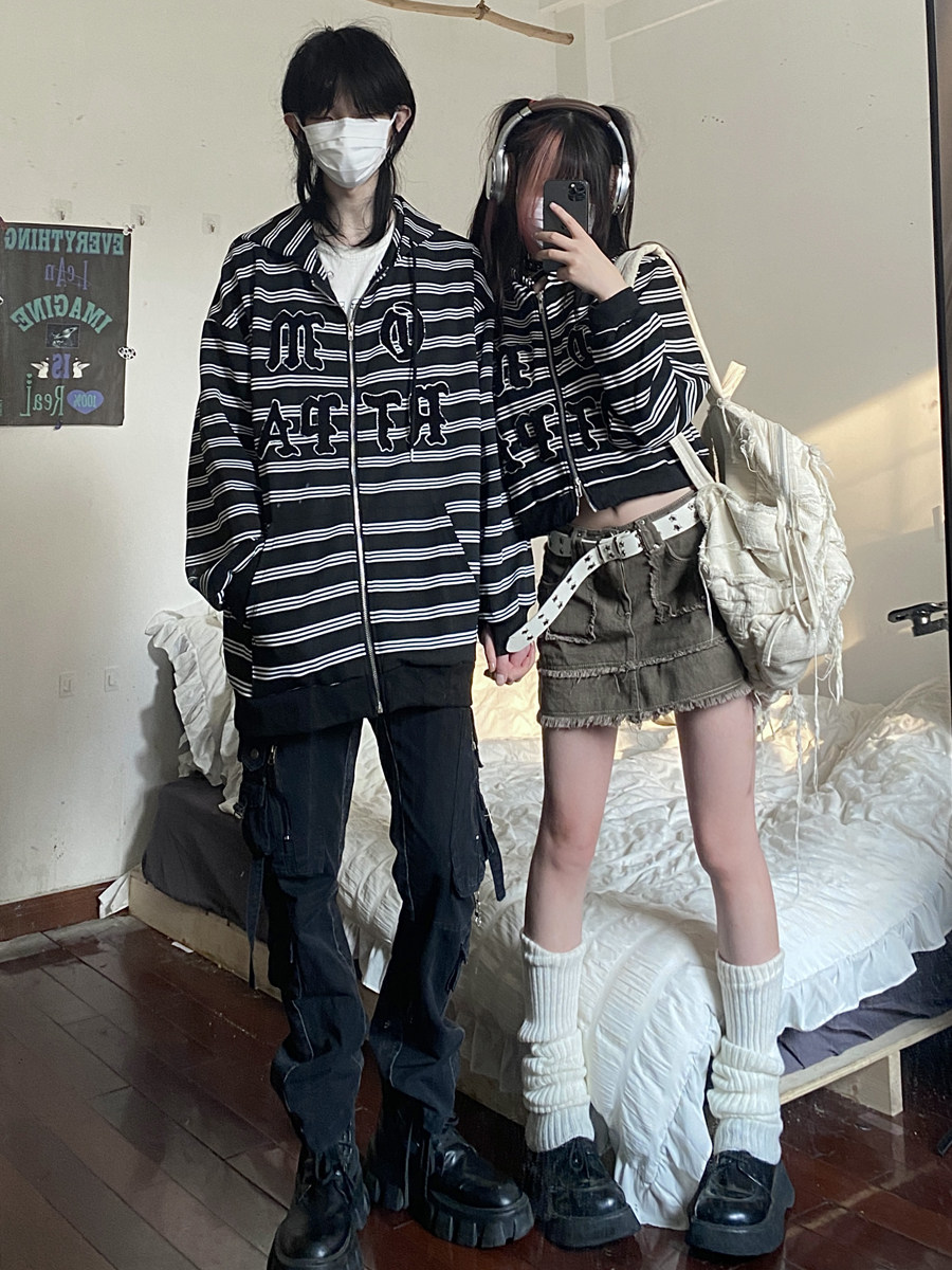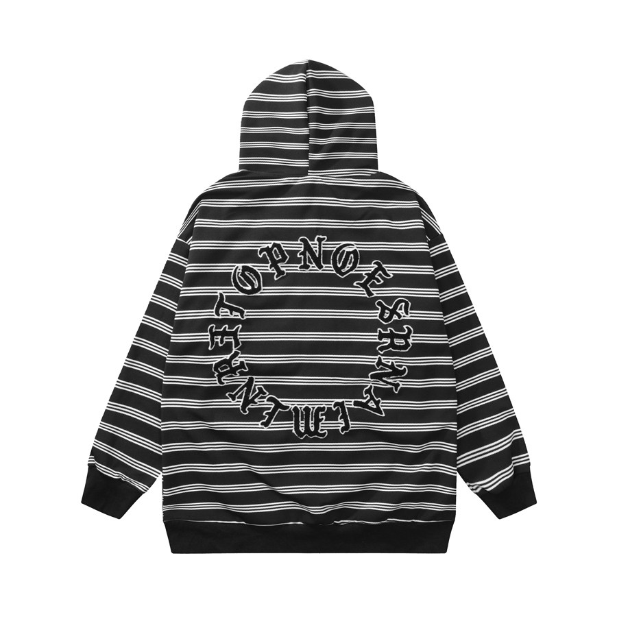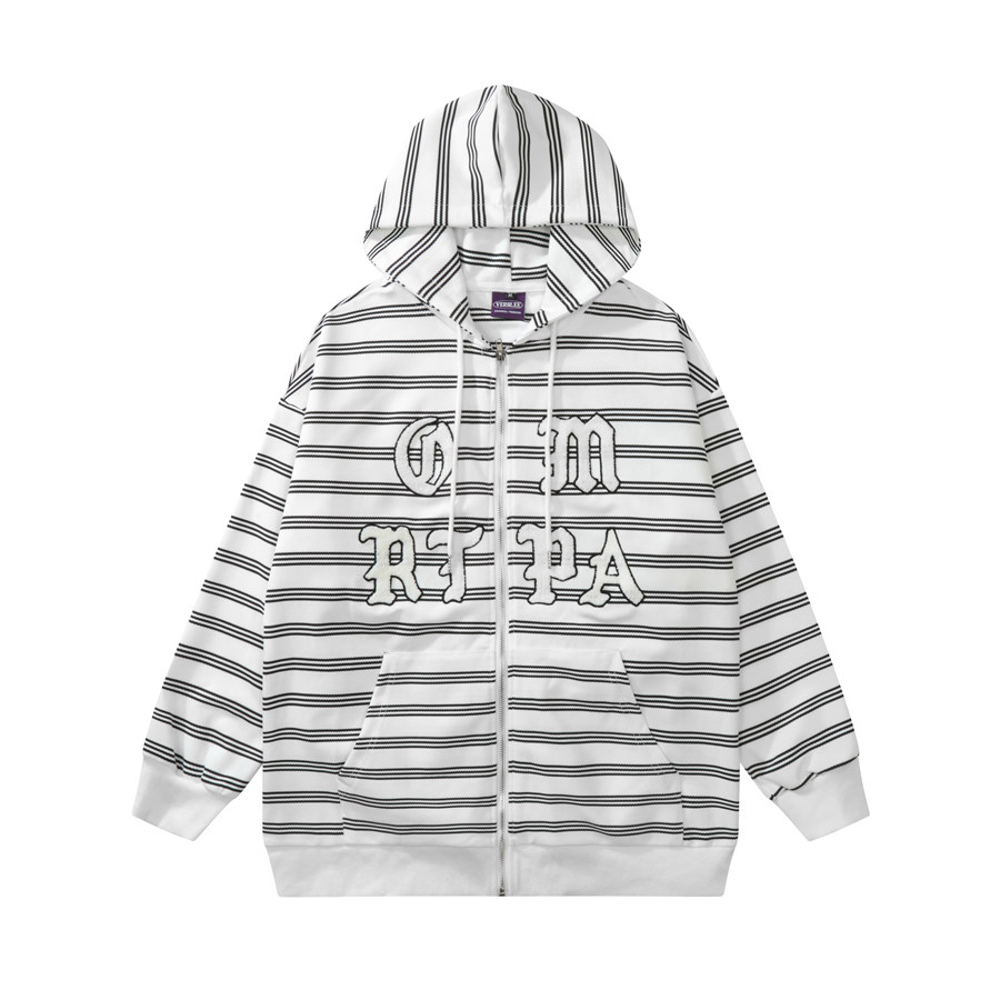 Takeoff咖哩秋新款條紋連帽開衫衛衣短外套寬鬆潮ins街頭情侶bf