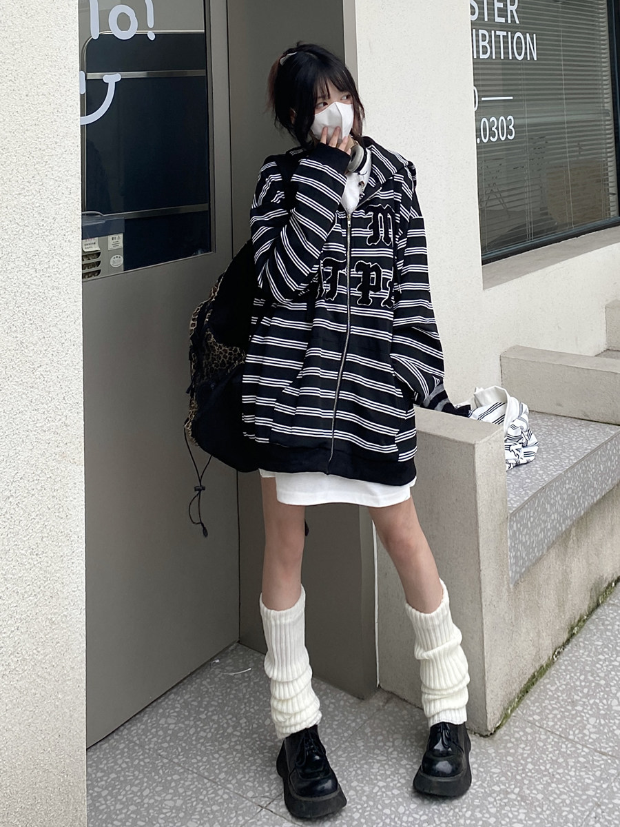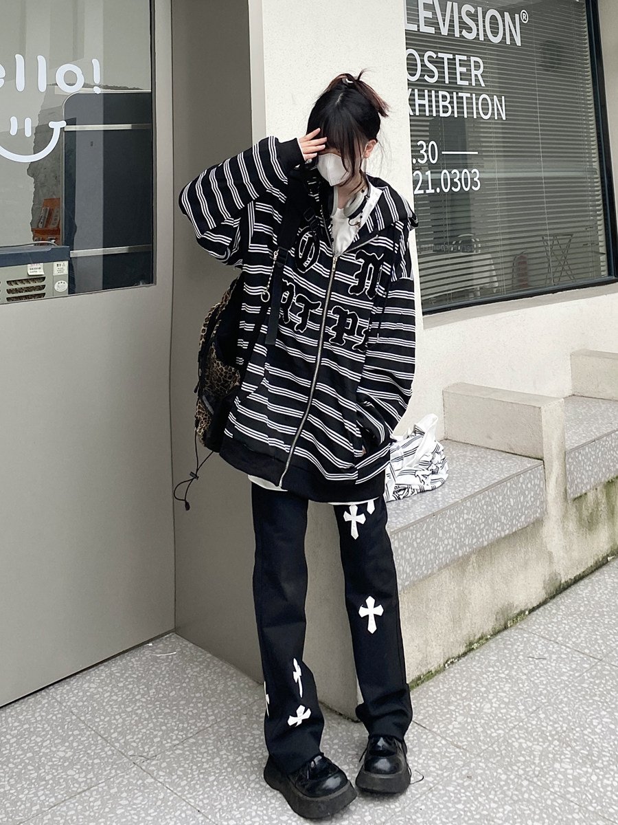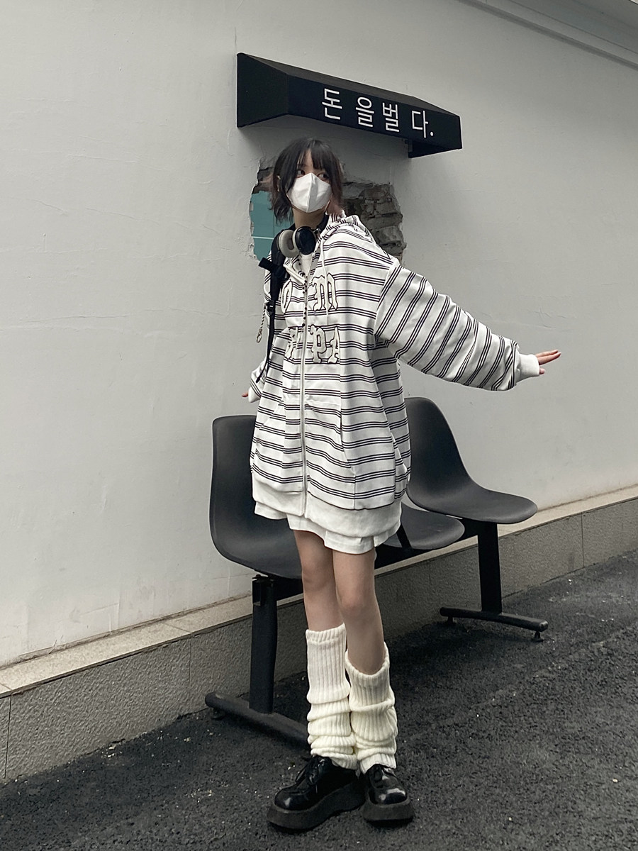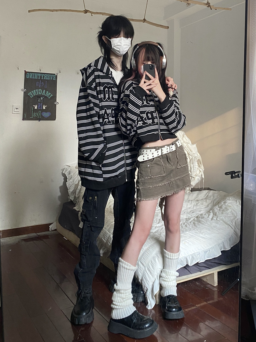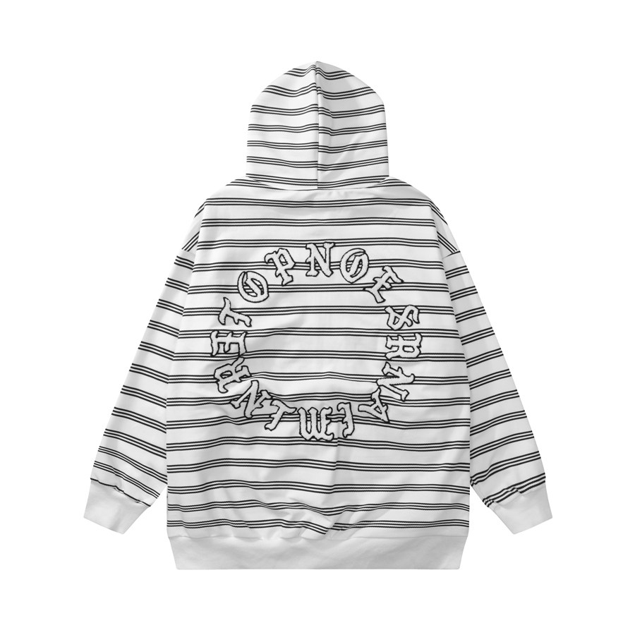 Takeoff咖哩秋新款條紋連帽開衫衛衣短外套寬鬆潮ins街頭情侶bf