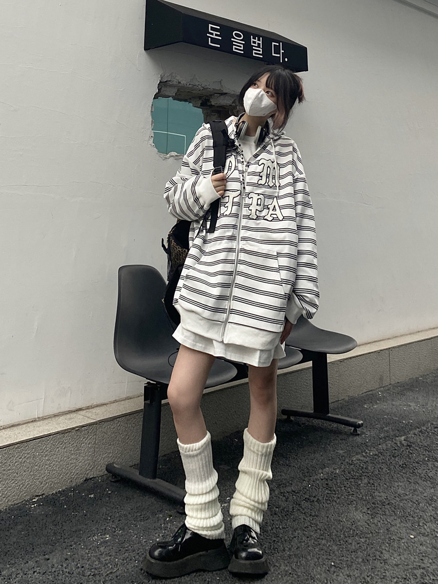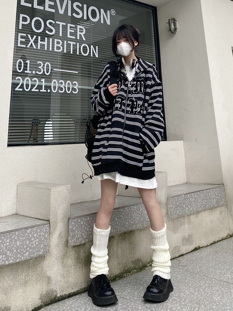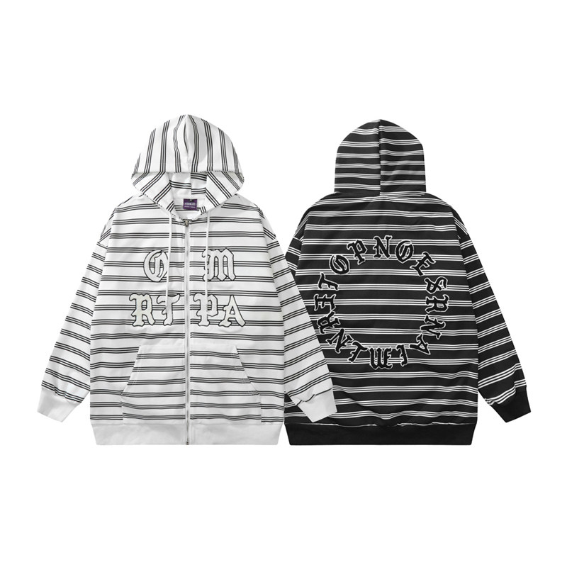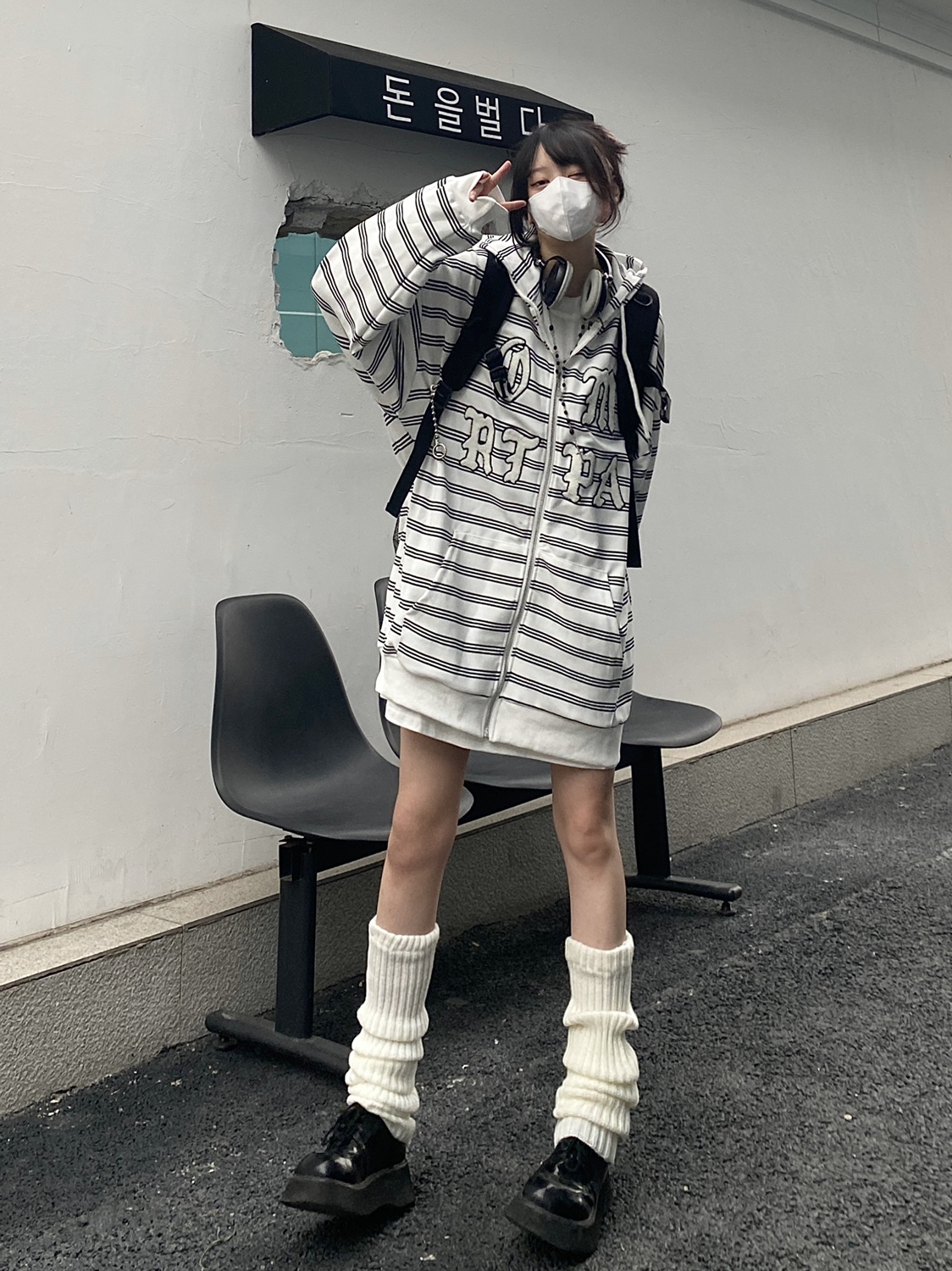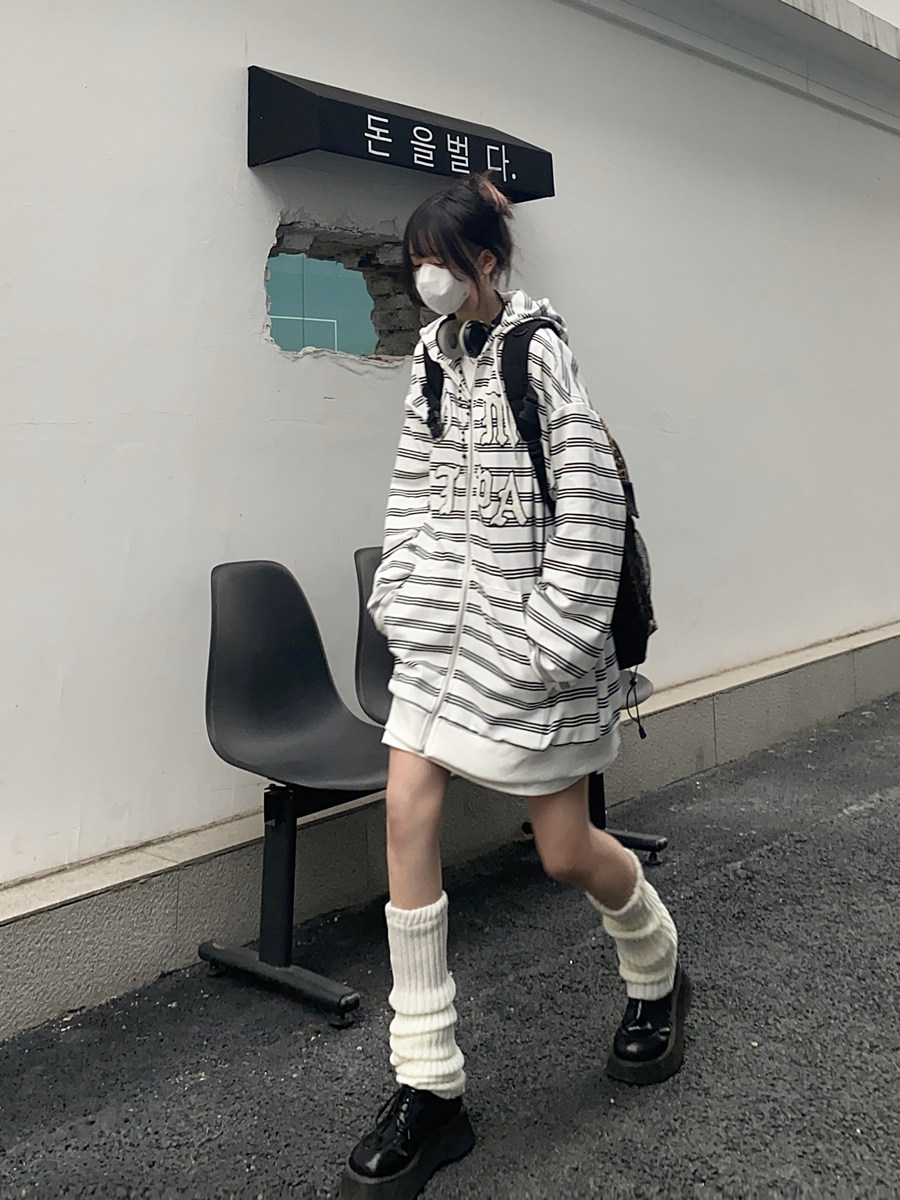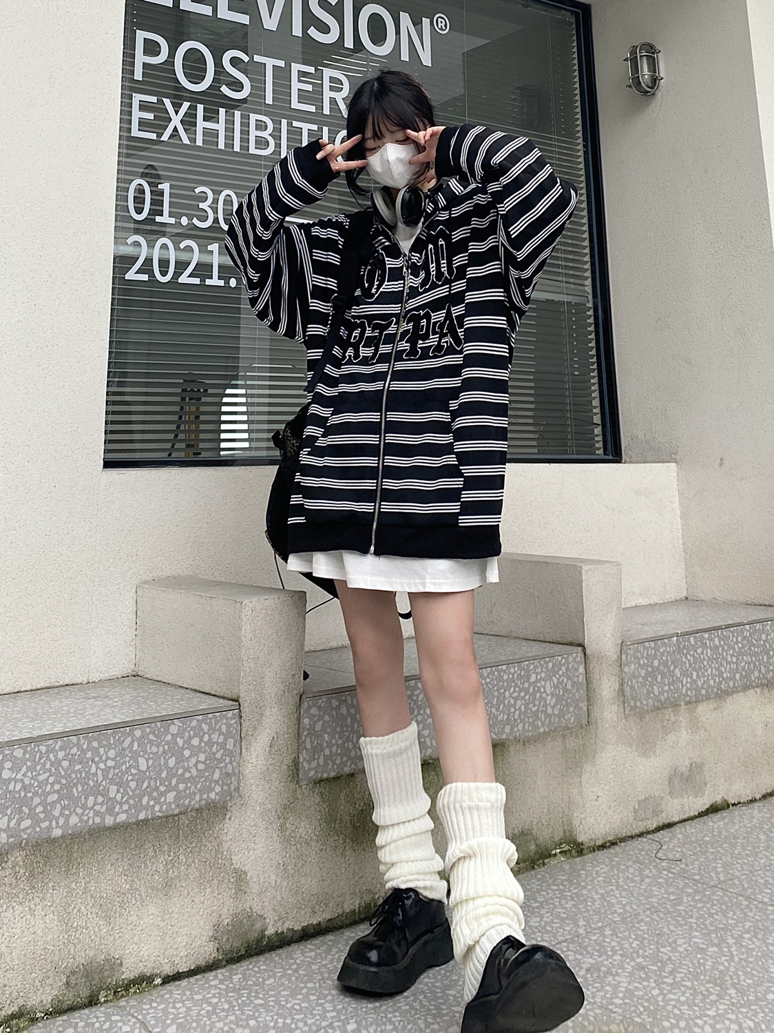 Takeoff咖哩秋新款條紋連帽開衫衛衣短外套寬鬆潮ins街頭情侶bf