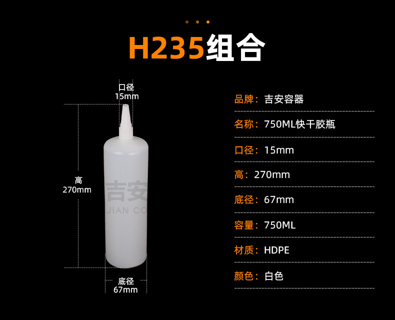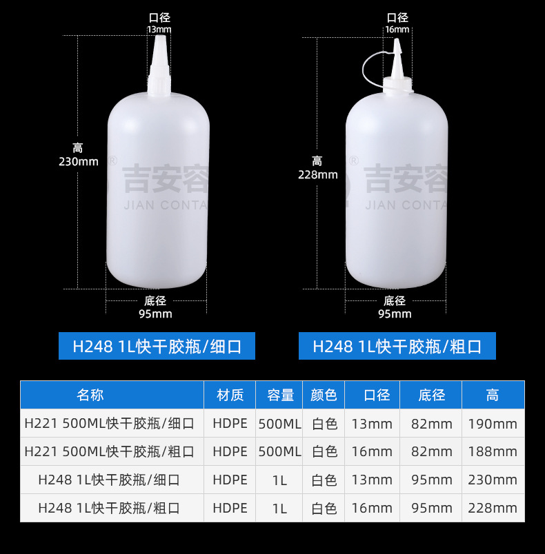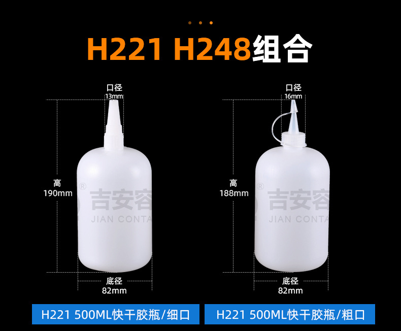 规格 H221 500ML快干胶瓶(粗口),H248 1L快干胶瓶(粗口),H221 500ML快干胶瓶(细口),H248 1L快干胶瓶(细口),H235 750ML快干胶瓶