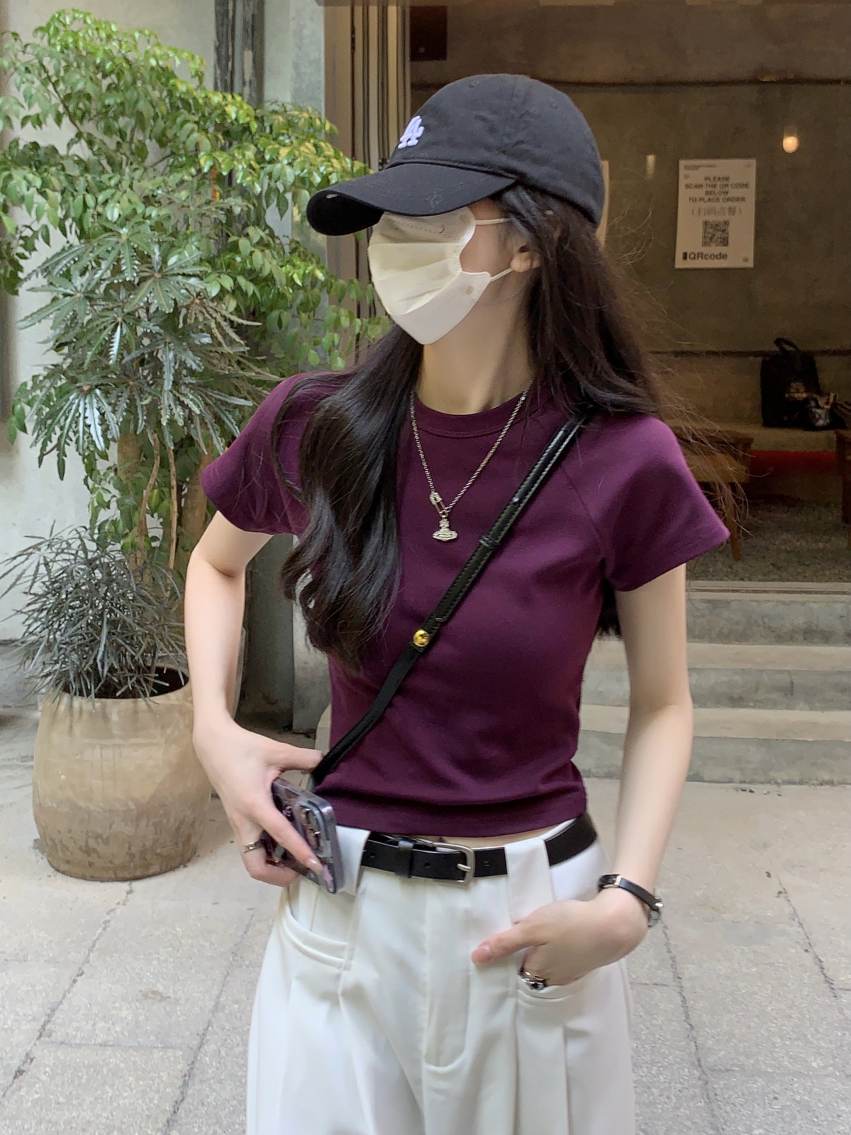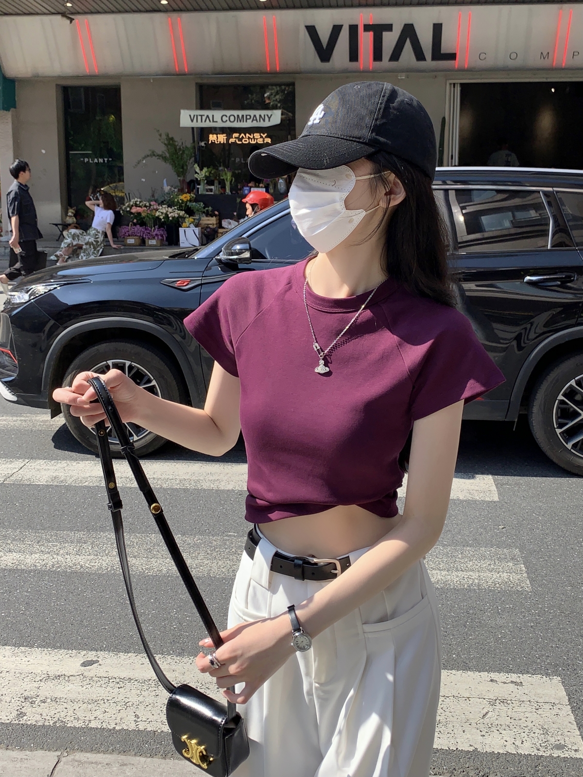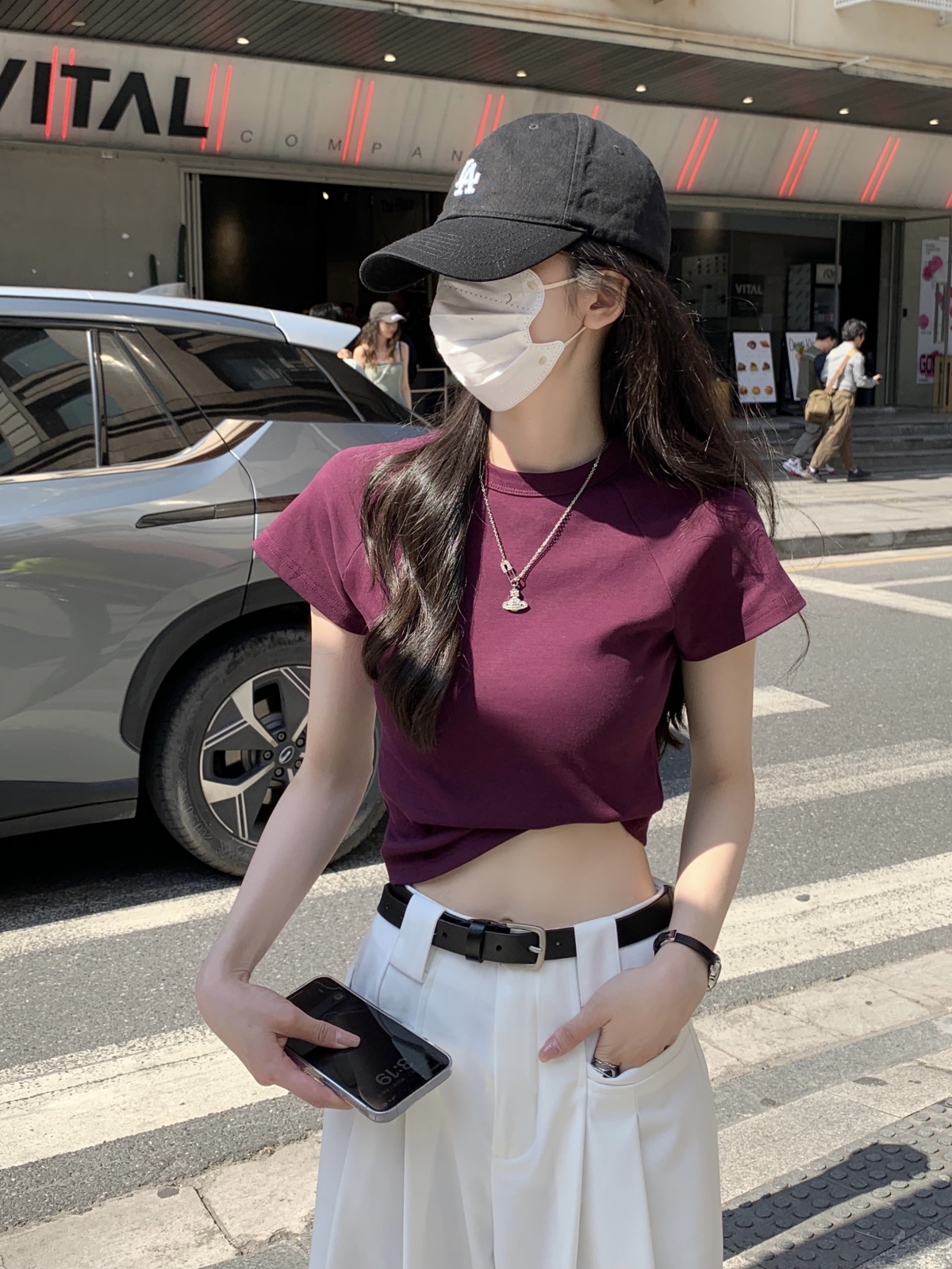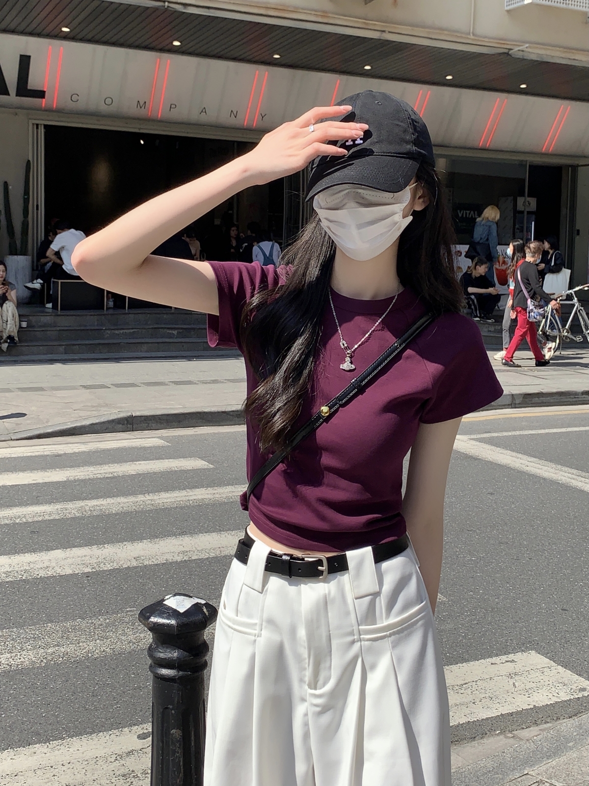 紫色修身短袖正肩T恤女2023新款夏季設計感小眾辣妹短款顯瘦上衣