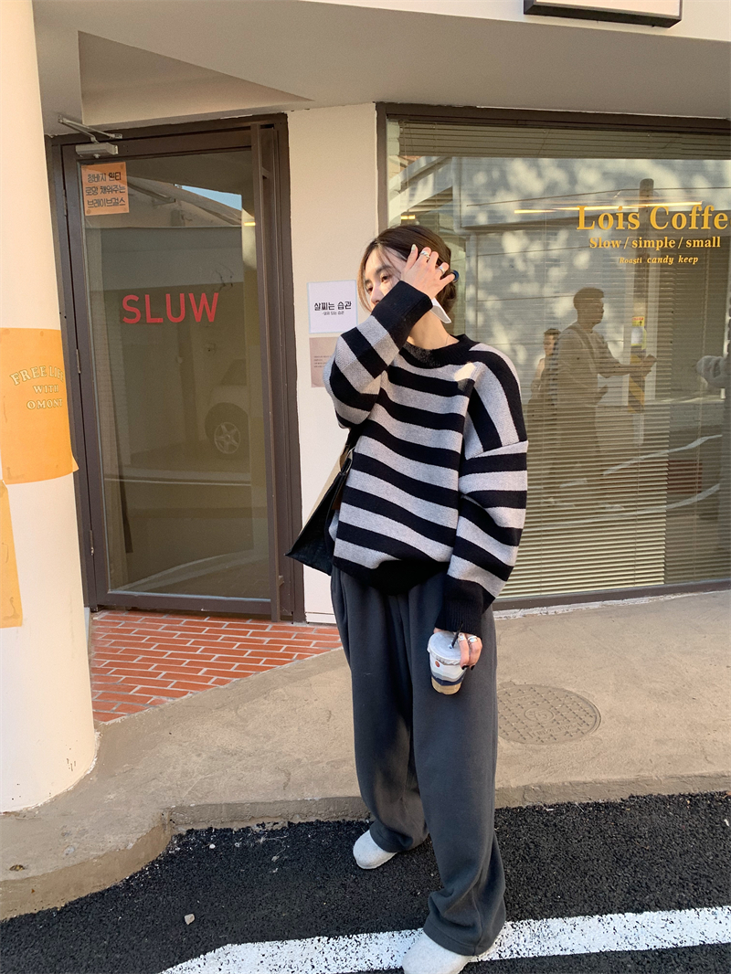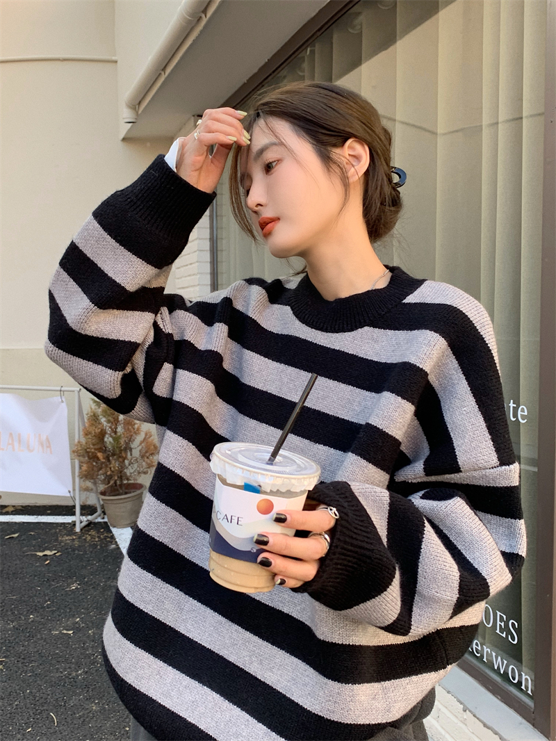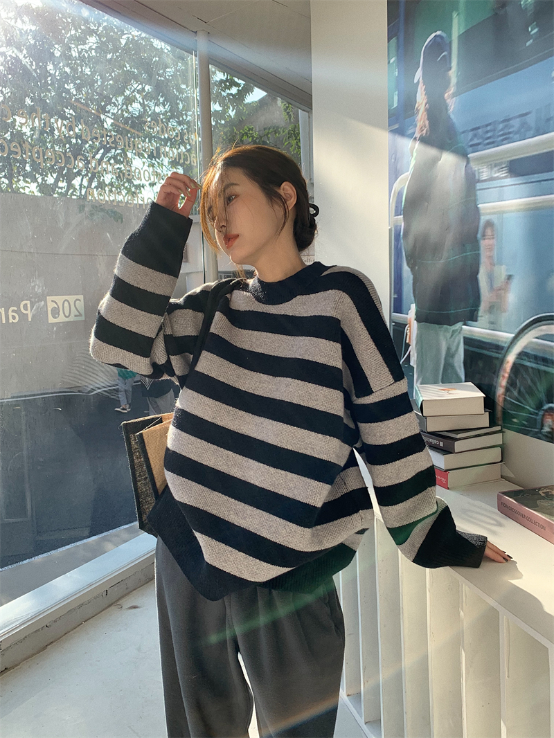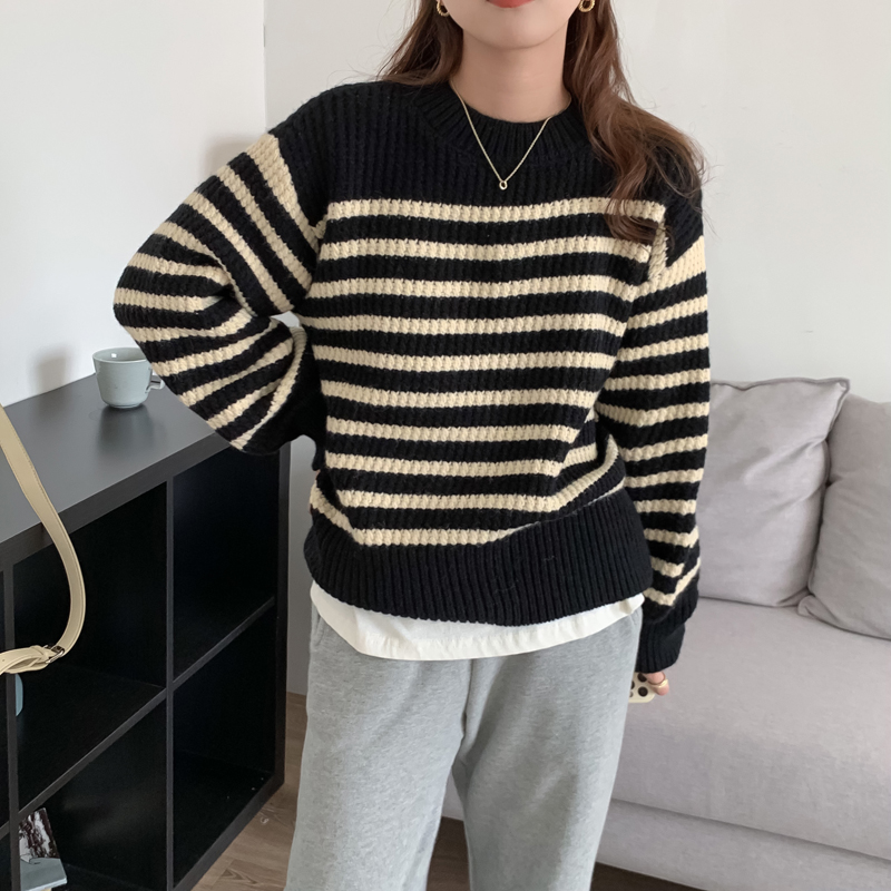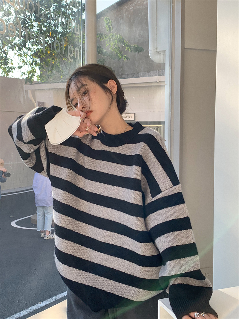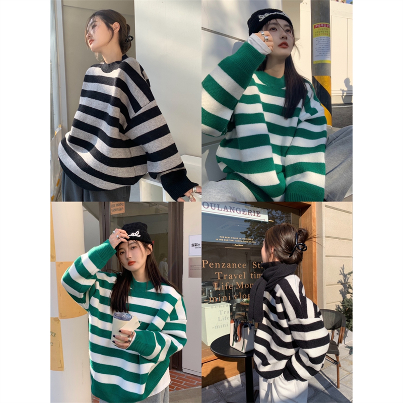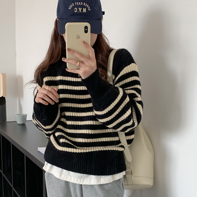 韓系chic條紋毛衣女秋冬外穿加厚圓領套頭慵懶風寬鬆長袖針織衫潮