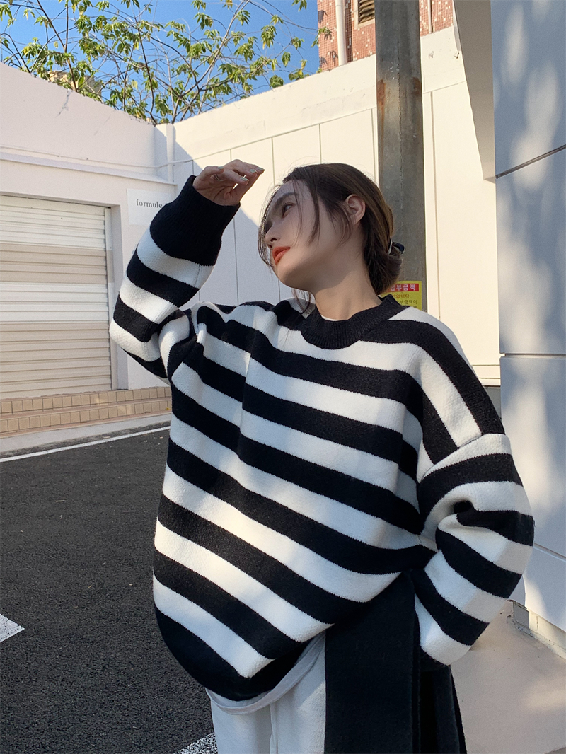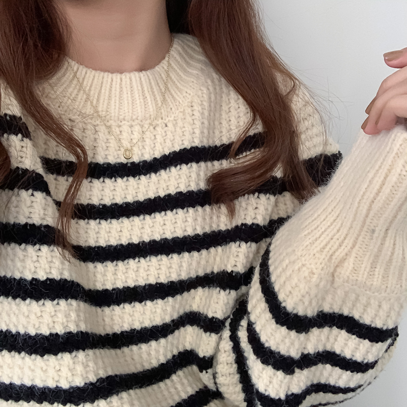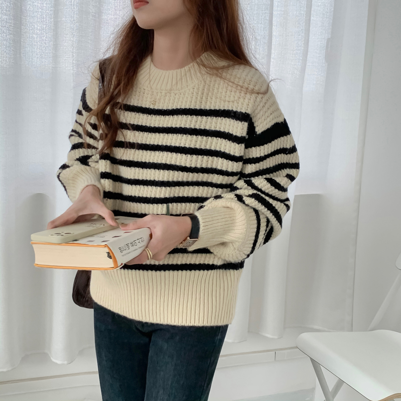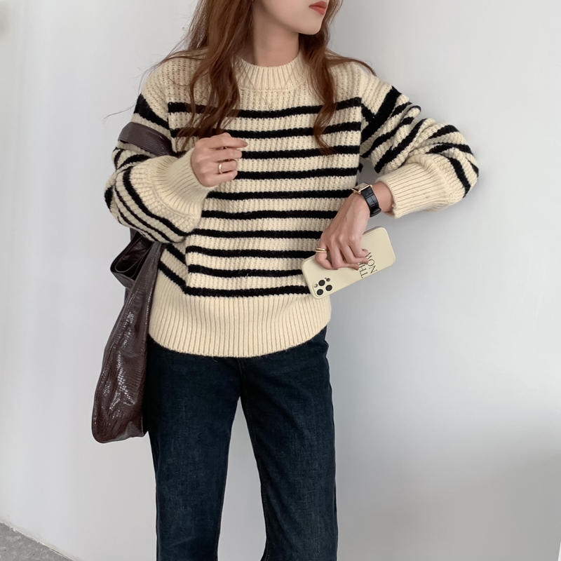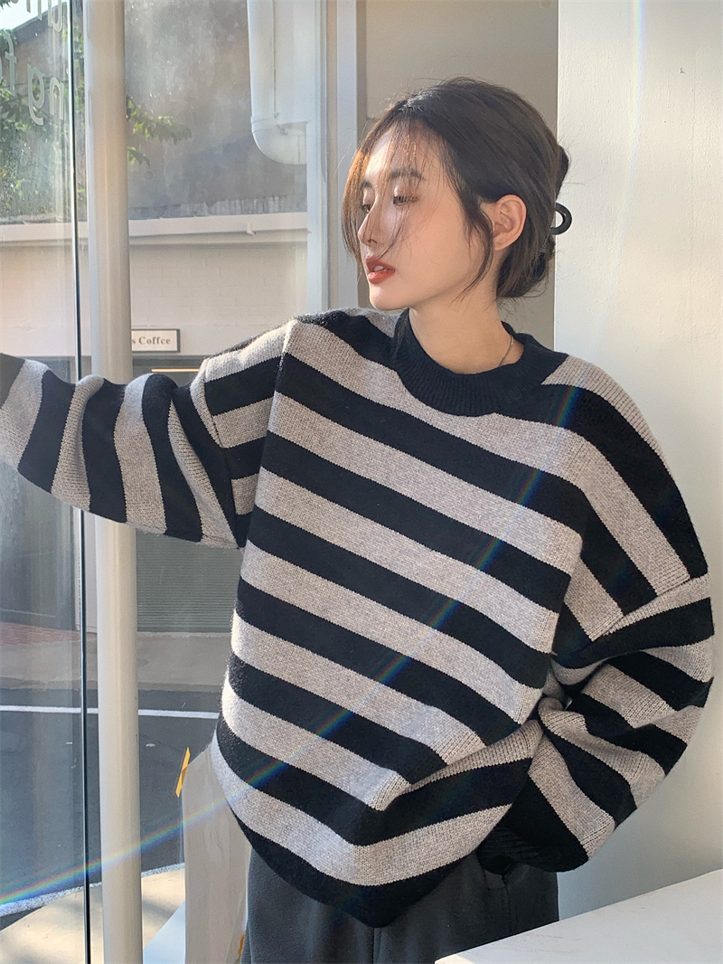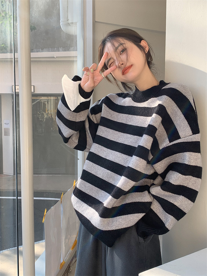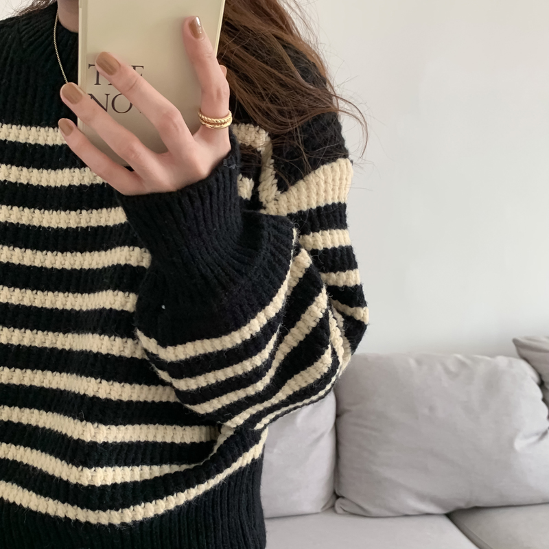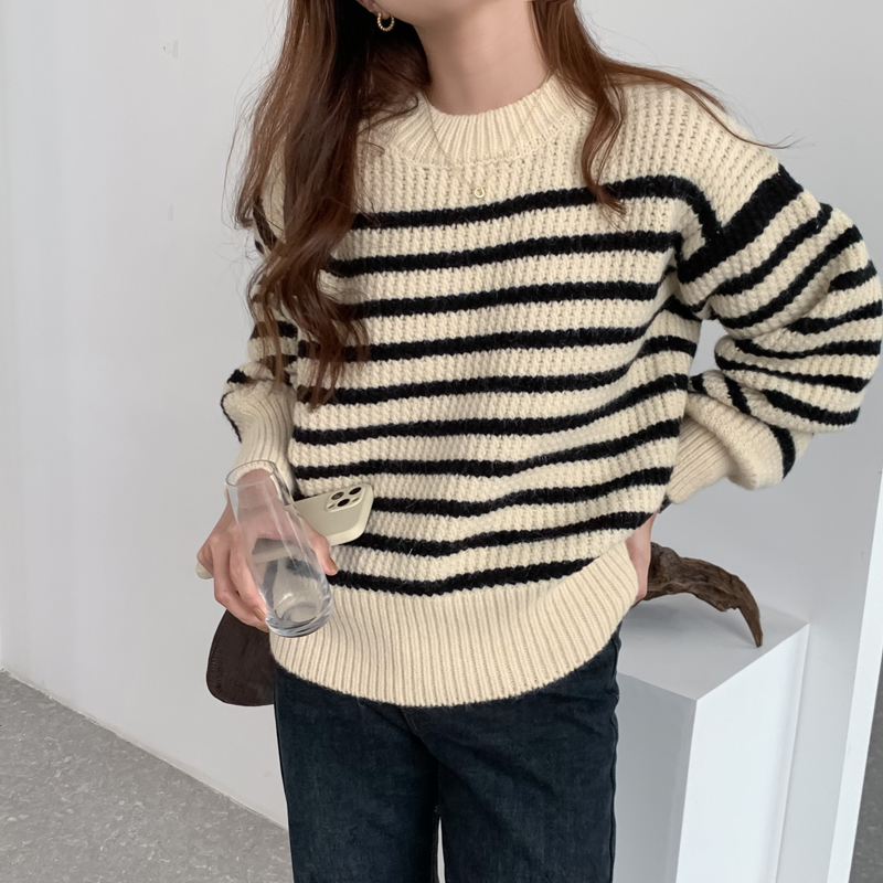 韓系chic條紋毛衣女秋冬外穿加厚圓領套頭慵懶風寬鬆長袖針織衫潮