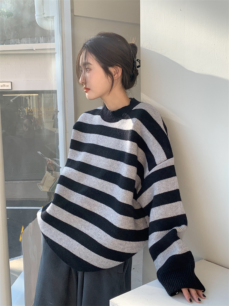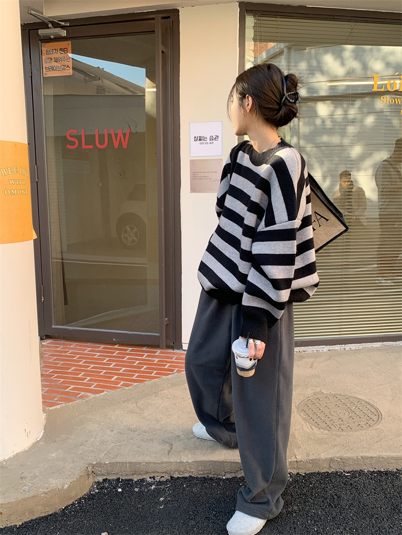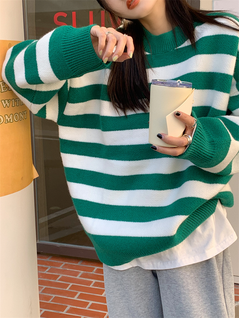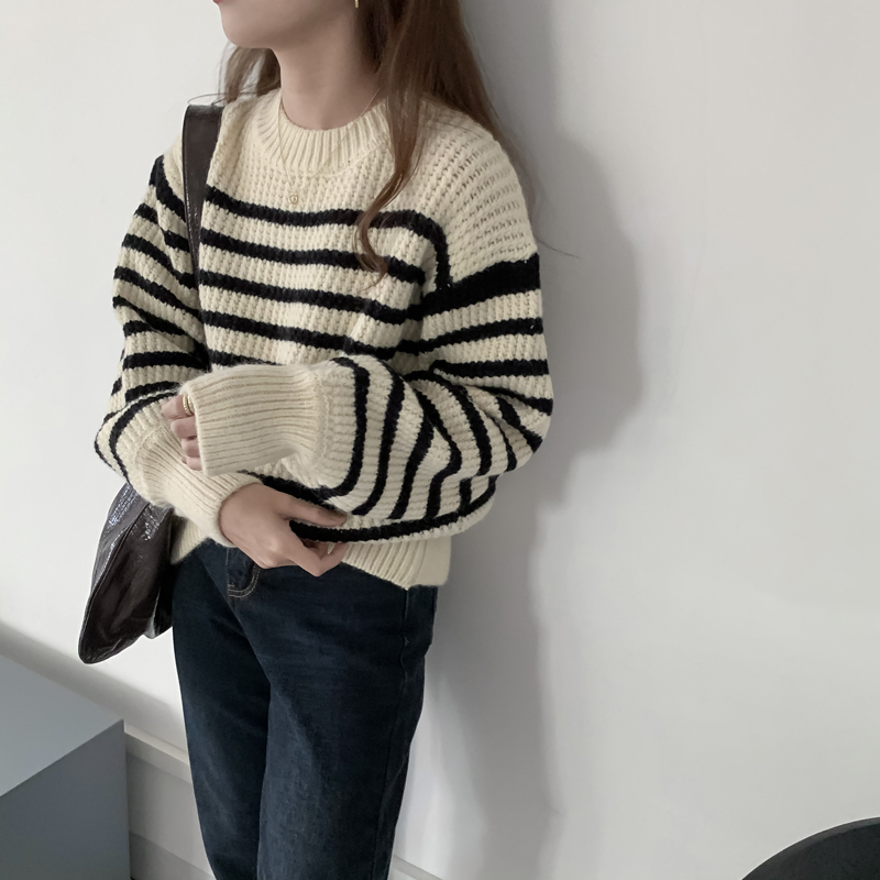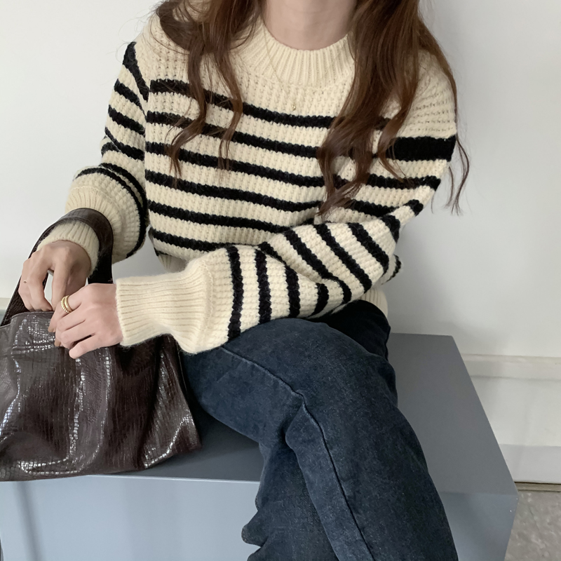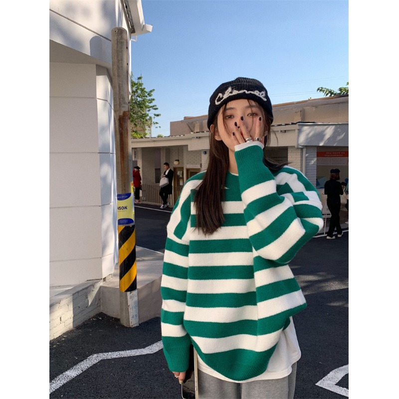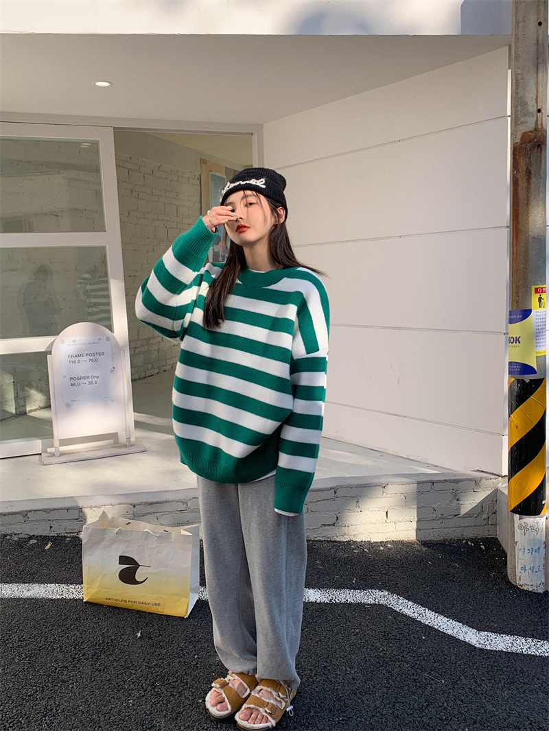 韓系chic條紋毛衣女秋冬外穿加厚圓領套頭慵懶風寬鬆長袖針織衫潮