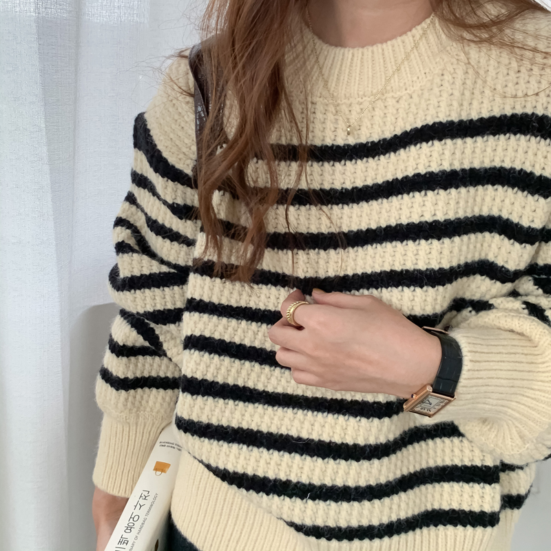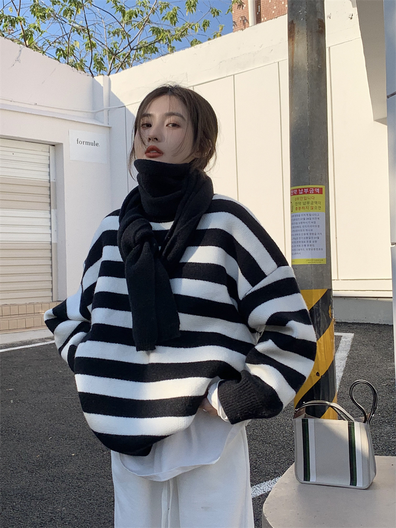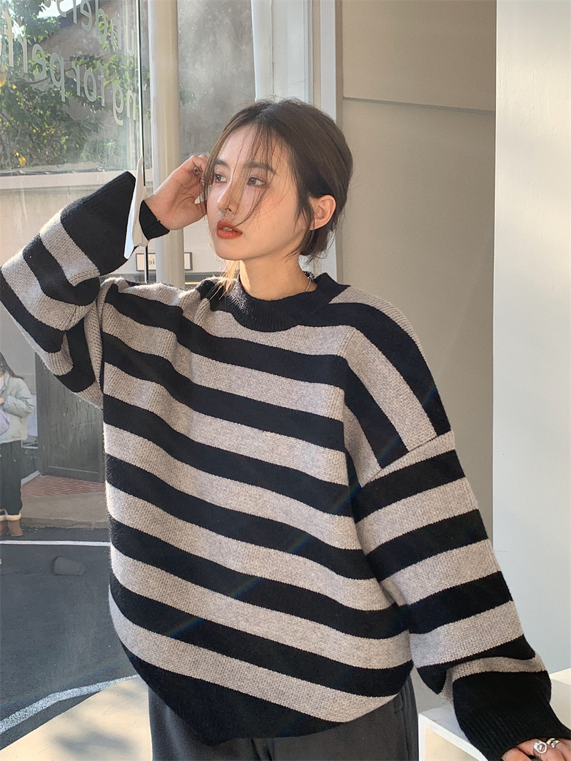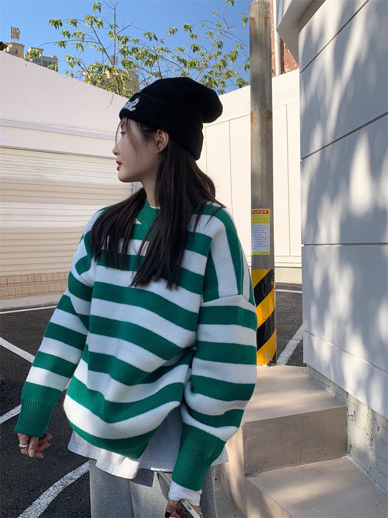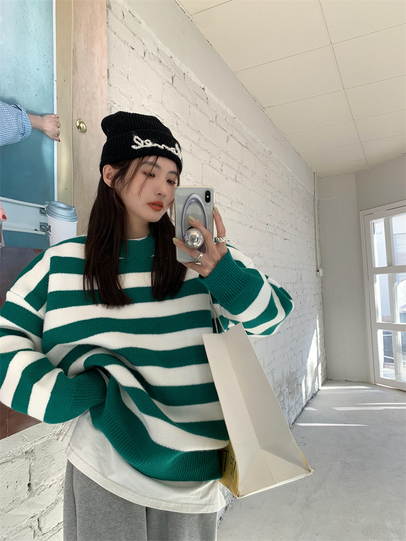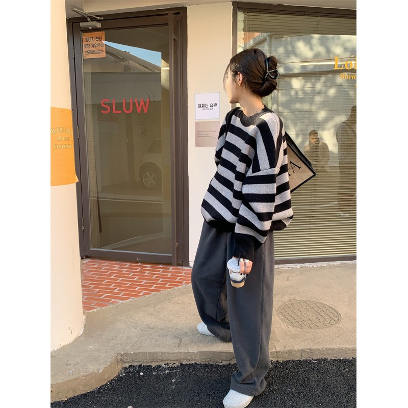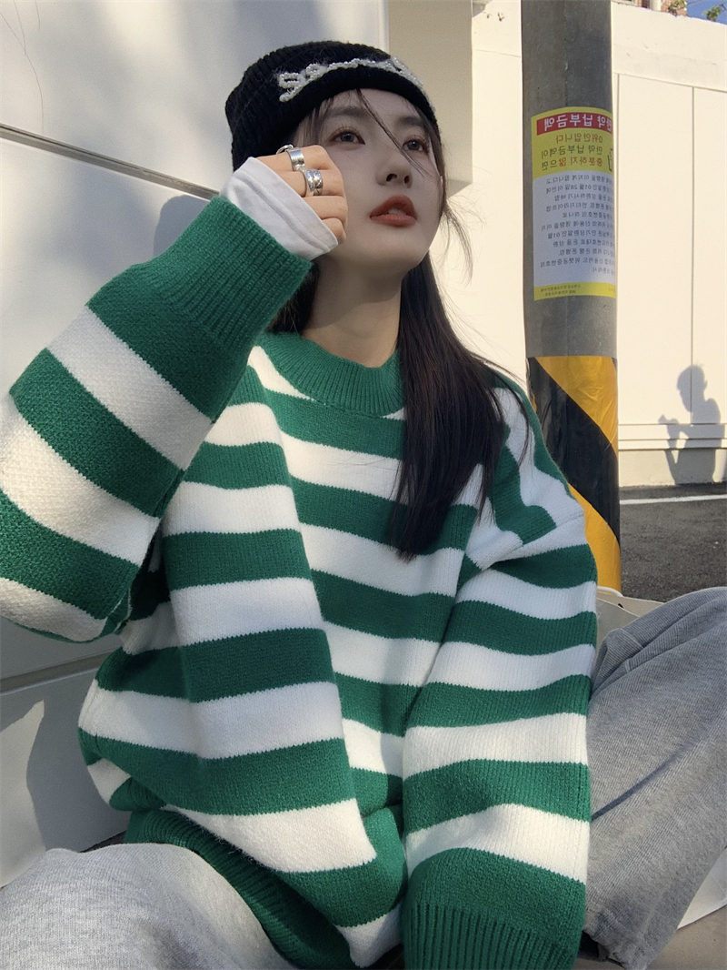 韓系chic條紋毛衣女秋冬外穿加厚圓領套頭慵懶風寬鬆長袖針織衫潮