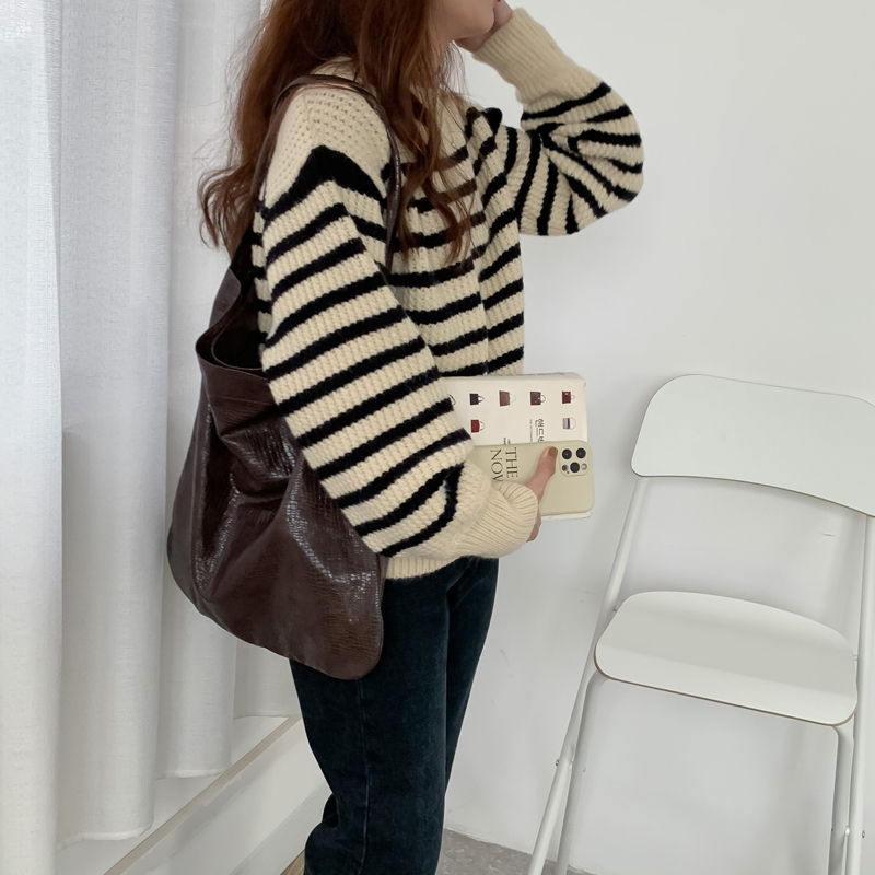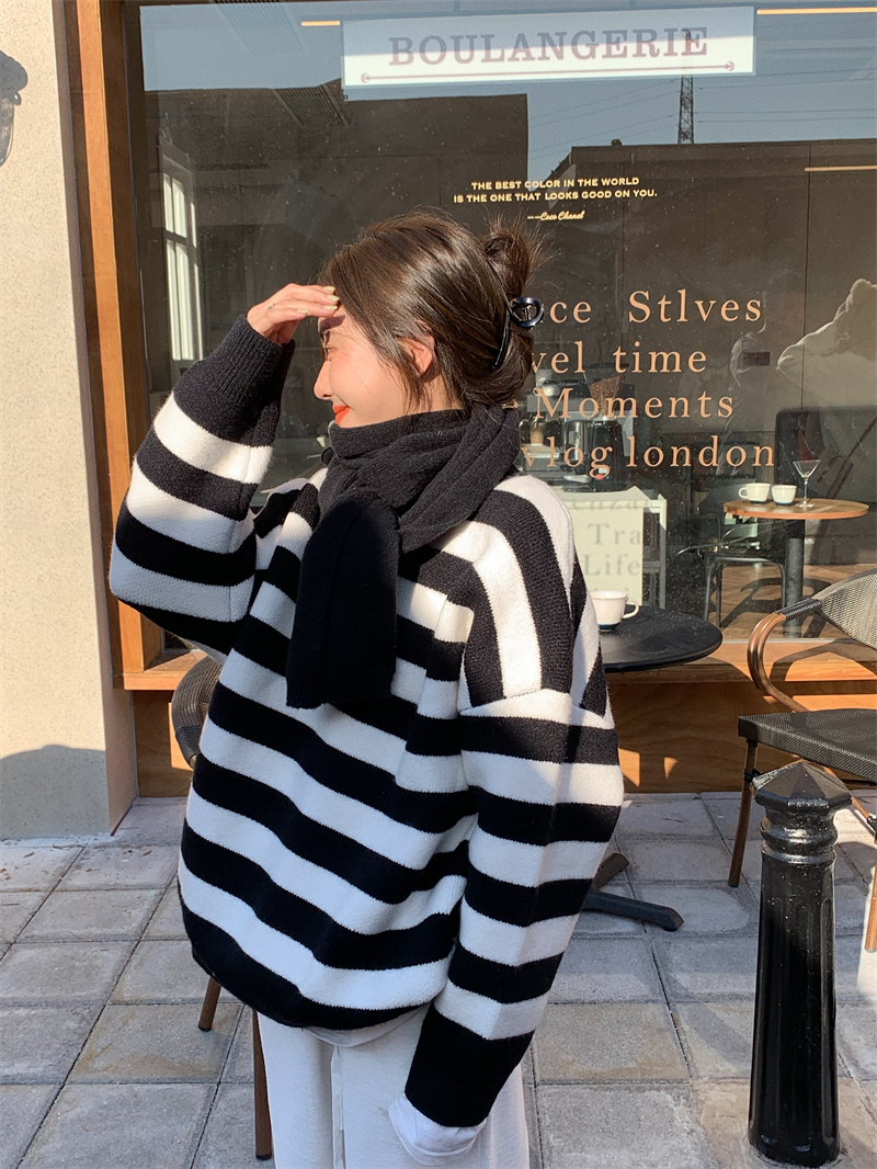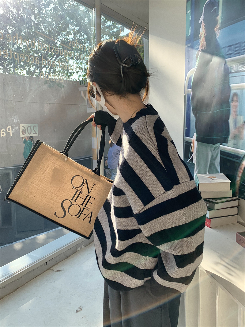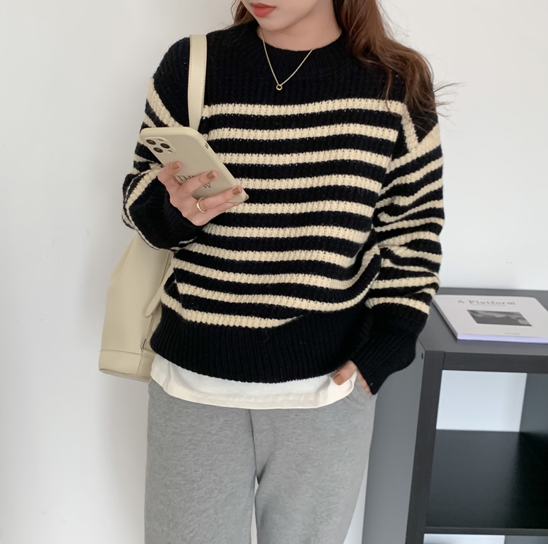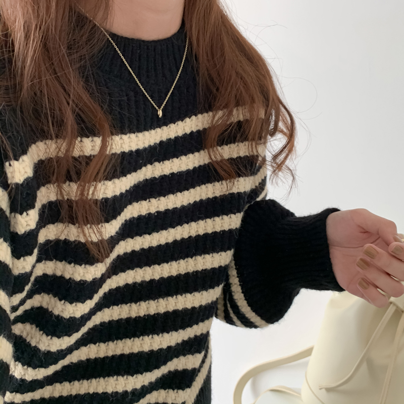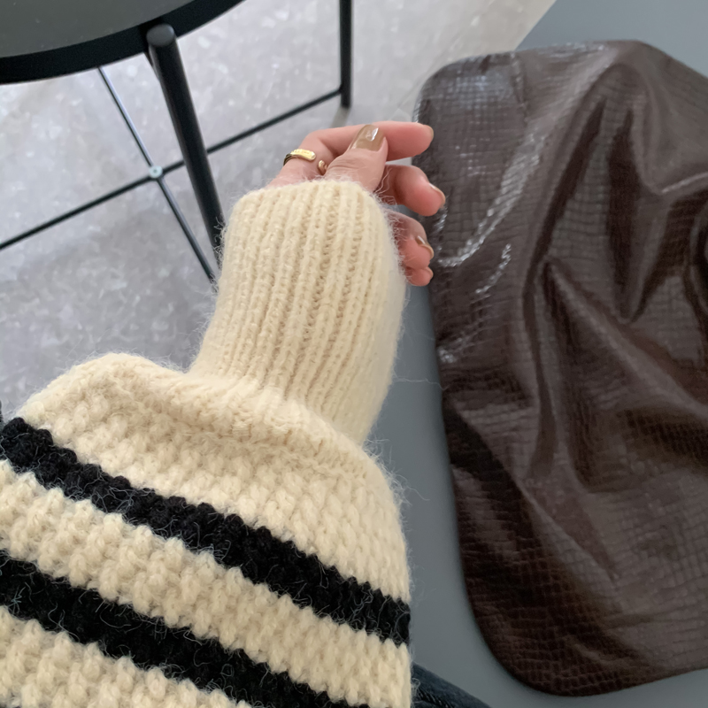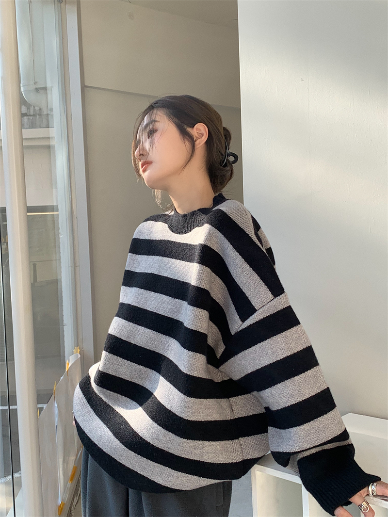 韓系chic條紋毛衣女秋冬外穿加厚圓領套頭慵懶風寬鬆長袖針織衫潮