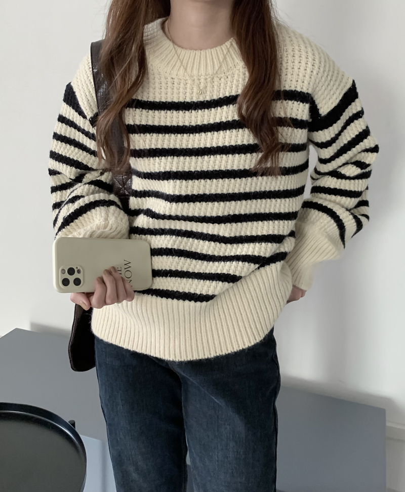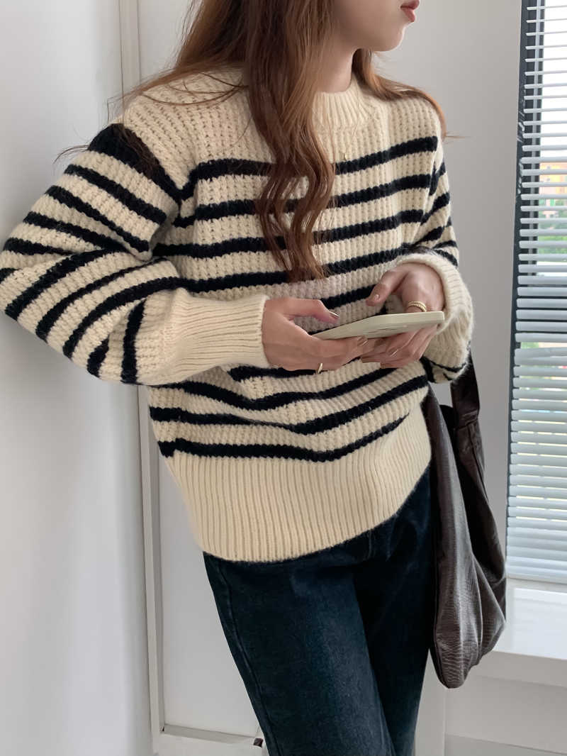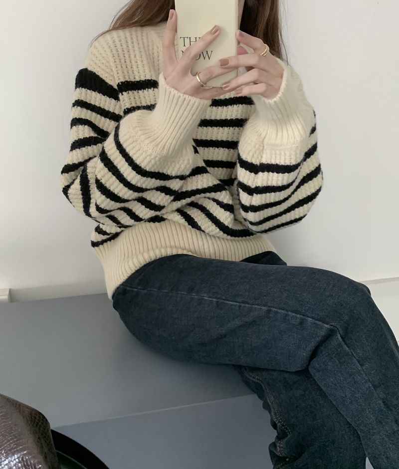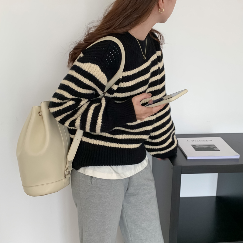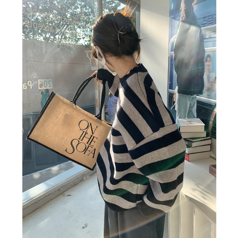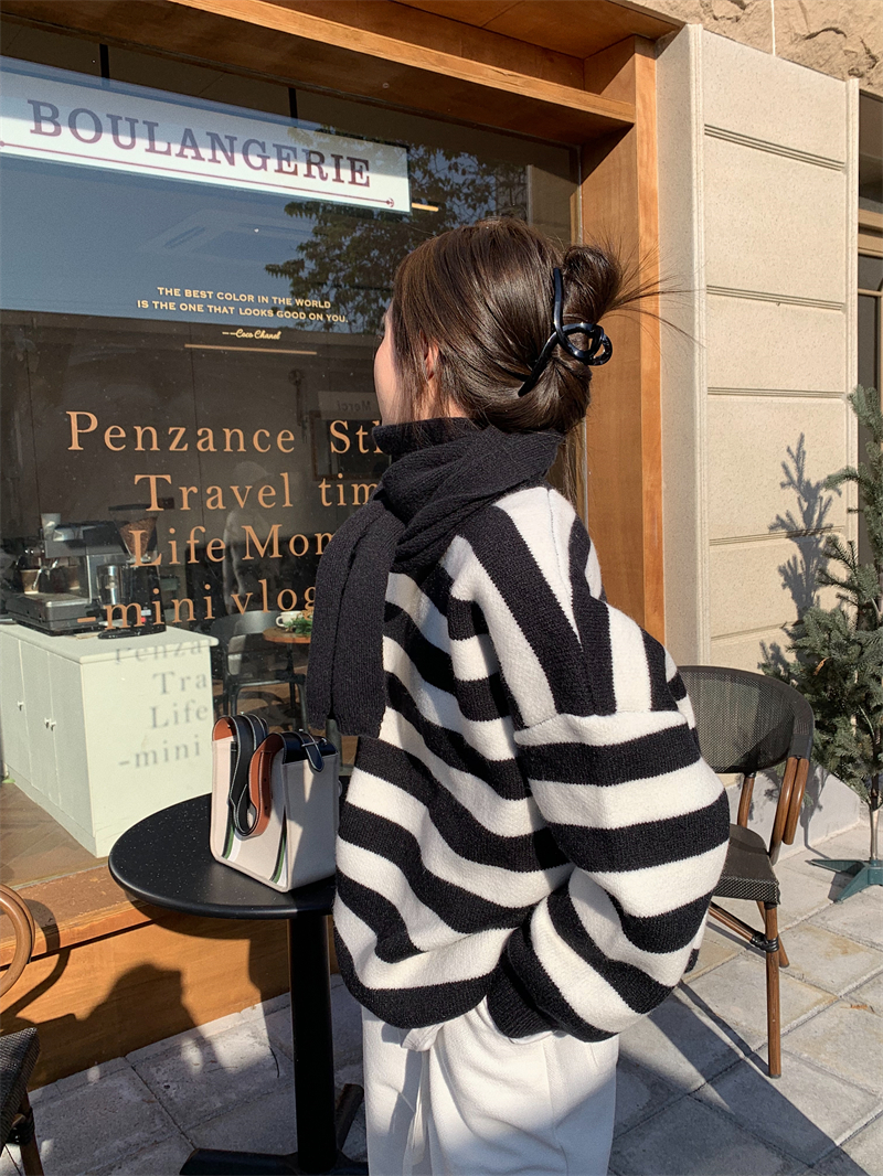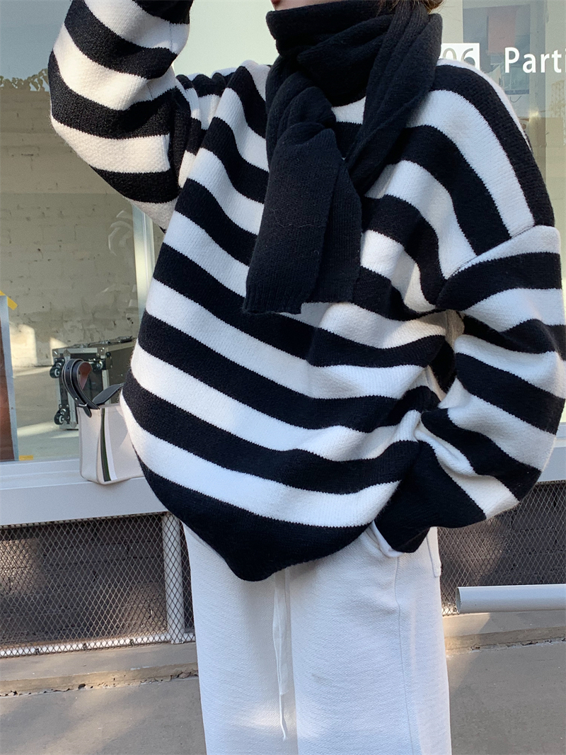 韓系chic條紋毛衣女秋冬外穿加厚圓領套頭慵懶風寬鬆長袖針織衫潮