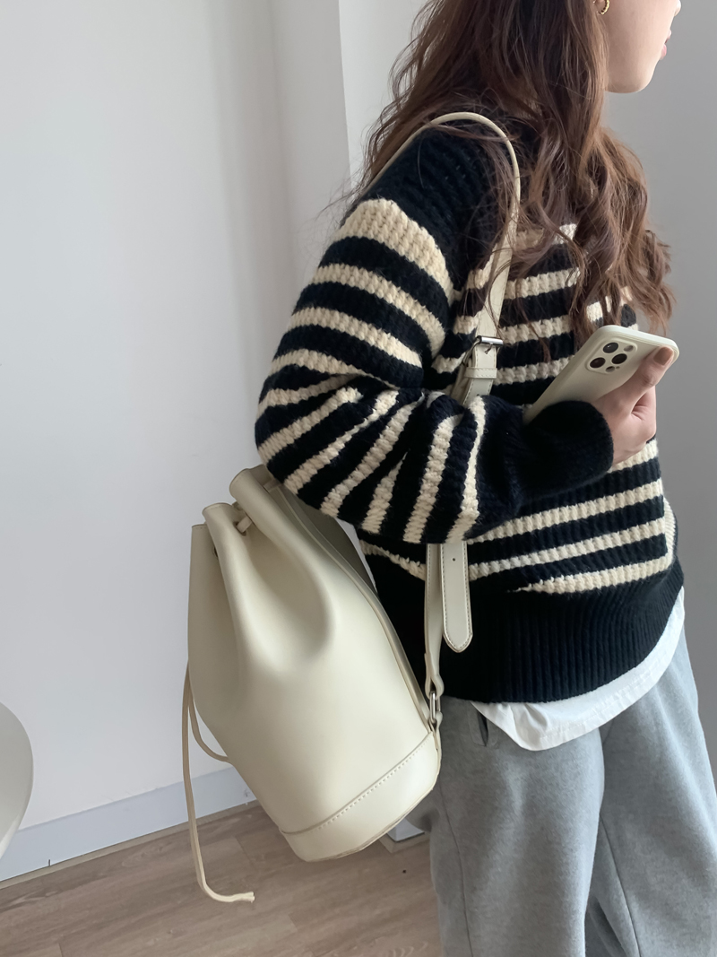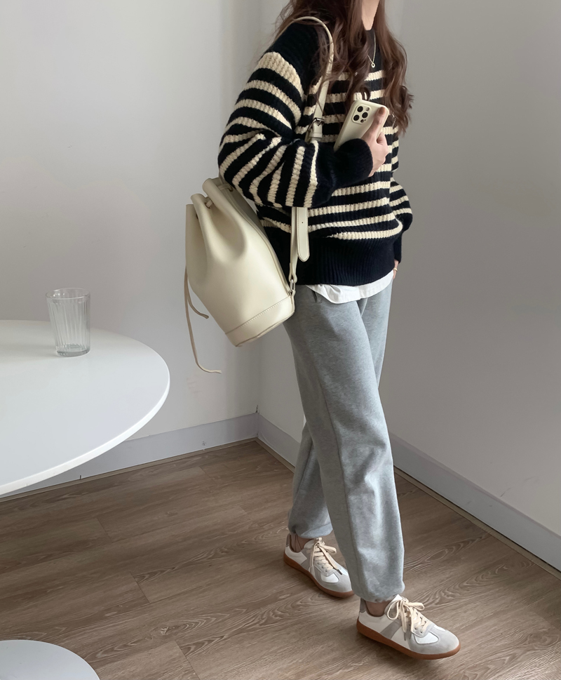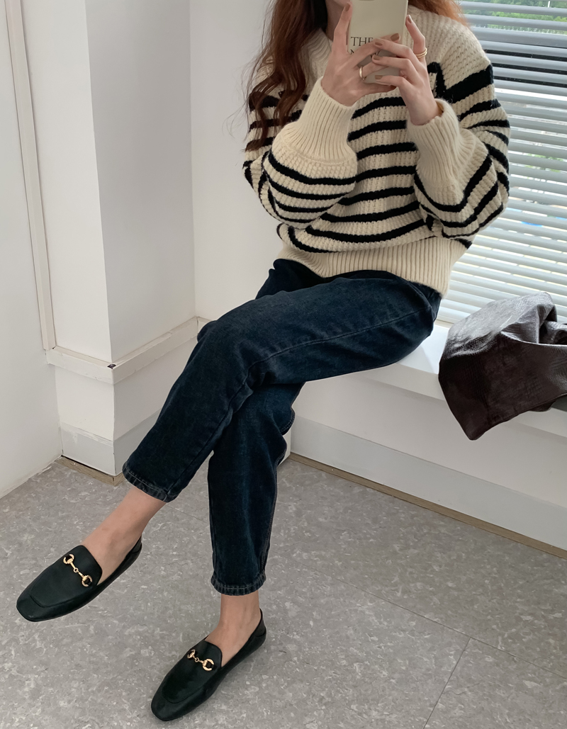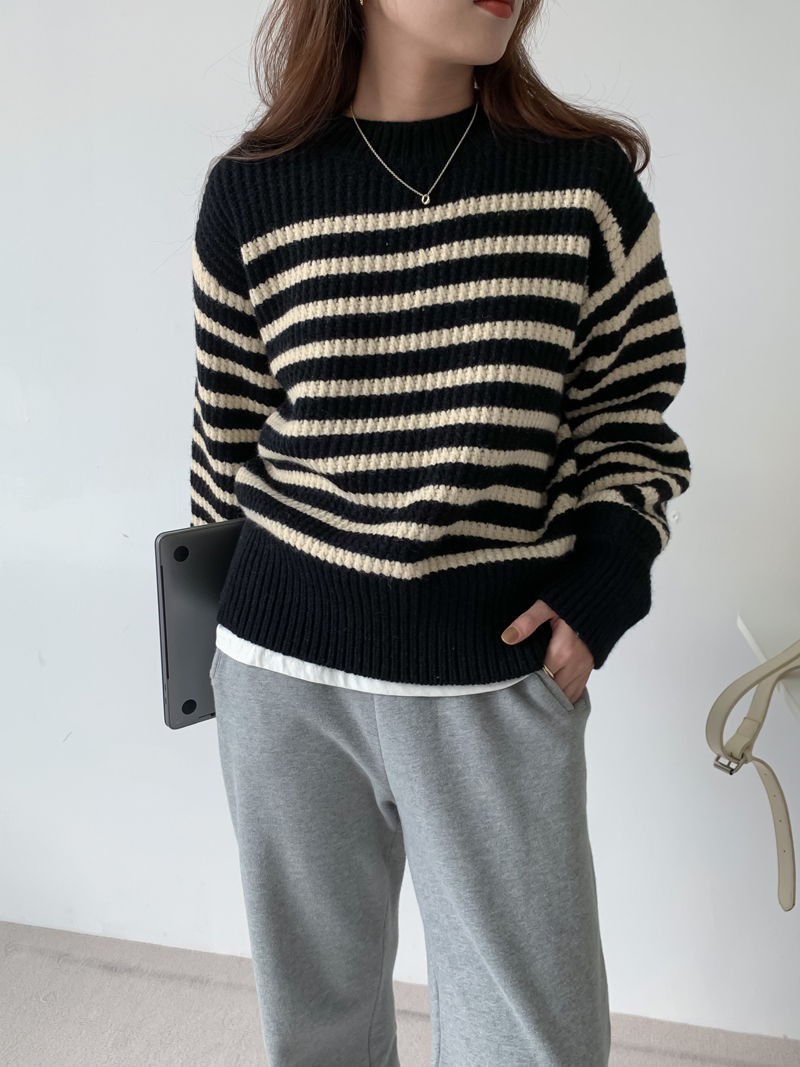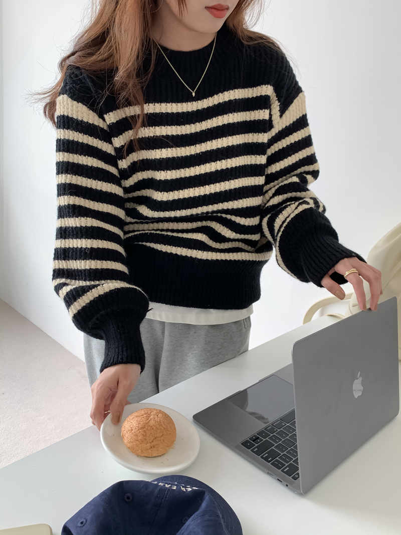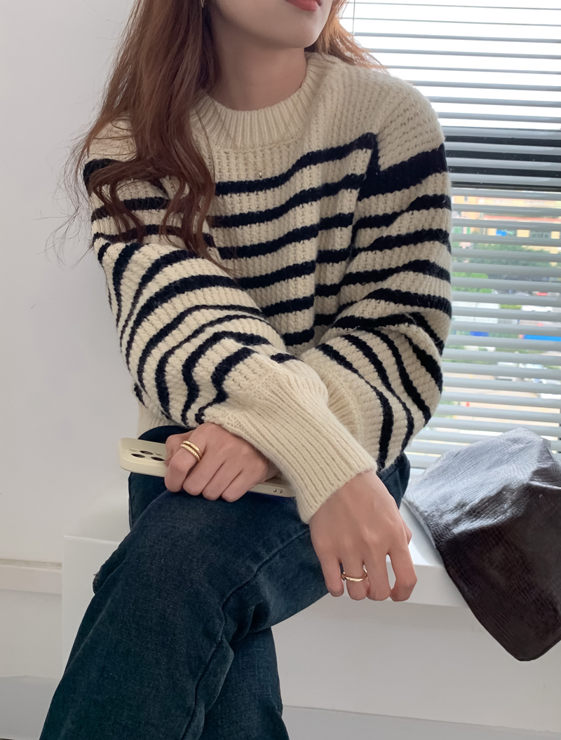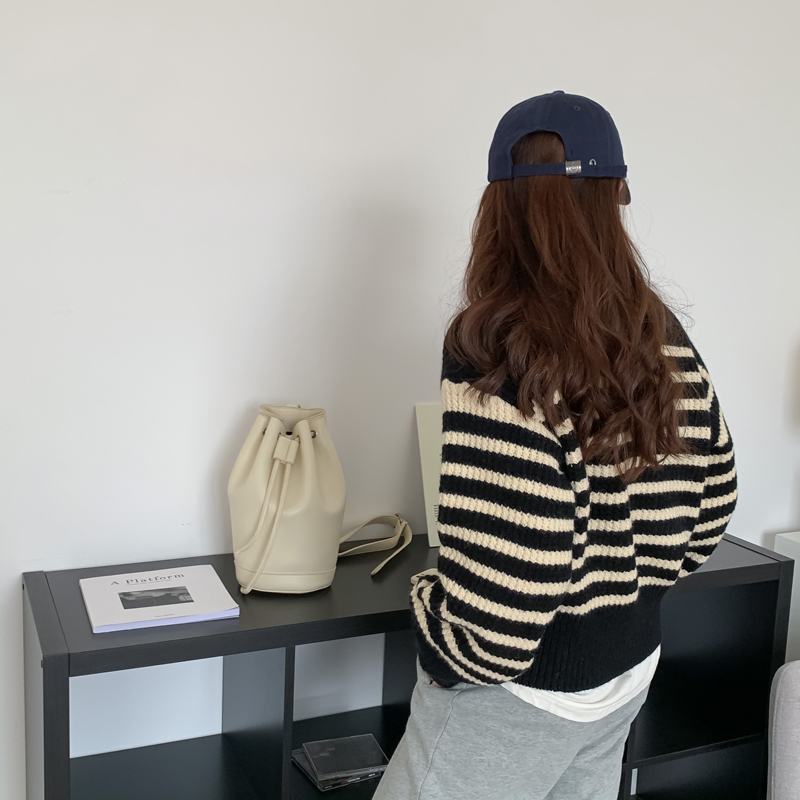 韓系chic條紋毛衣女秋冬外穿加厚圓領套頭慵懶風寬鬆長袖針織衫潮