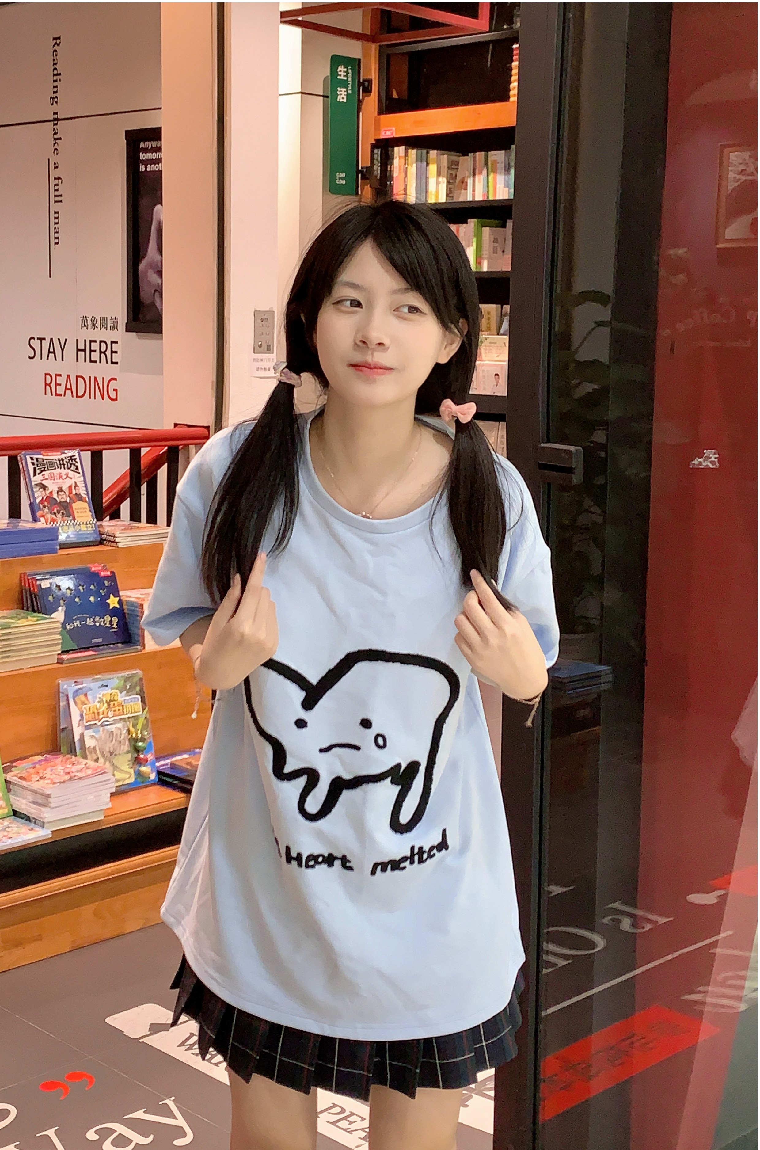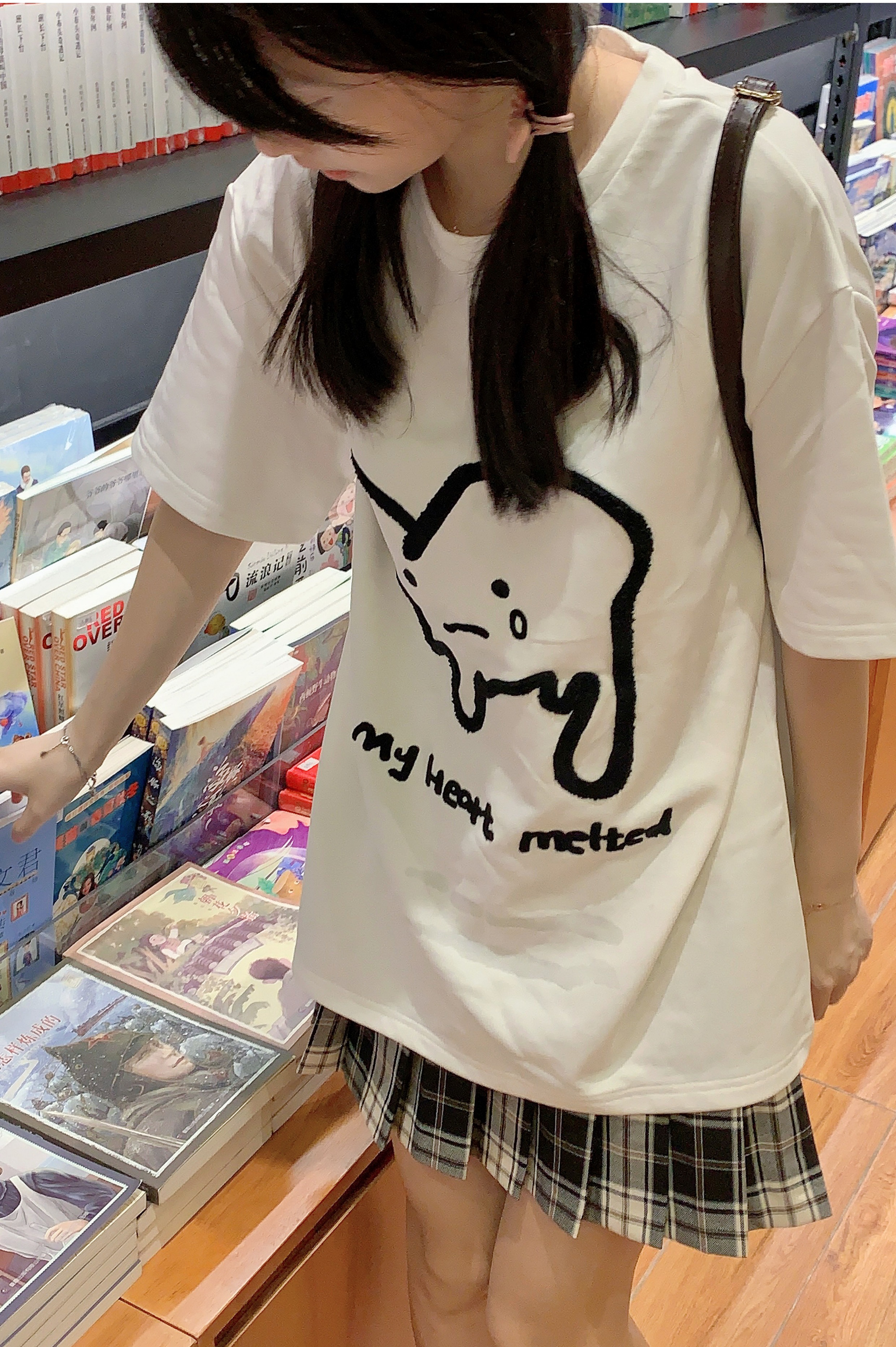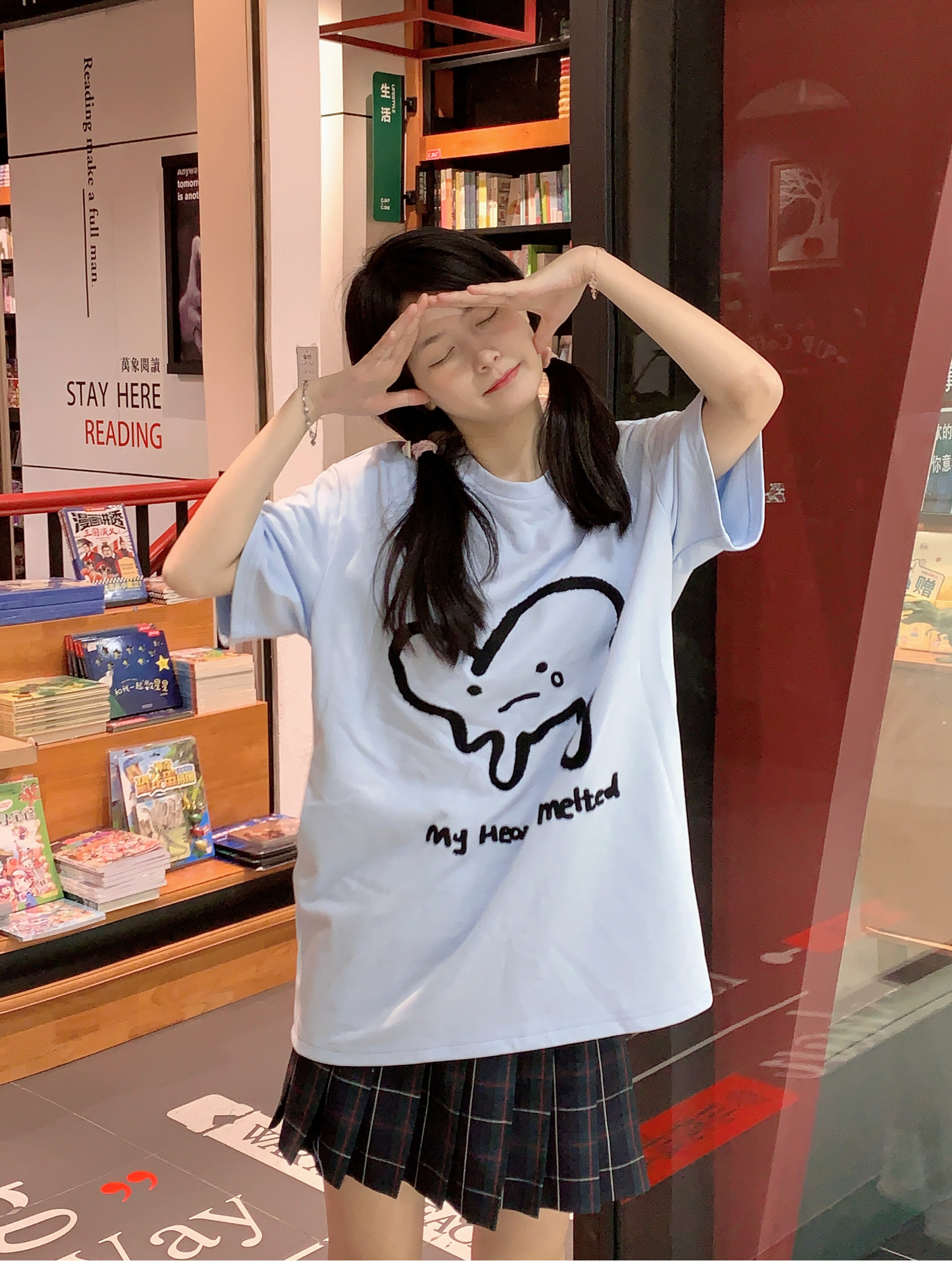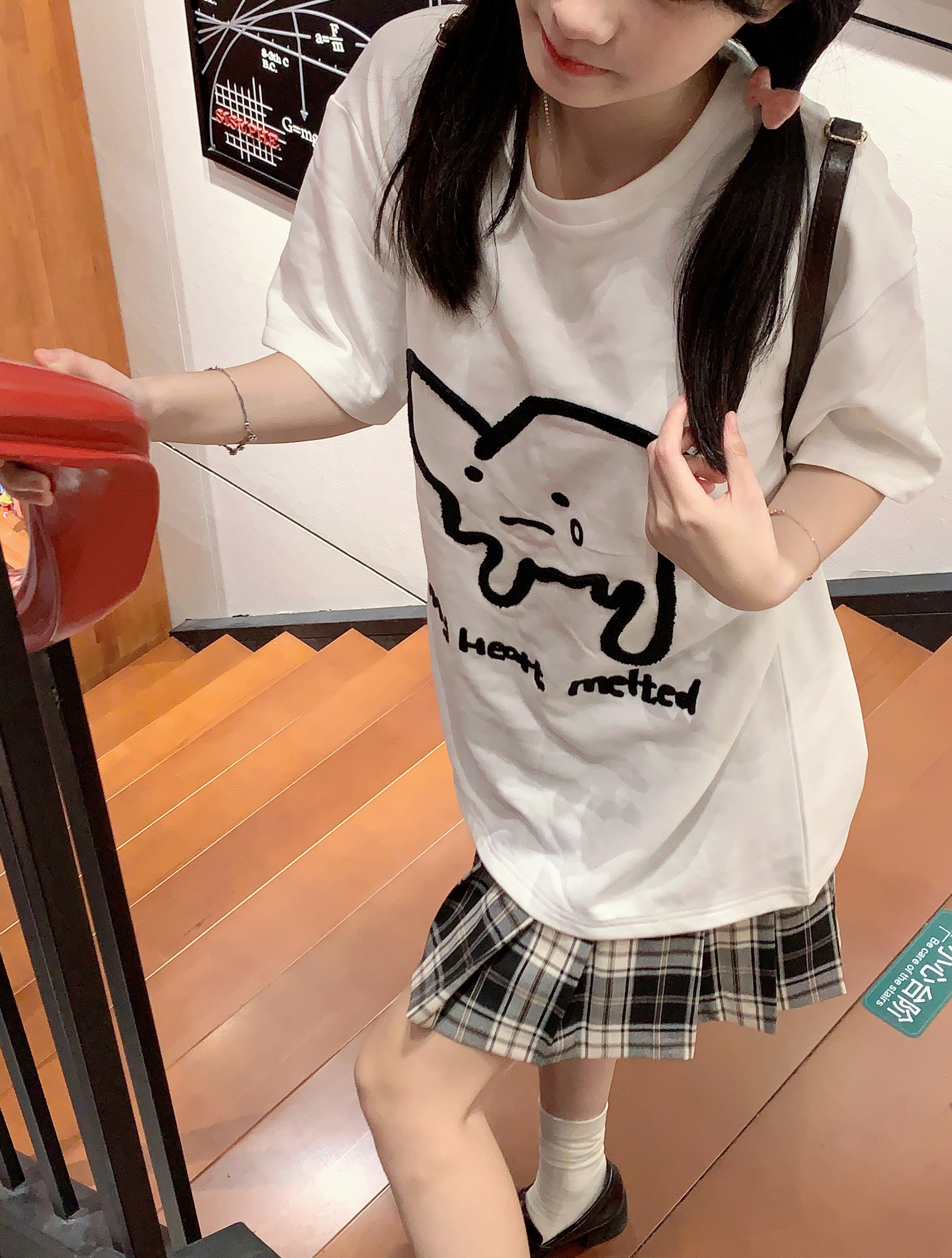 星星抱月球 笑笑原創毛巾繡短袖T恤女夏季寬鬆韓版白色圓領上衣