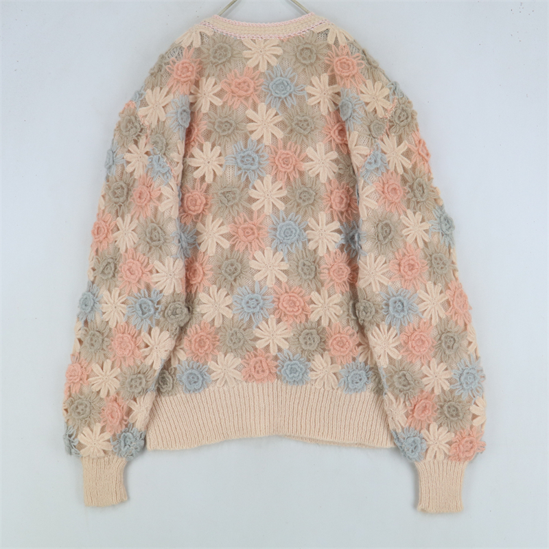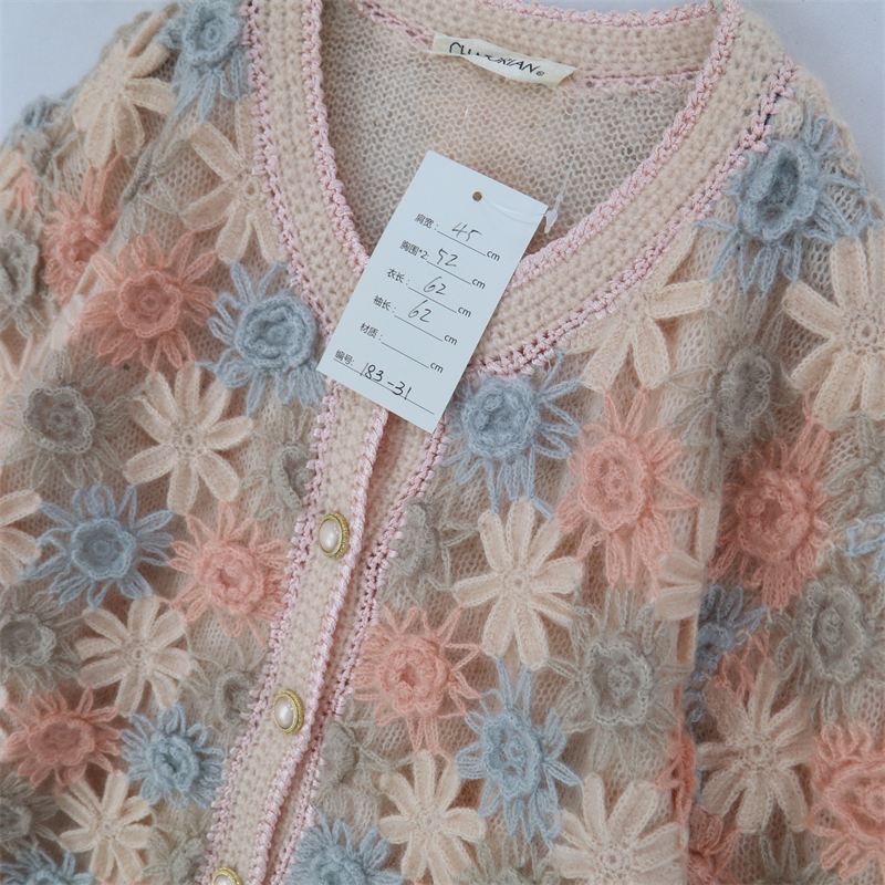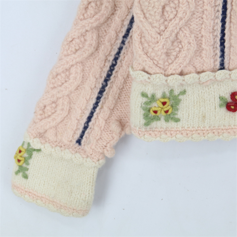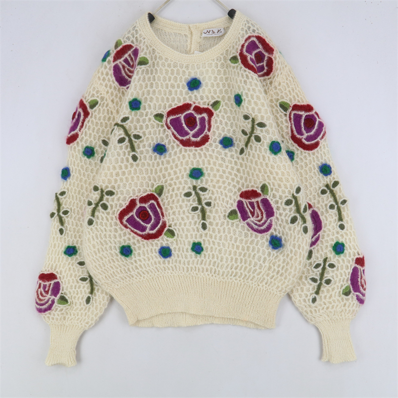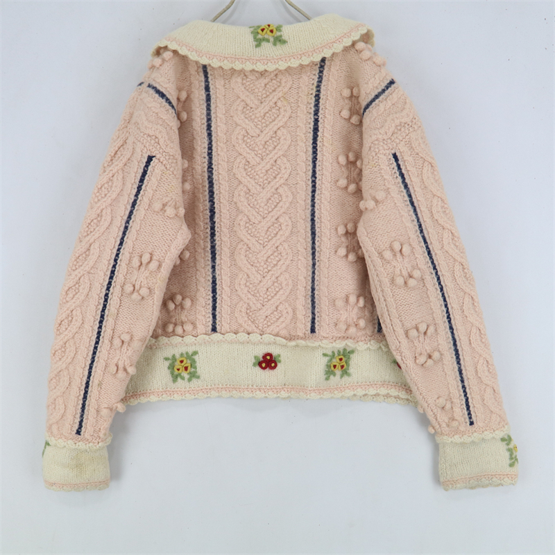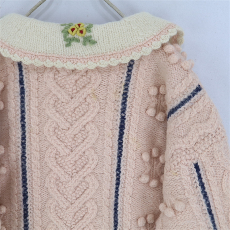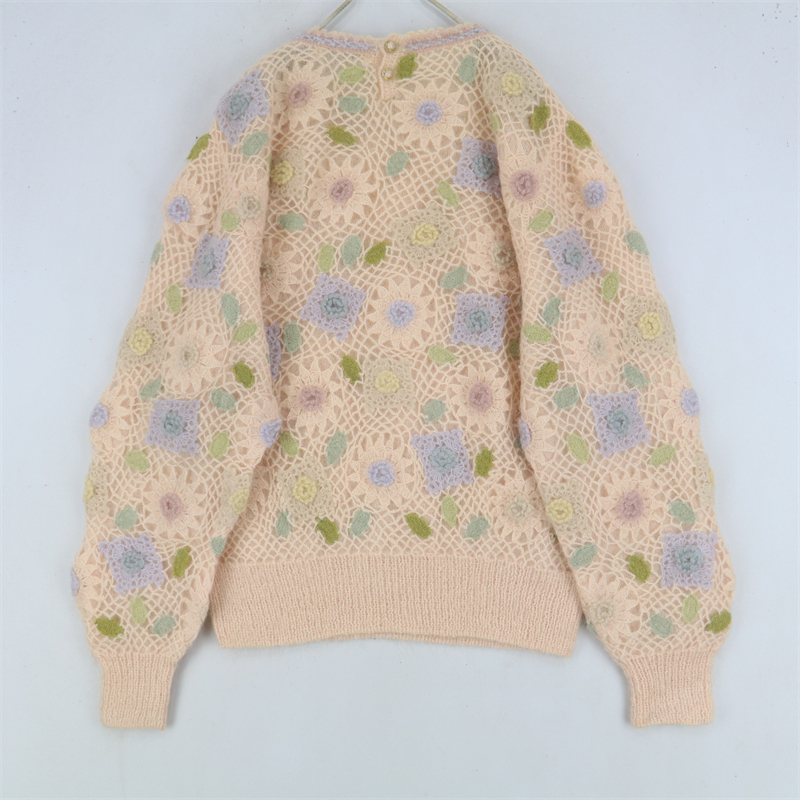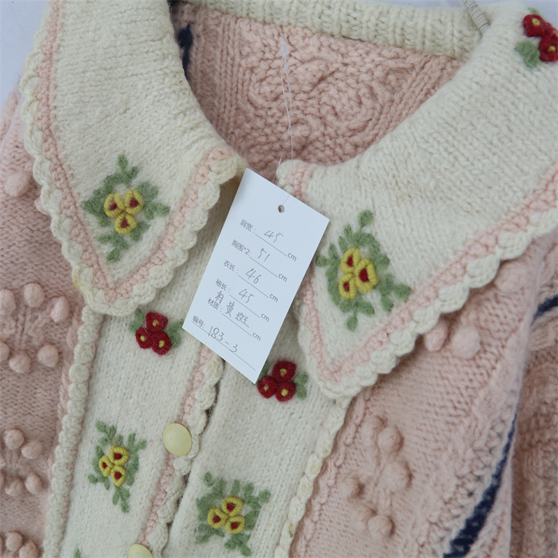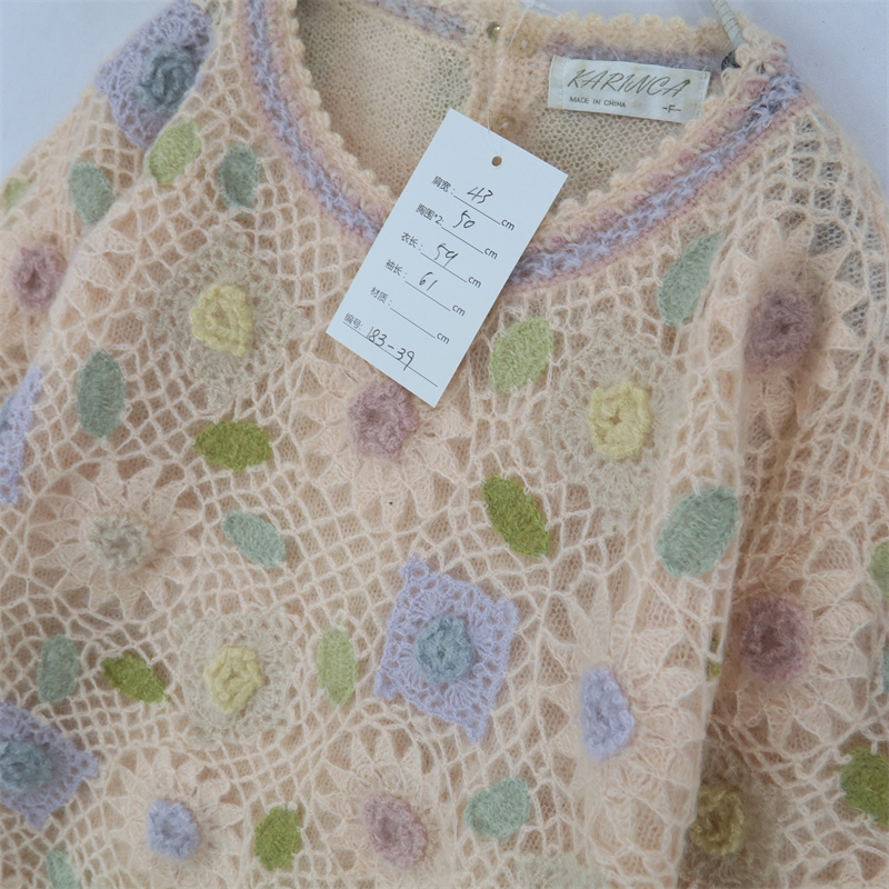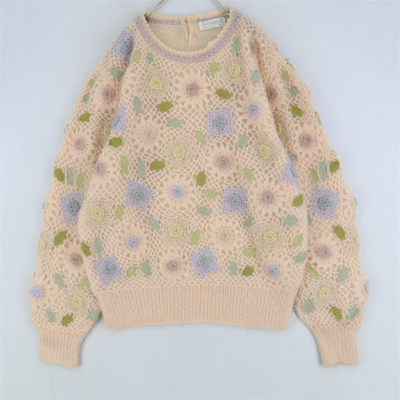 vintage古著孤品重工日系手工立體鉤花文藝粉嫩花朵學院女毛衣183