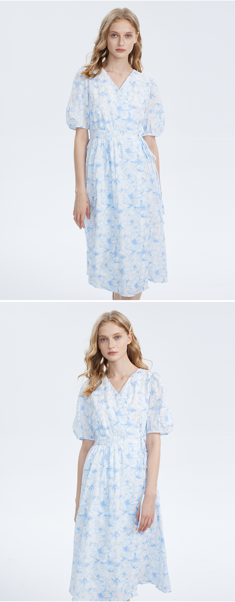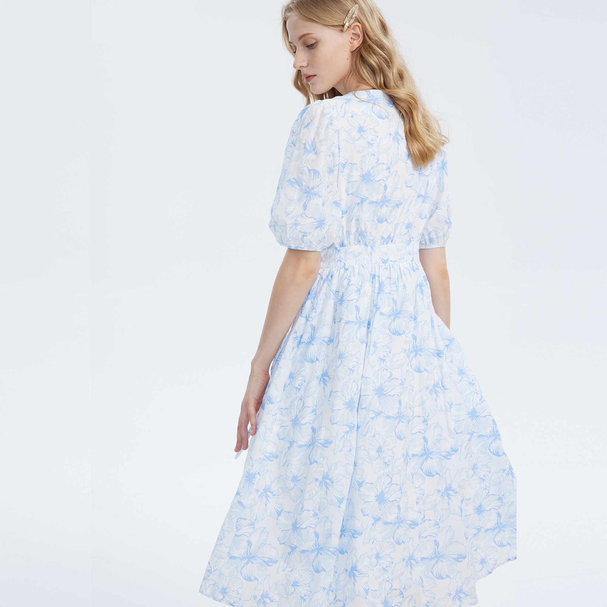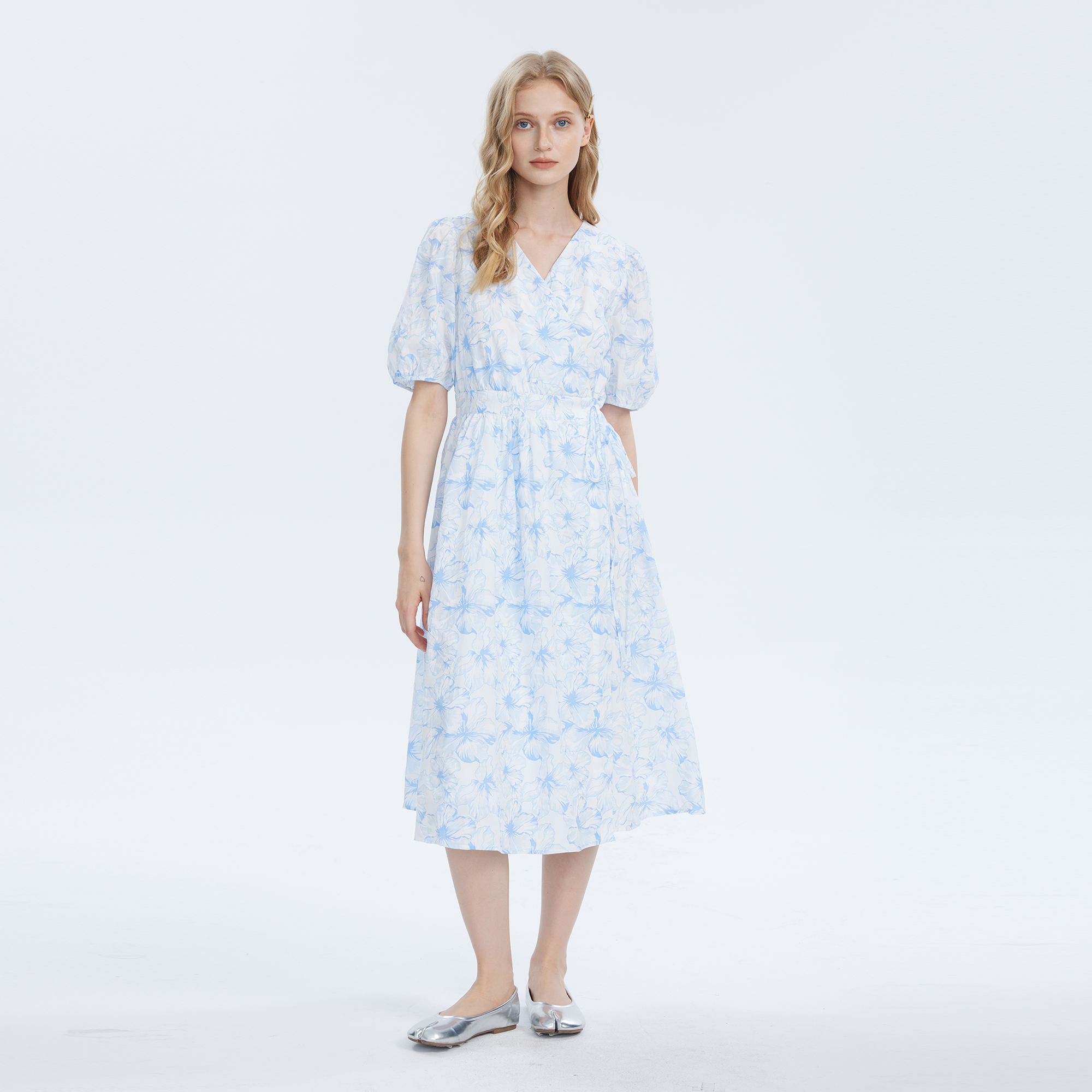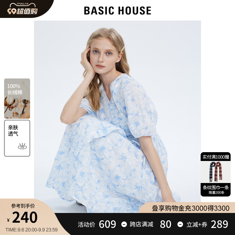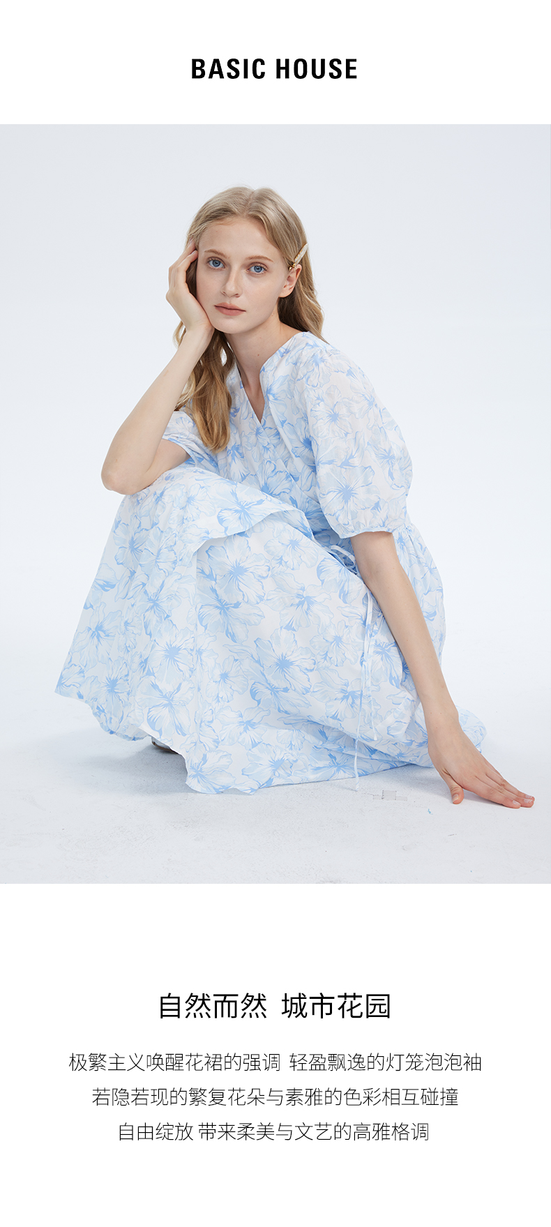 【莫奈花園】Basic House/百家好V領碎花洋裝女泡泡袖長裙