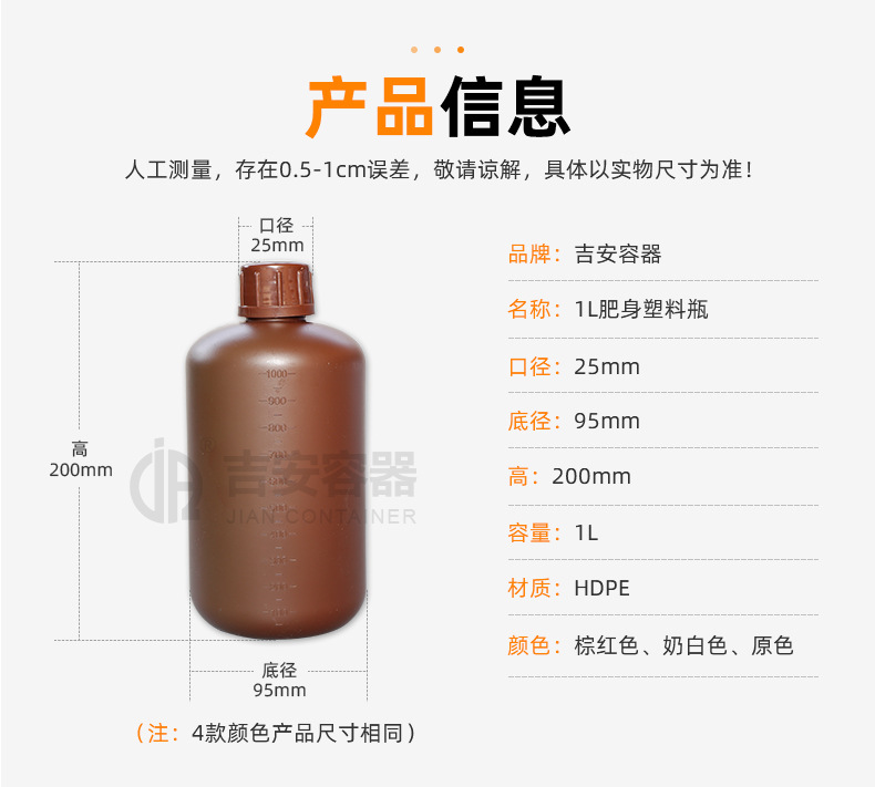 规格 1L塑料瓶 棕红色,1L塑料瓶 奶白色,1L塑料瓶 原色红盖,1L塑料瓶 原色白盖