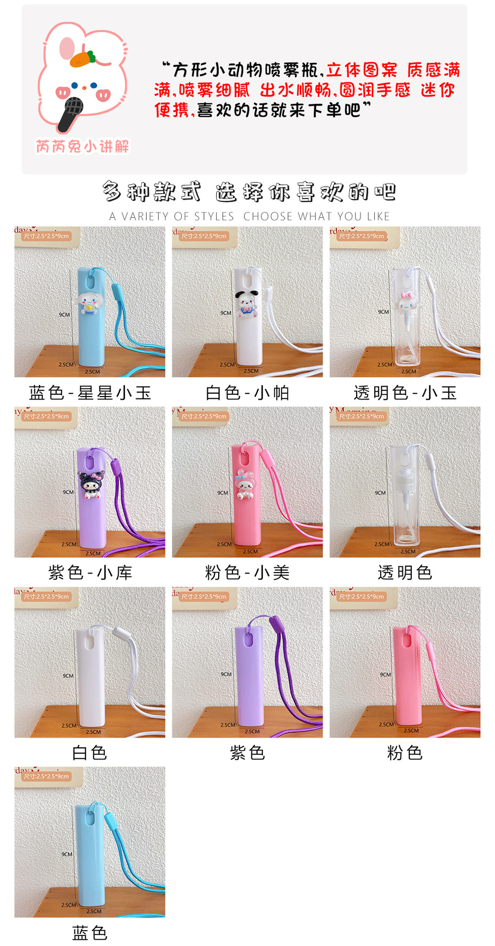 规格 1#蓝色,2#粉色,3#紫色,4#白色,5#透明色,6#蓝色-星星小玉,7#粉色-小美,8#紫色-小库,9#白色-小帕,10#透明色-小玉