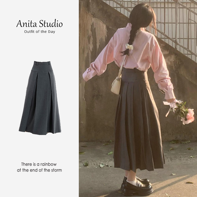 高級感灰色西裝百褶裙女2023年春季新款高腰半身裙小個子a字裙