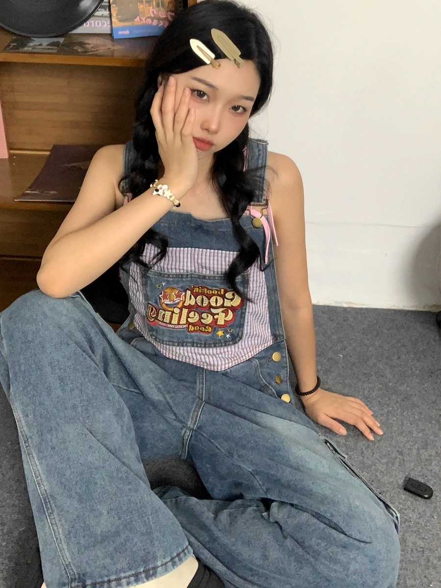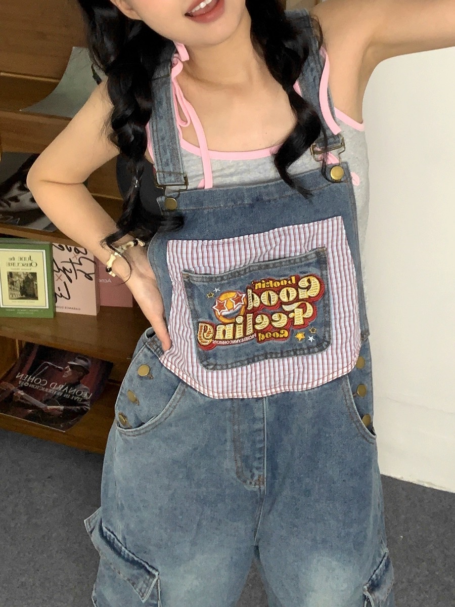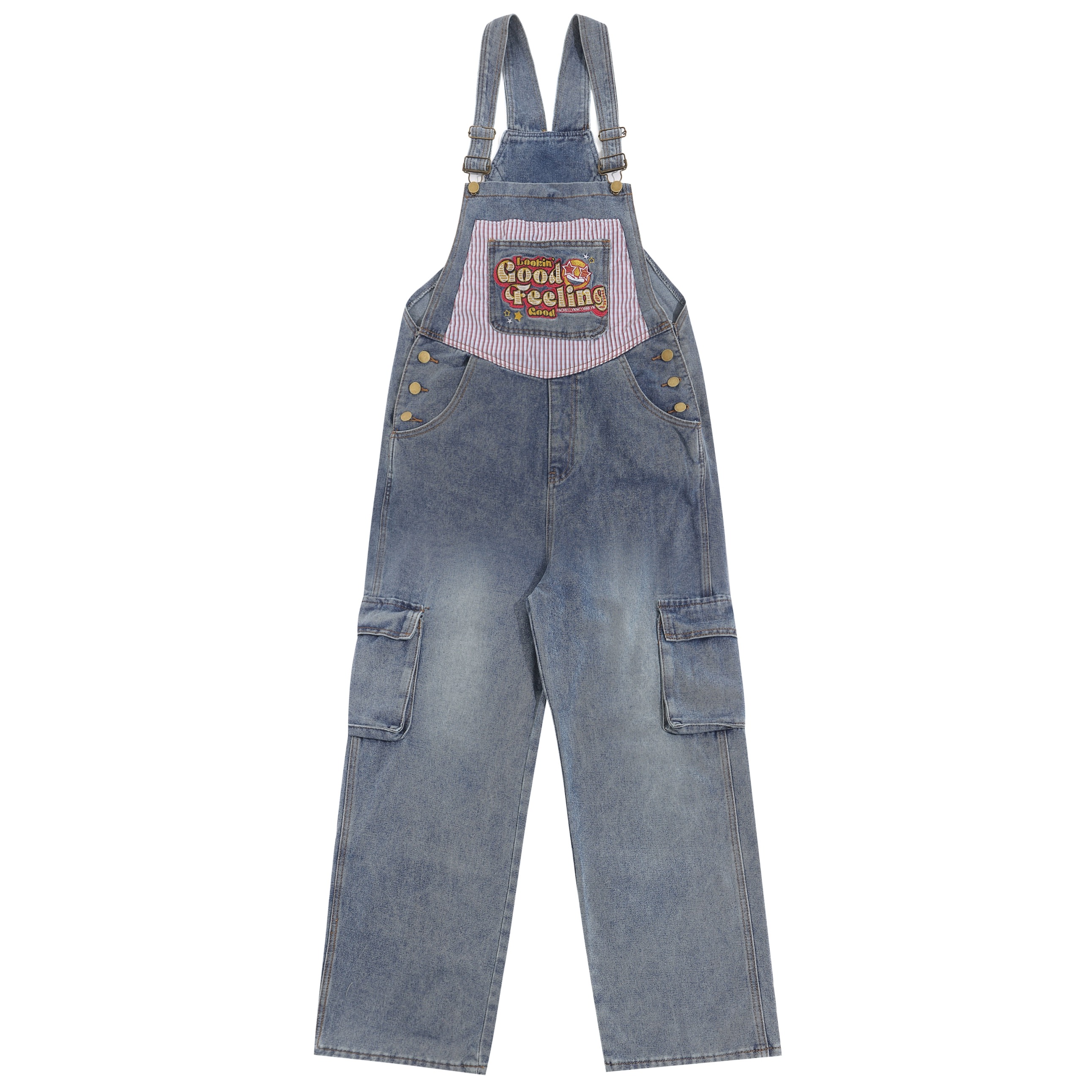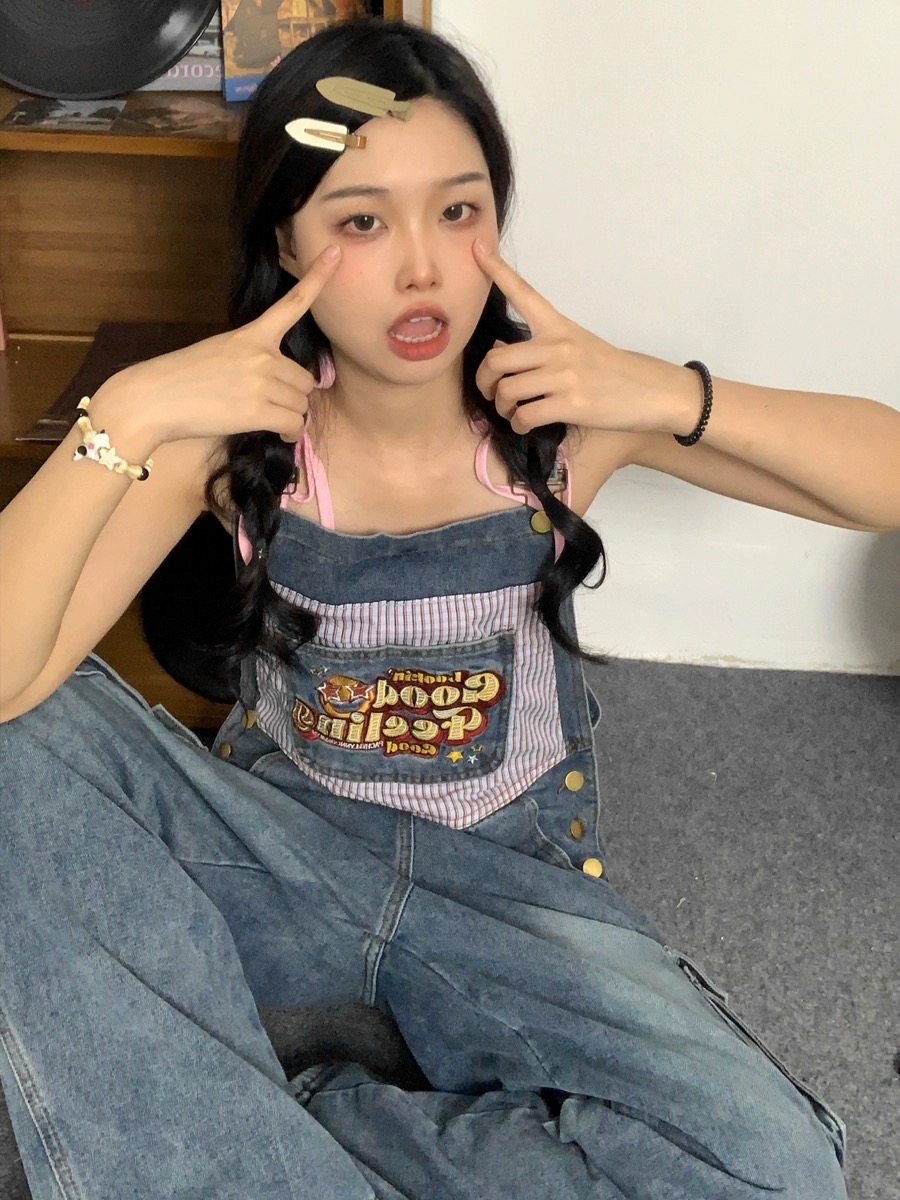 復古童趣刺繡抱嬰袋牛仔連身褲女小眾減齡可愛寬鬆顯瘦顯瘦闊腿褲子
