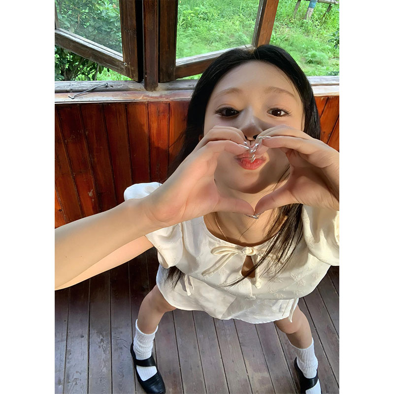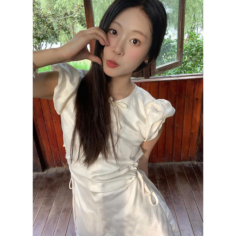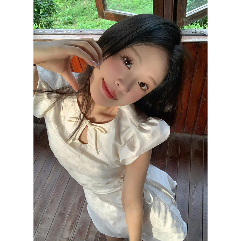 YOZO STUDIO/囍番 新中式盤扣蝴蝶結泡泡袖洋裝女鏤空性感短裙