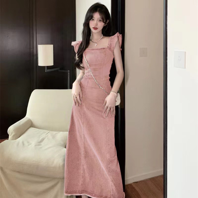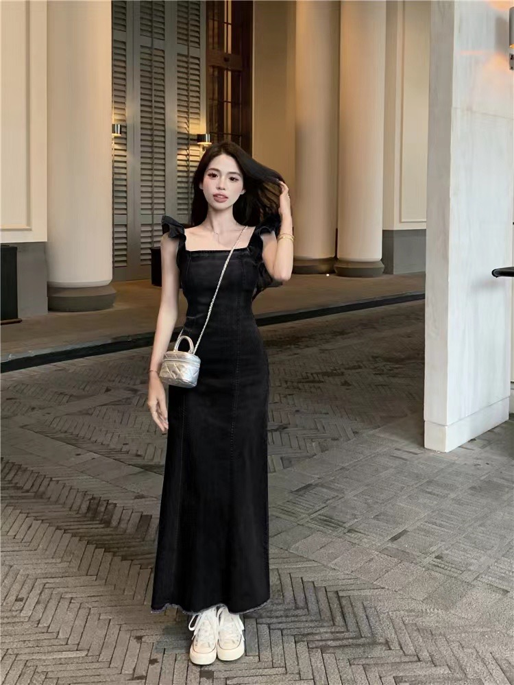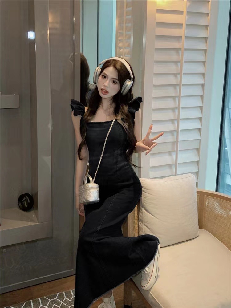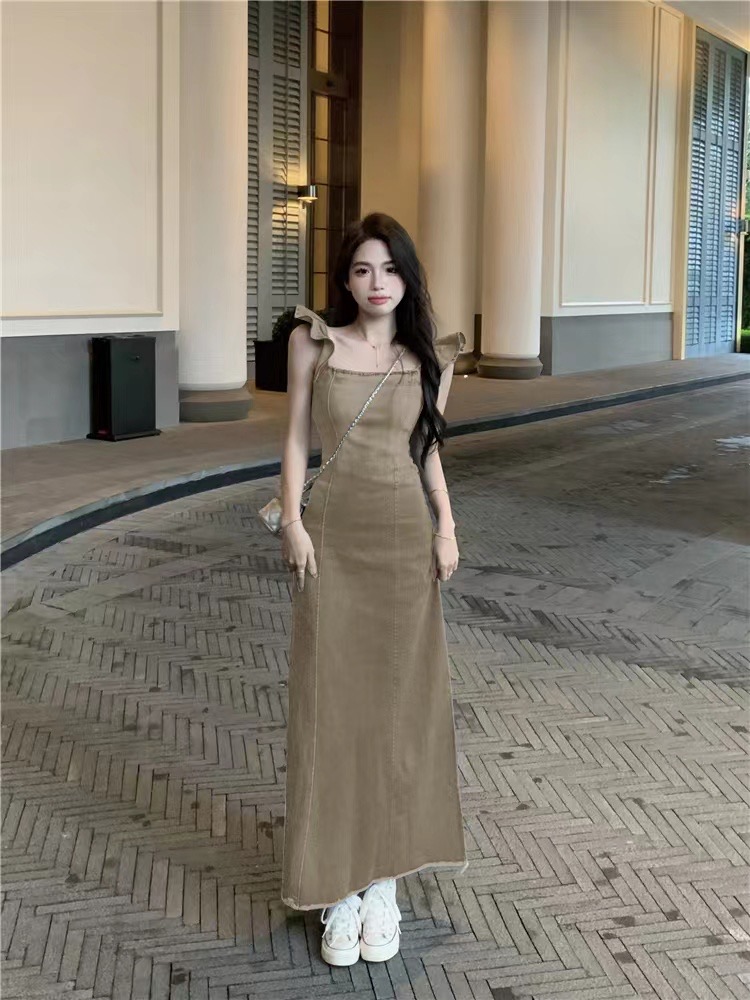 美式復古牛仔洋裝女夏季收腰顯瘦設計感小眾長裙吊帶流蘇裙子潮