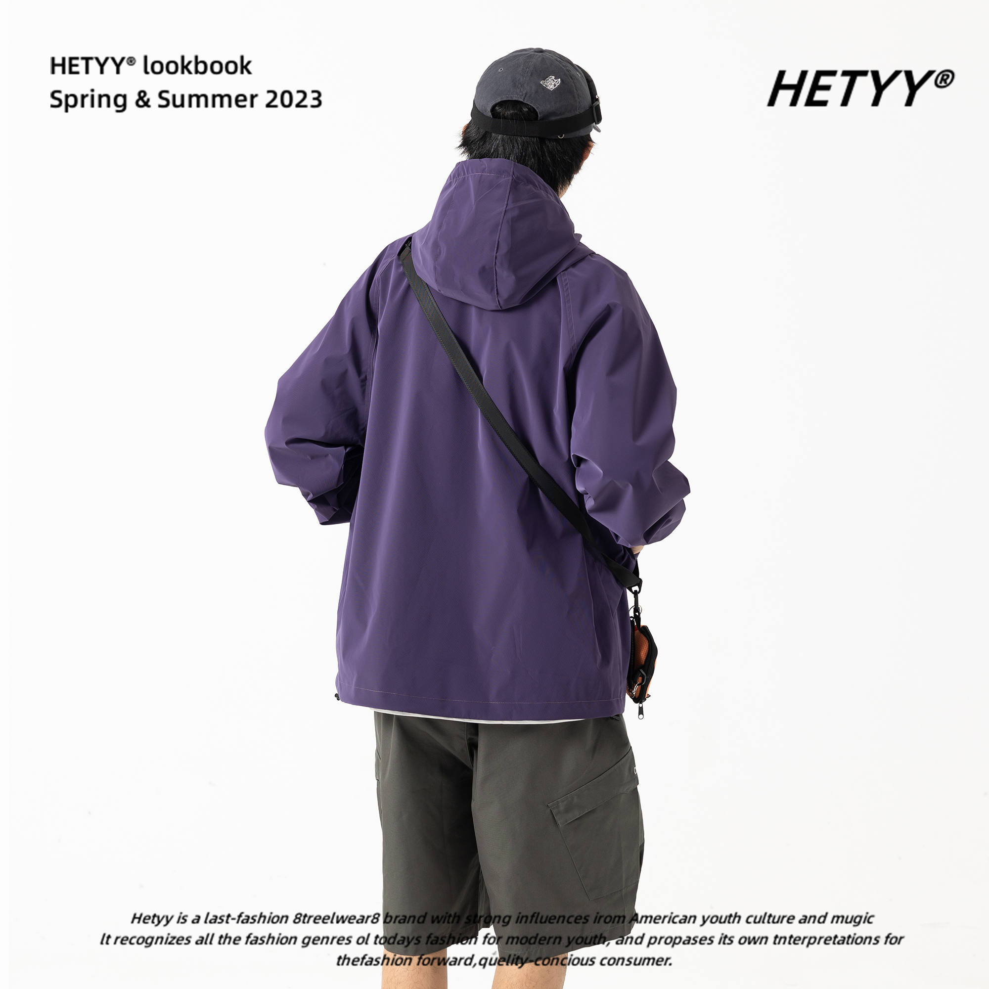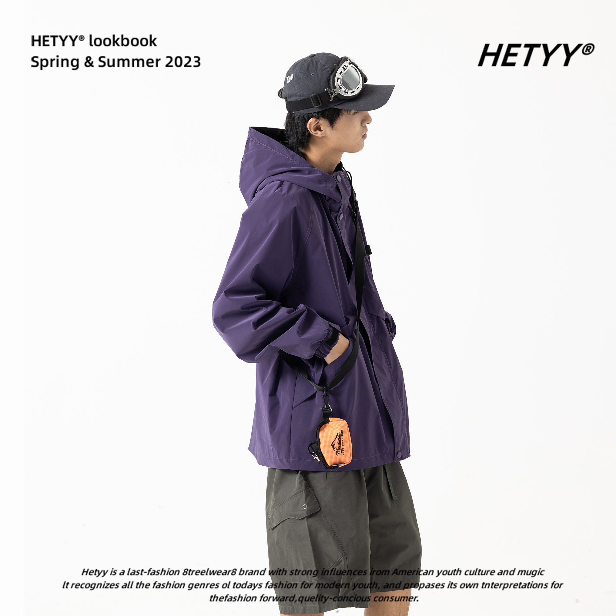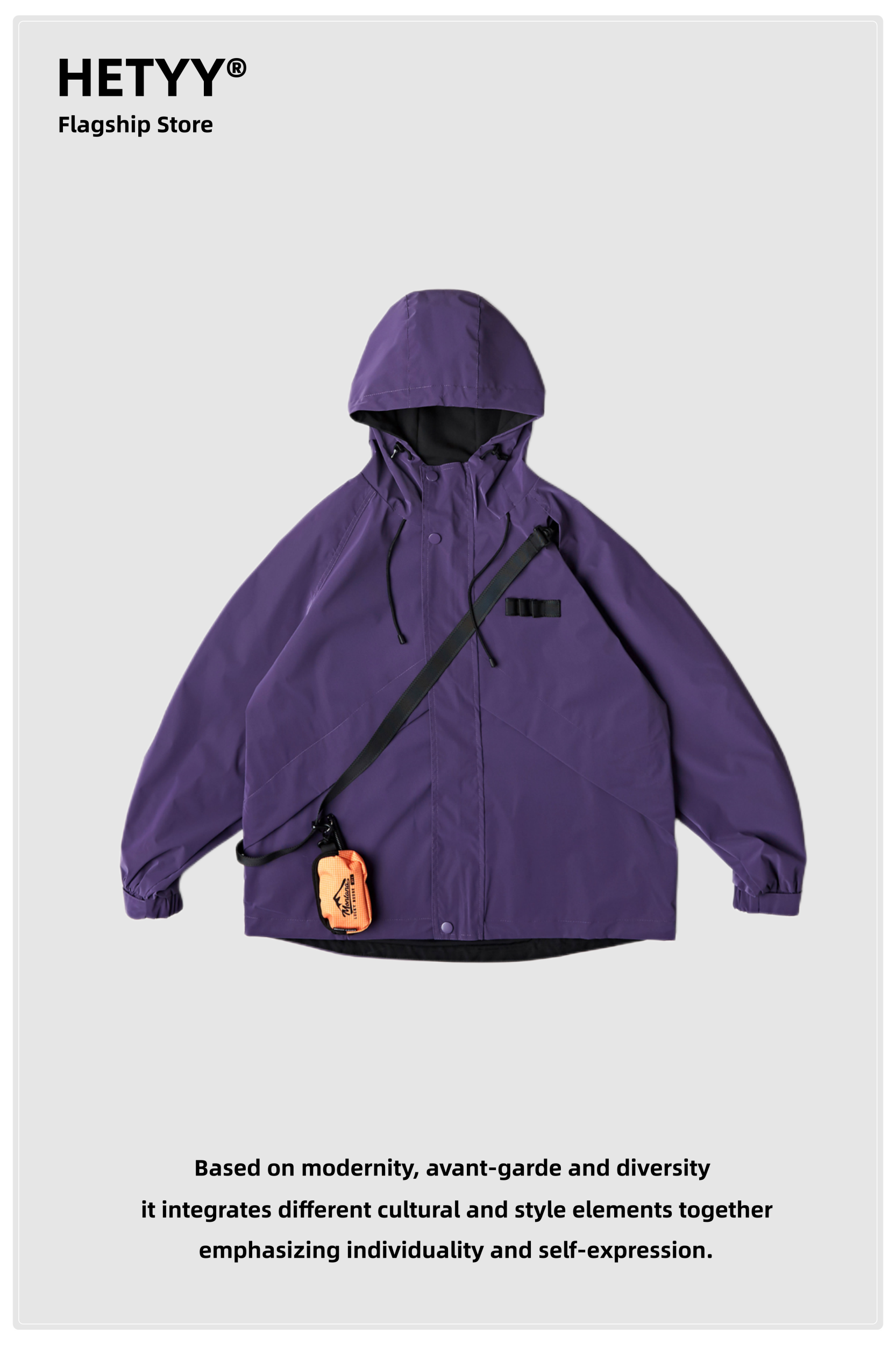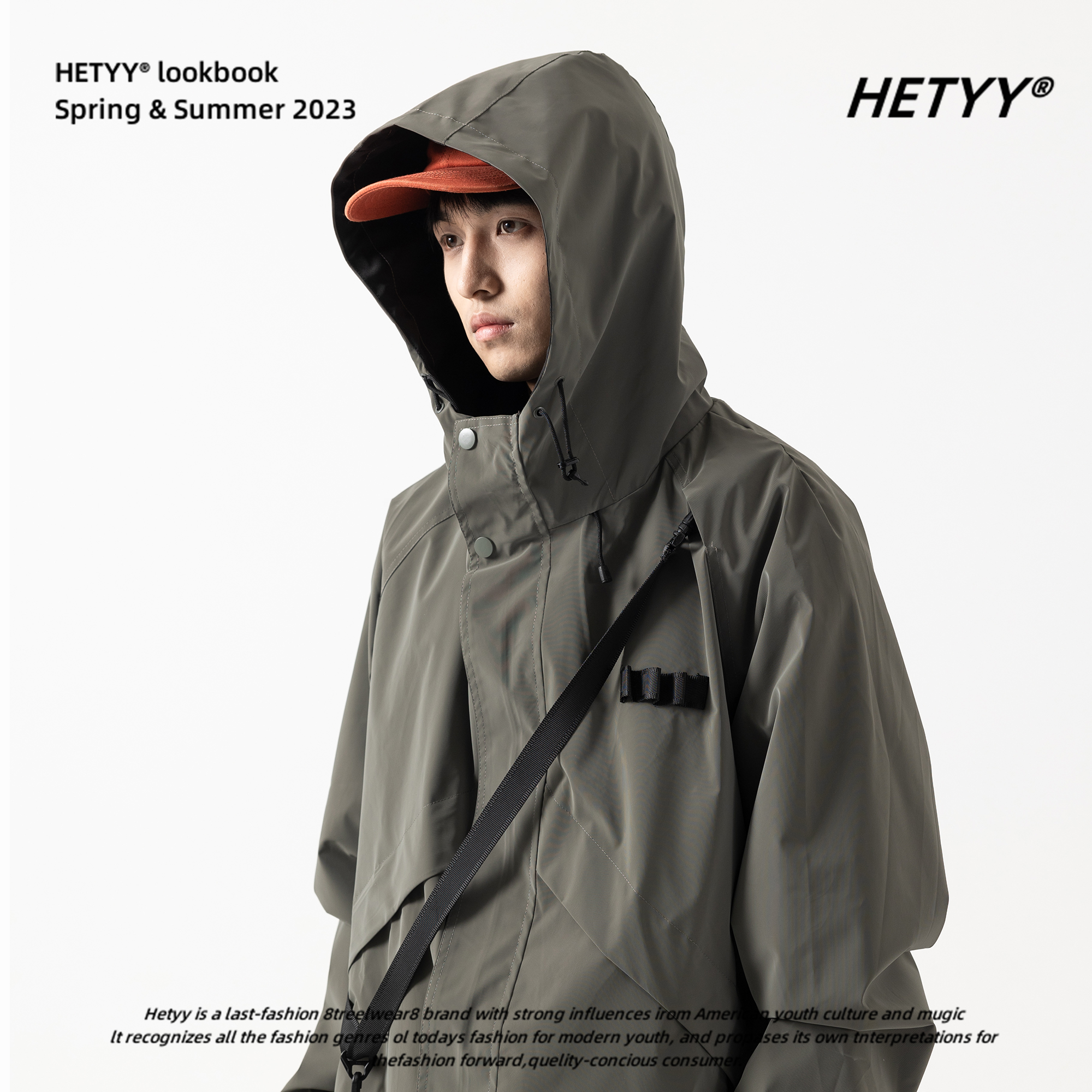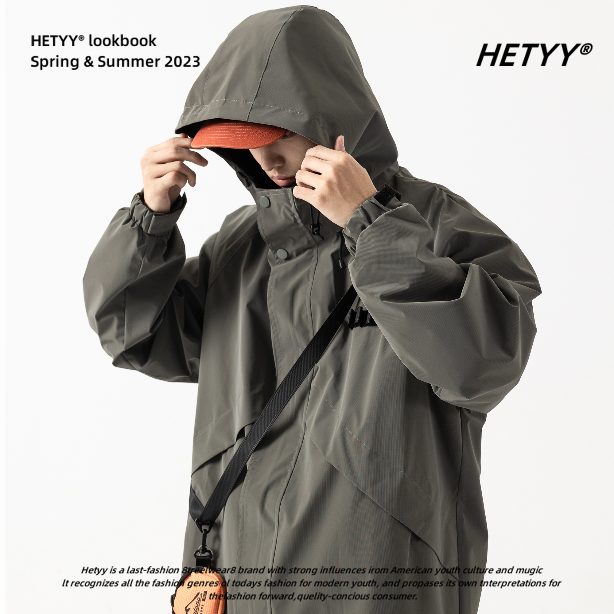 HETYY春季復古機能風挎包連帽衝鋒衣夾克男女潮牌寬鬆情侶外套