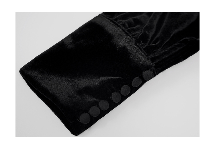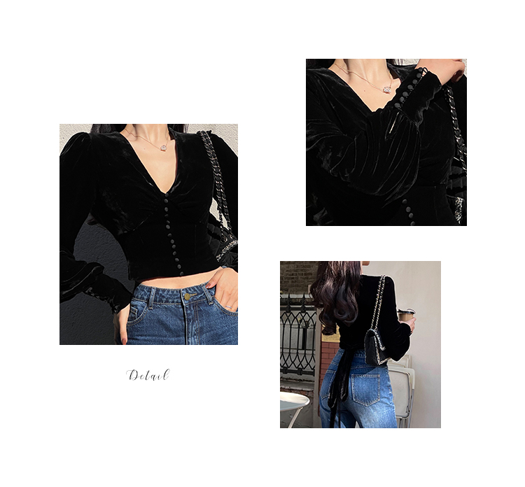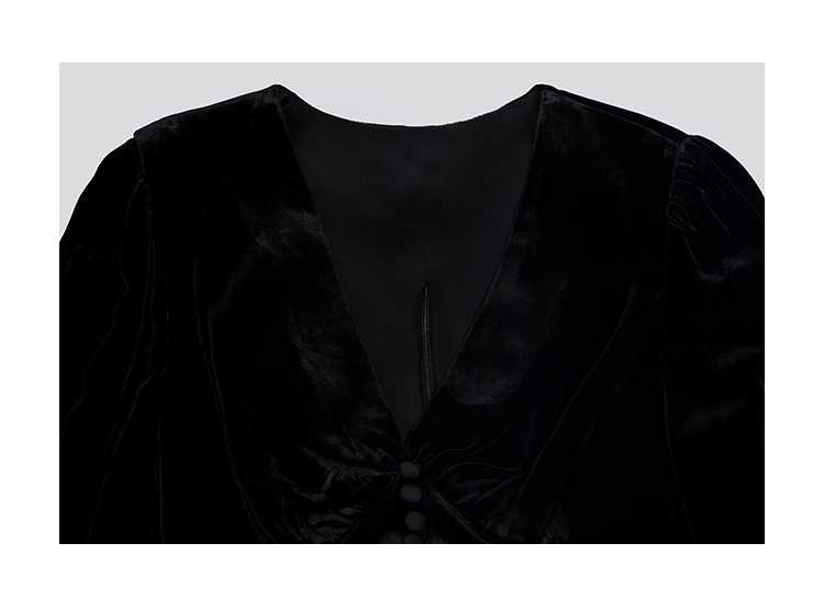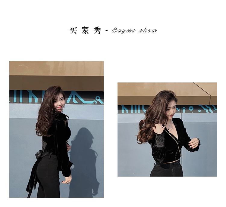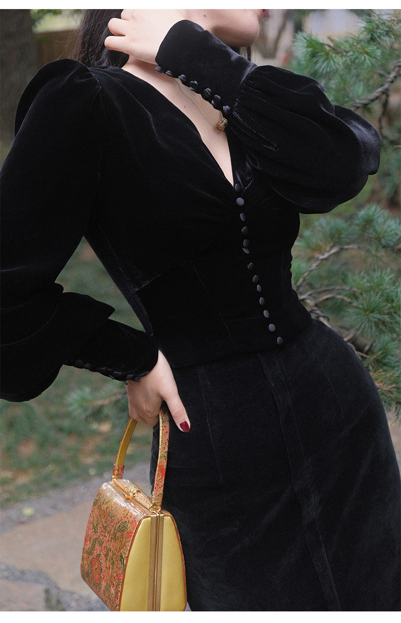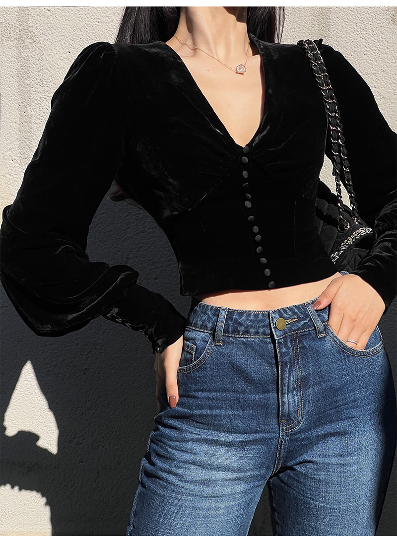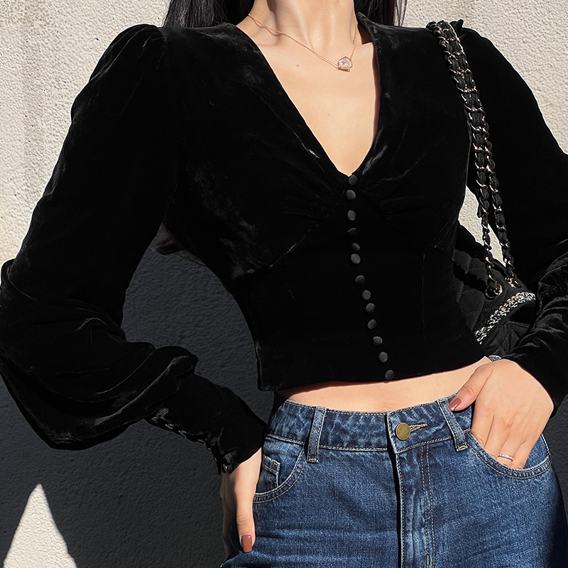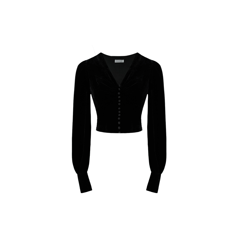 小麗XIAOLI黑曜石絲絨泡泡長袖V領襯衫秋內搭法式設計感顯瘦上衣