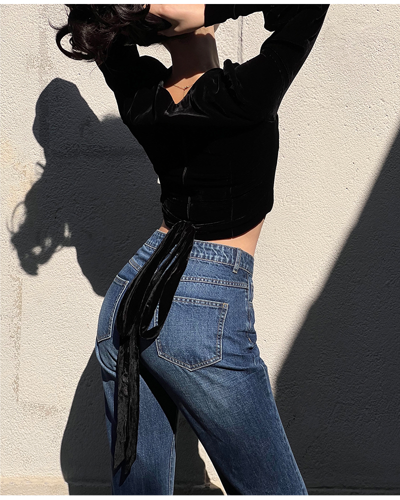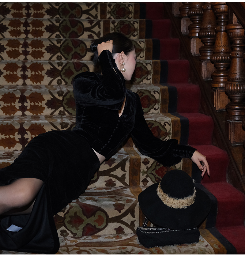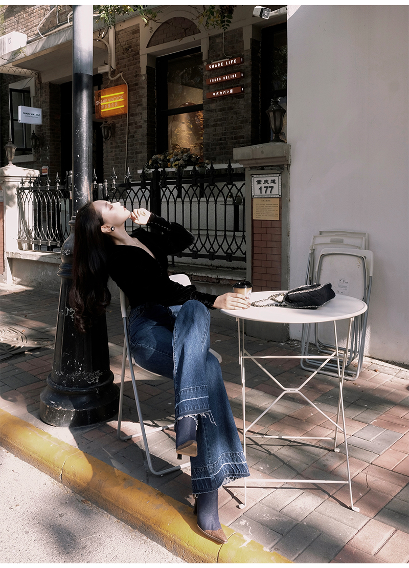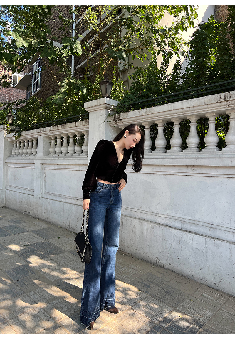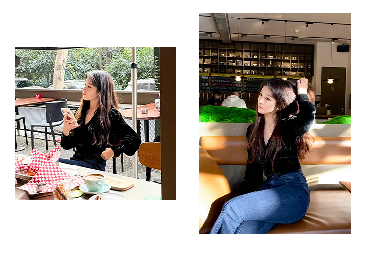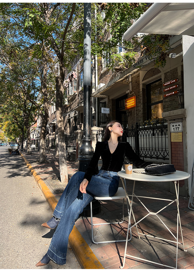 小麗XIAOLI黑曜石絲絨泡泡長袖V領襯衫秋內搭法式設計感顯瘦上衣