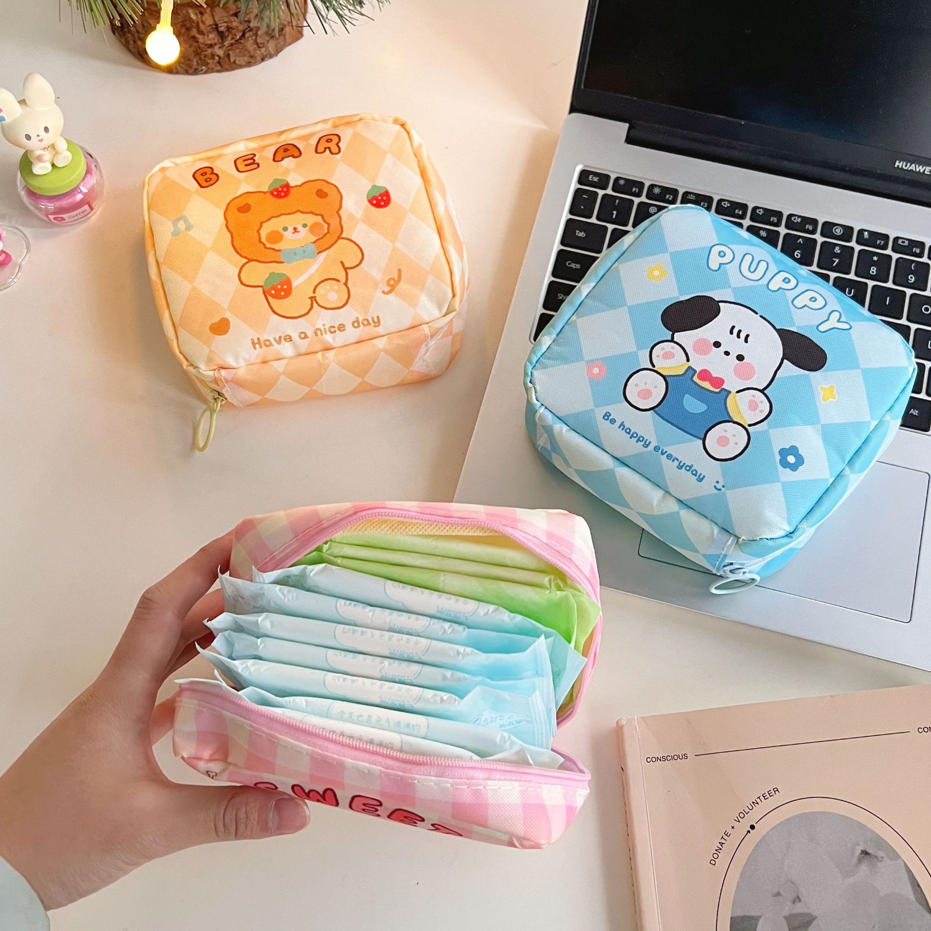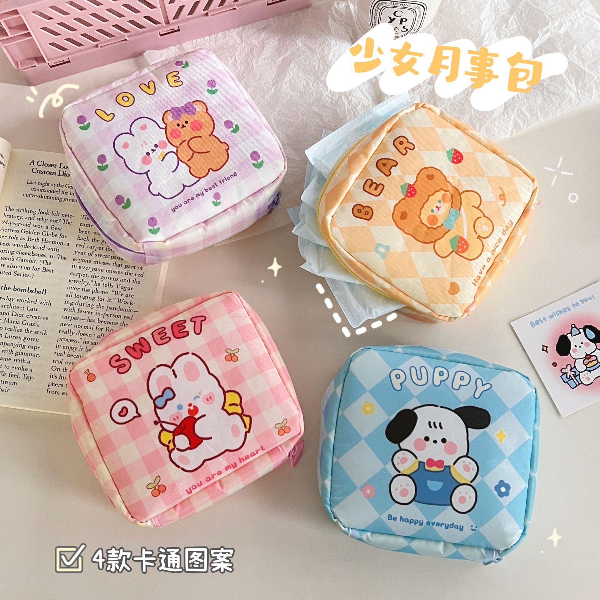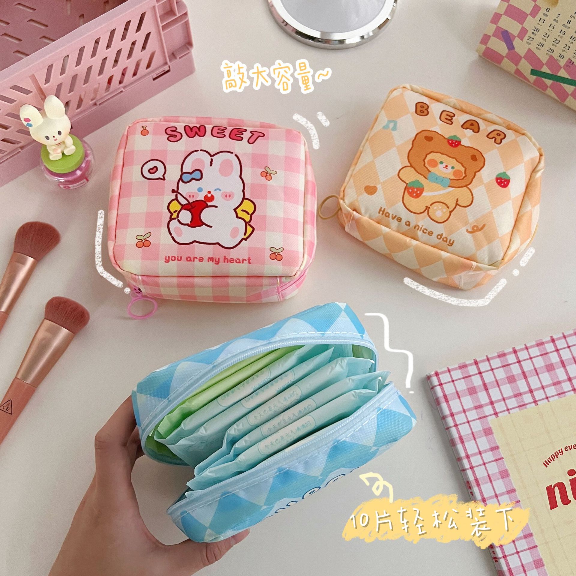 网红化妆包女姨妈包便携多功能卫生棉月事收纳包糖果色简约手拿包
