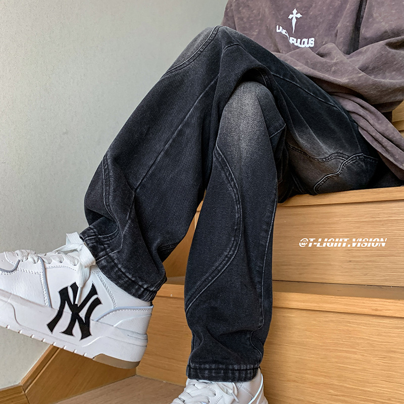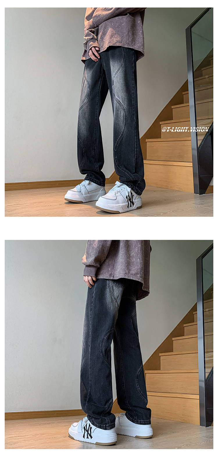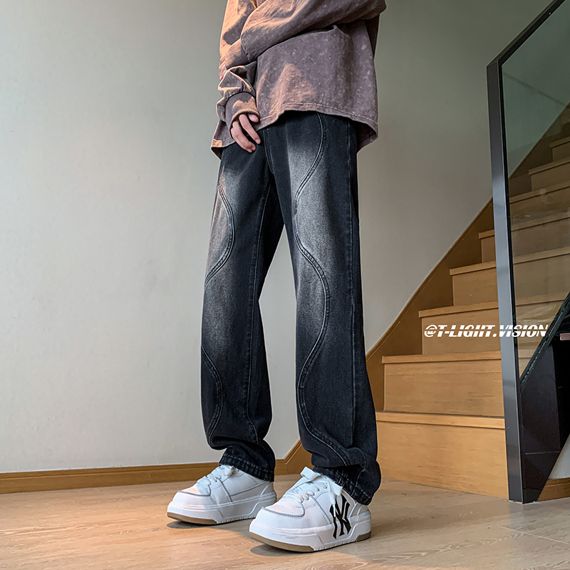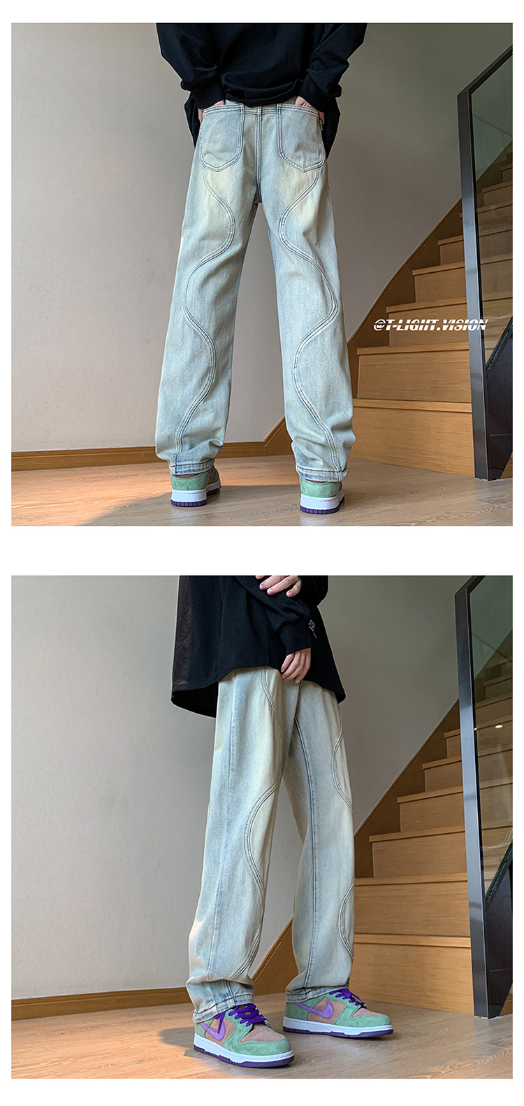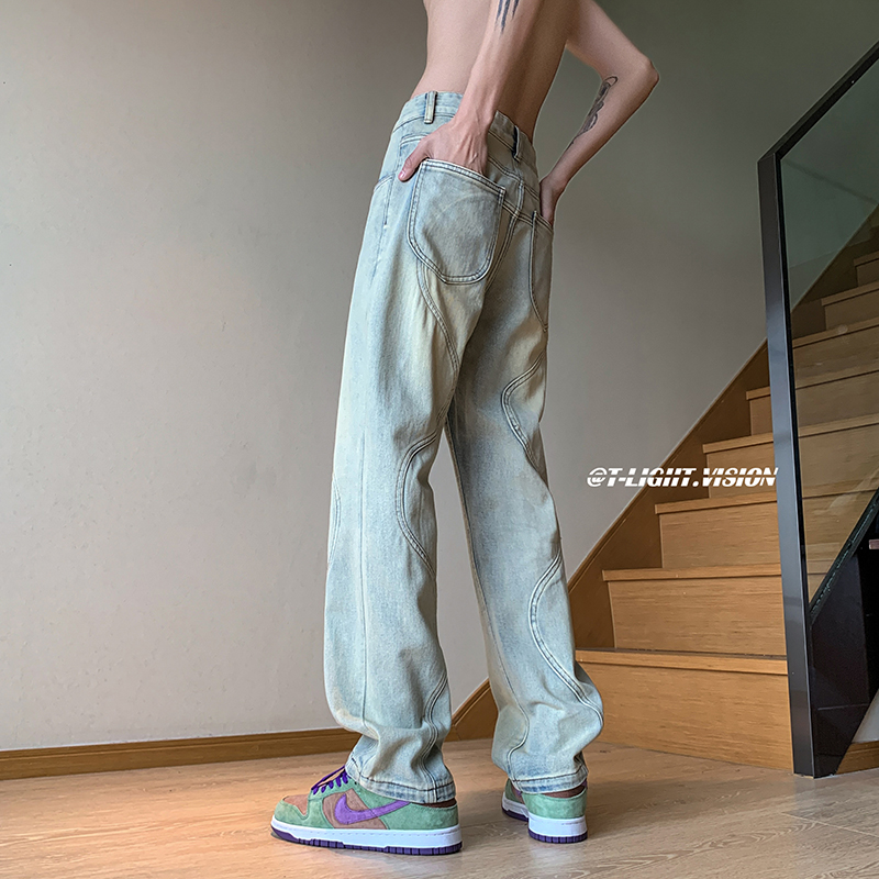 歐美復古vintage水洗牛仔褲直筒寬鬆設計感曲線分割美式vibe褲子