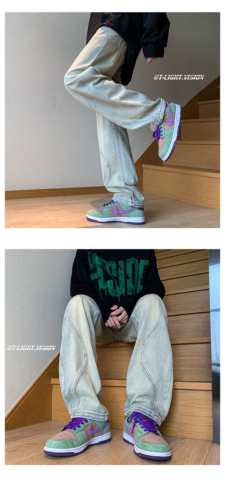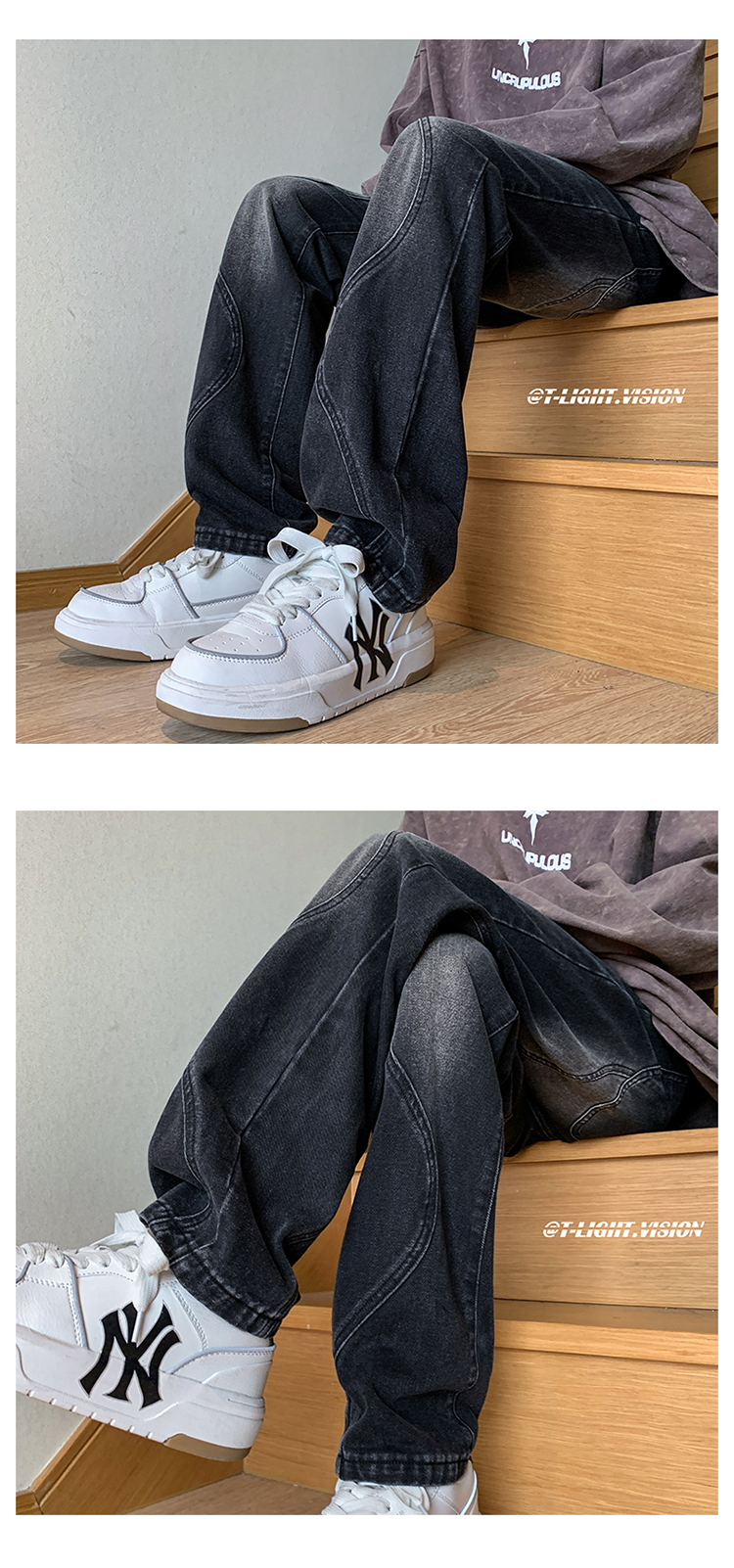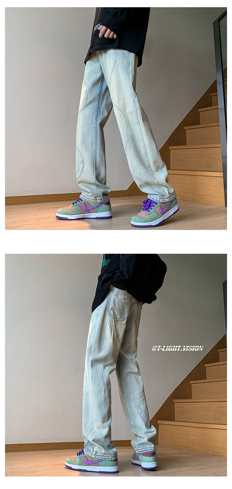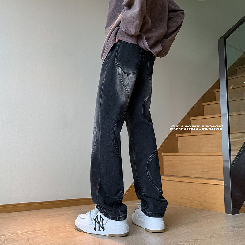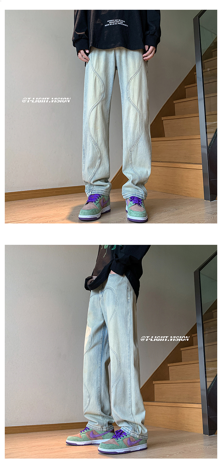 歐美復古vintage水洗牛仔褲直筒寬鬆設計感曲線分割美式vibe褲子