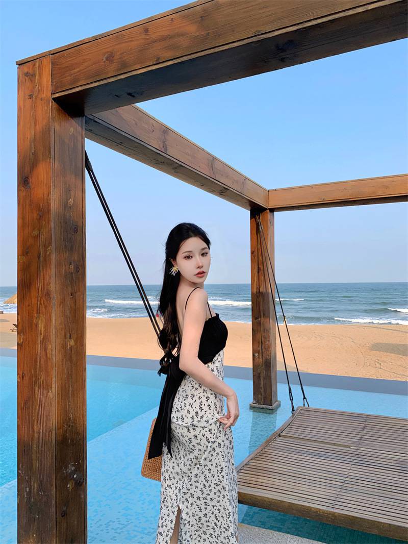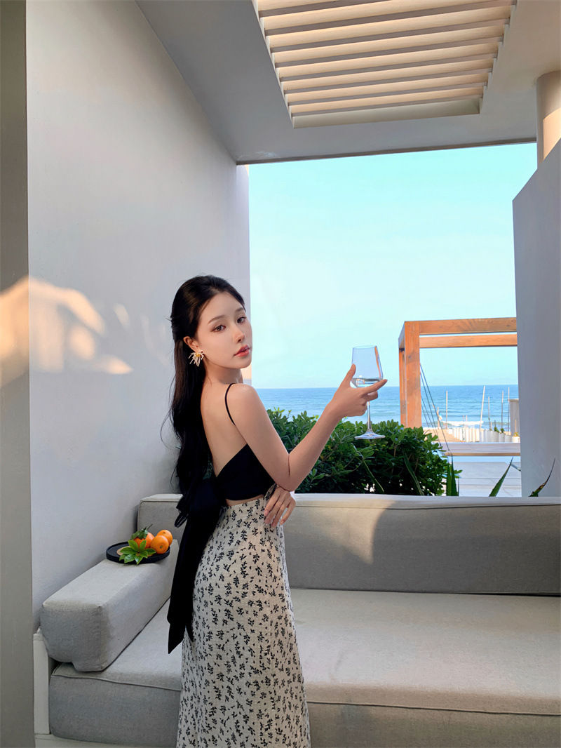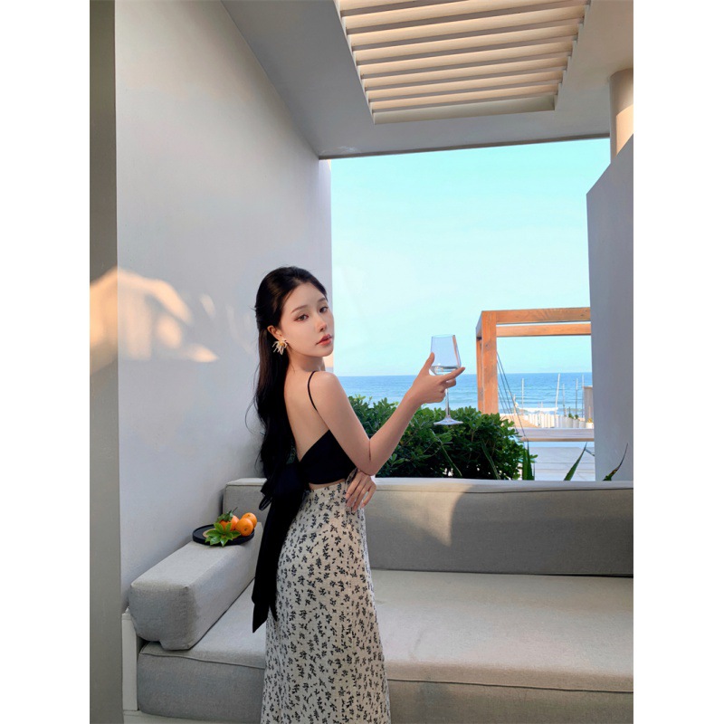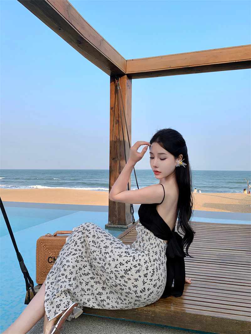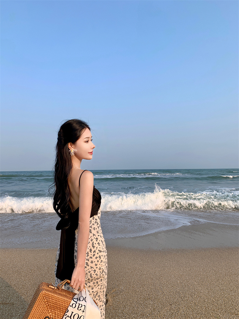 784220232023夏新款缎面棉拼接撞色碎花灰白黑露背蝴蝶结吊带裙女
