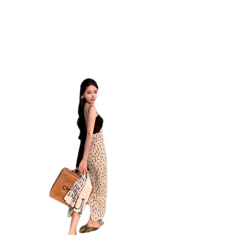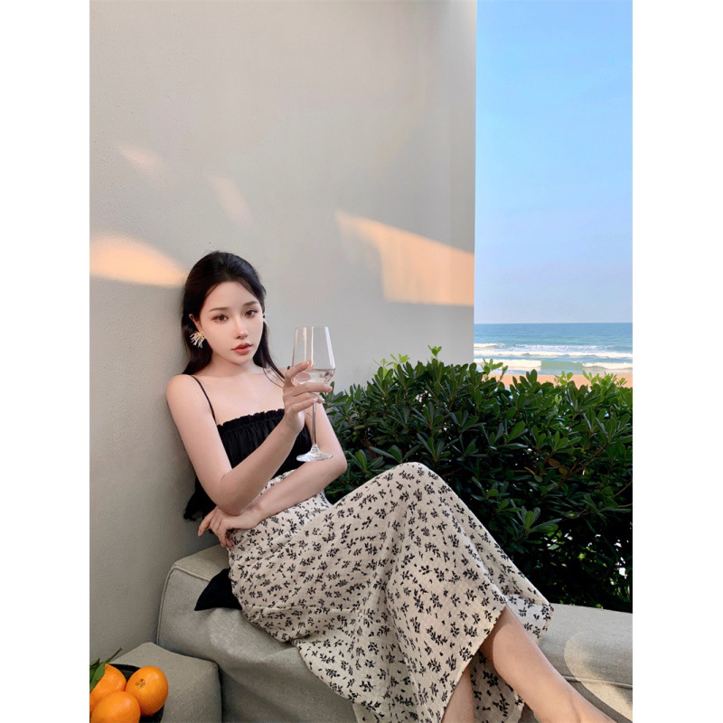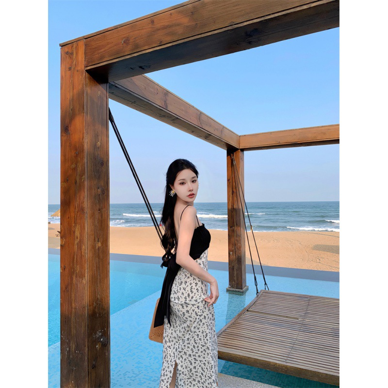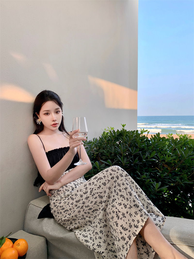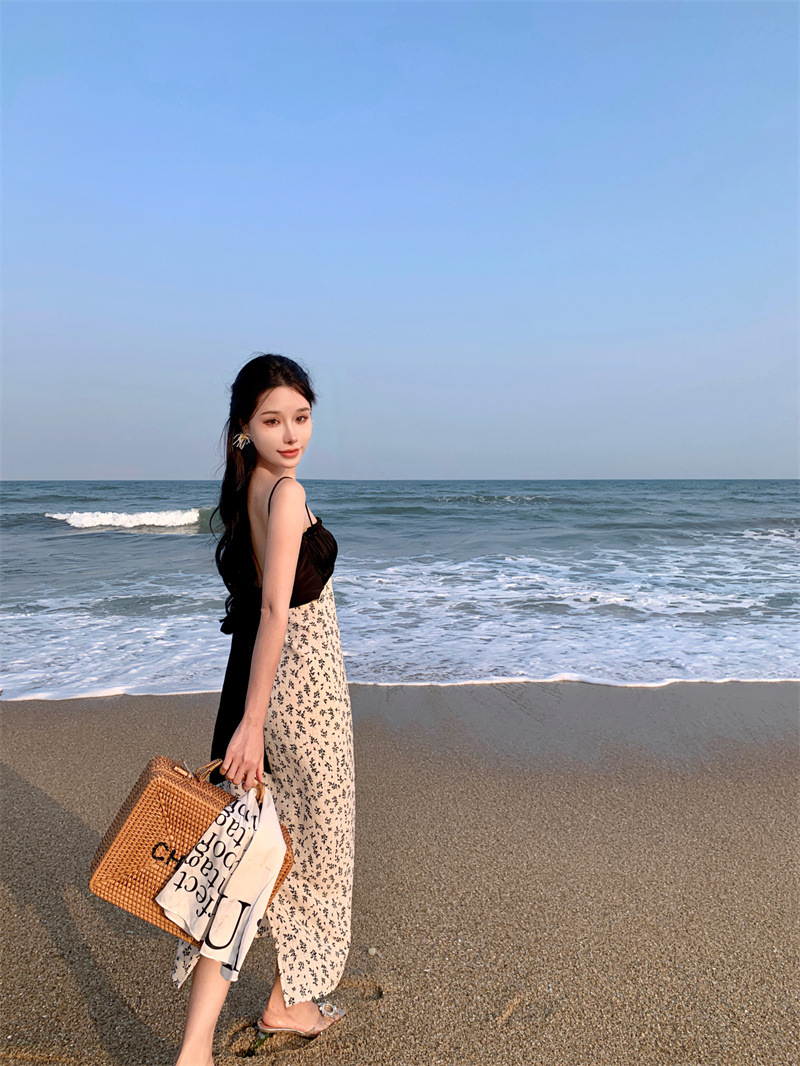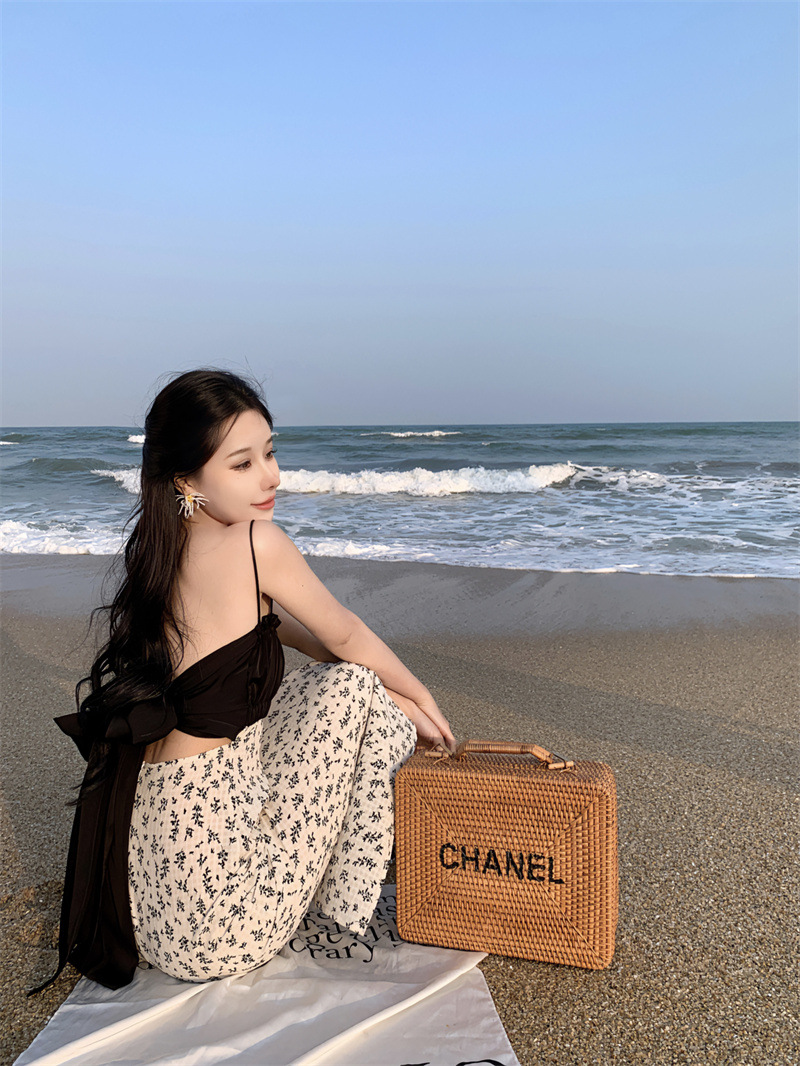 784220232023夏新款缎面棉拼接撞色碎花灰白黑露背蝴蝶结吊带裙女