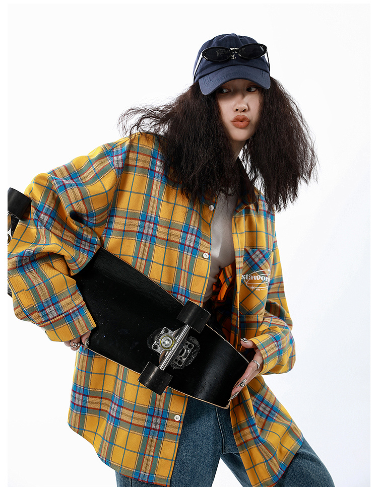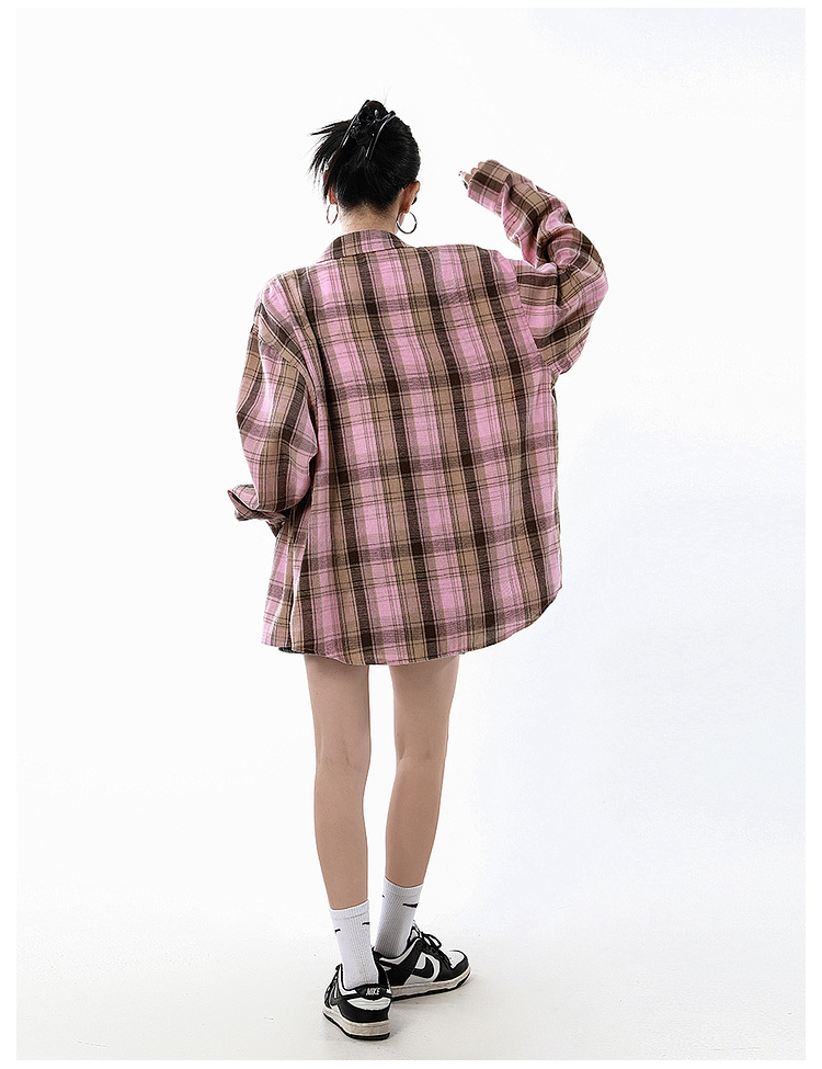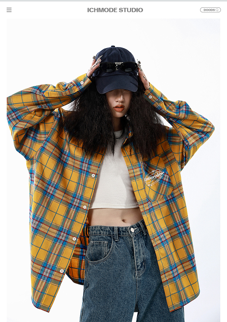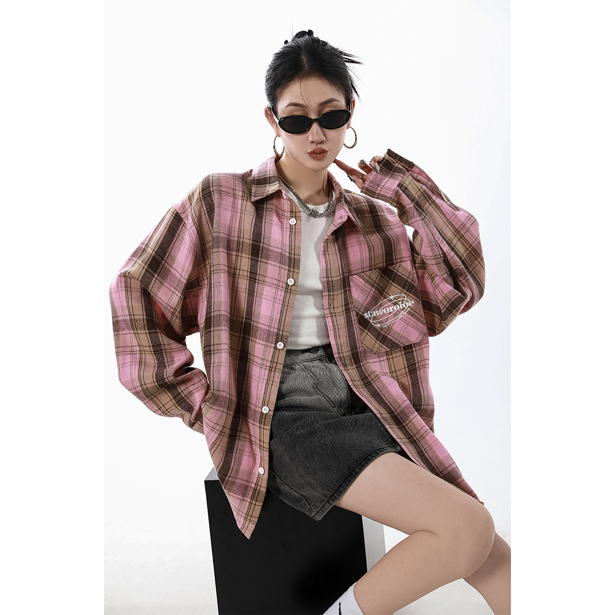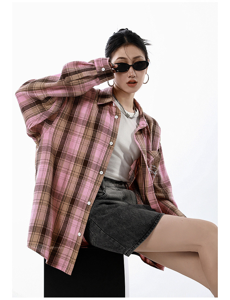 ICH MODE復古美式格紋撞色設計感寬鬆長袖開衫百搭休閒慵懶風襯衫