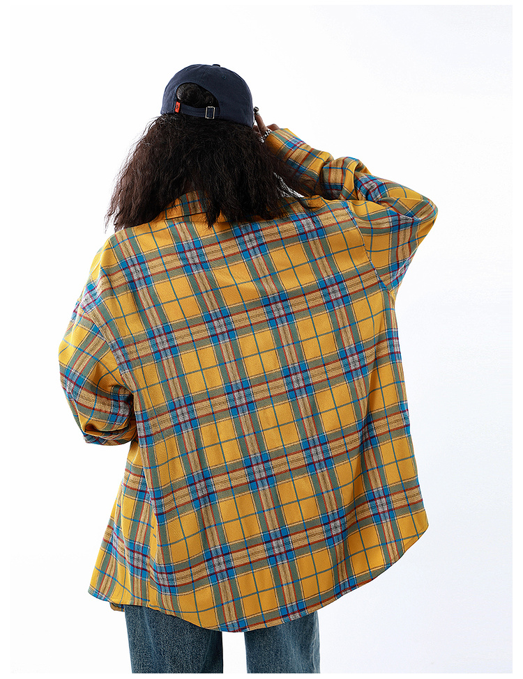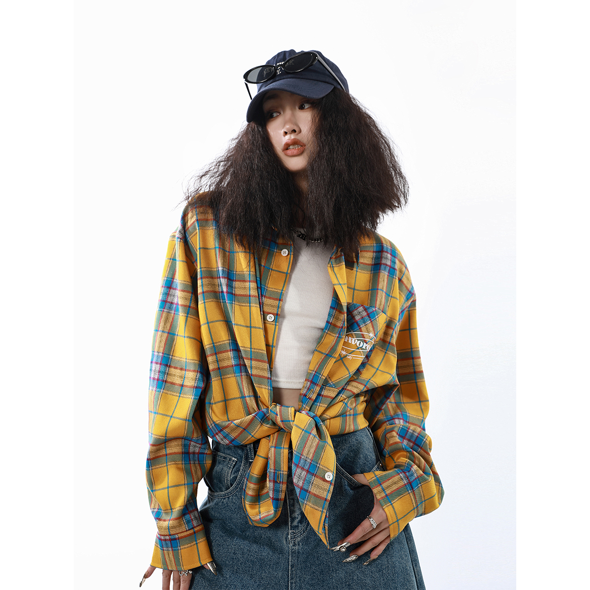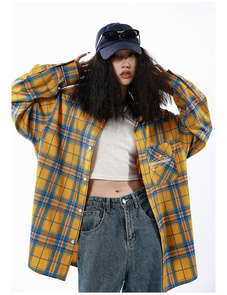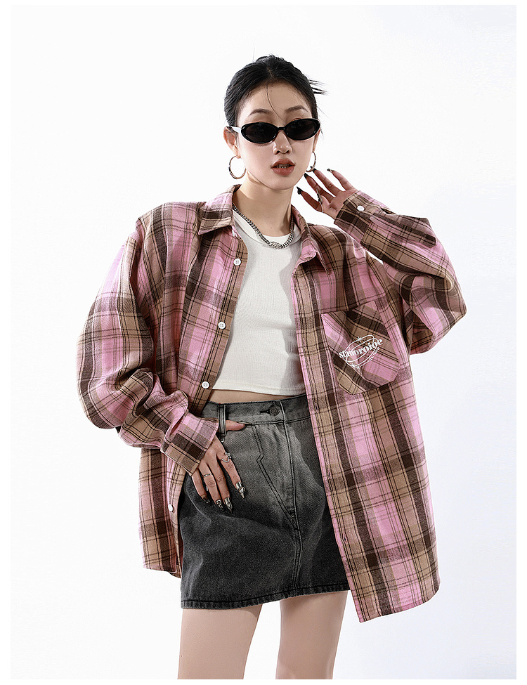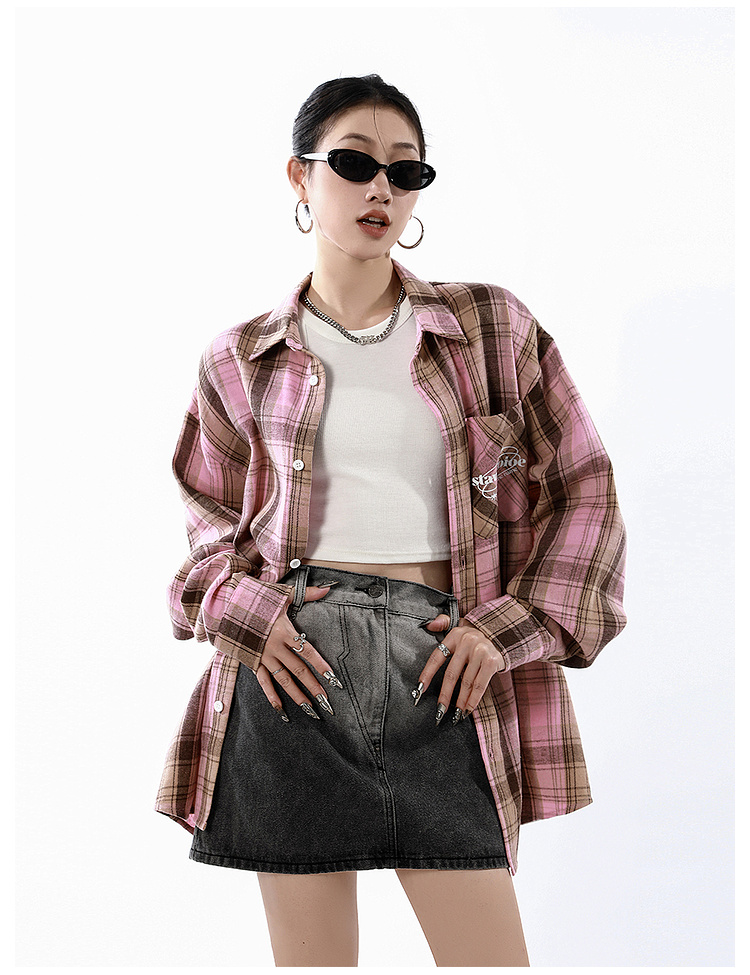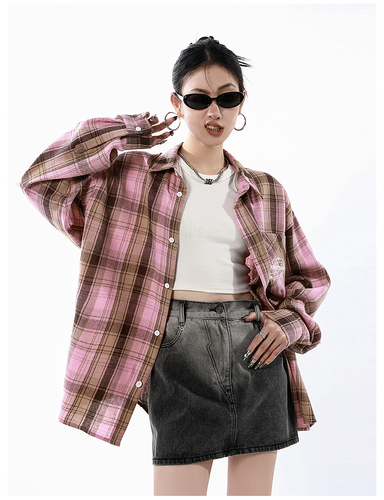 ICH MODE復古美式格紋撞色設計感寬鬆長袖開衫百搭休閒慵懶風襯衫