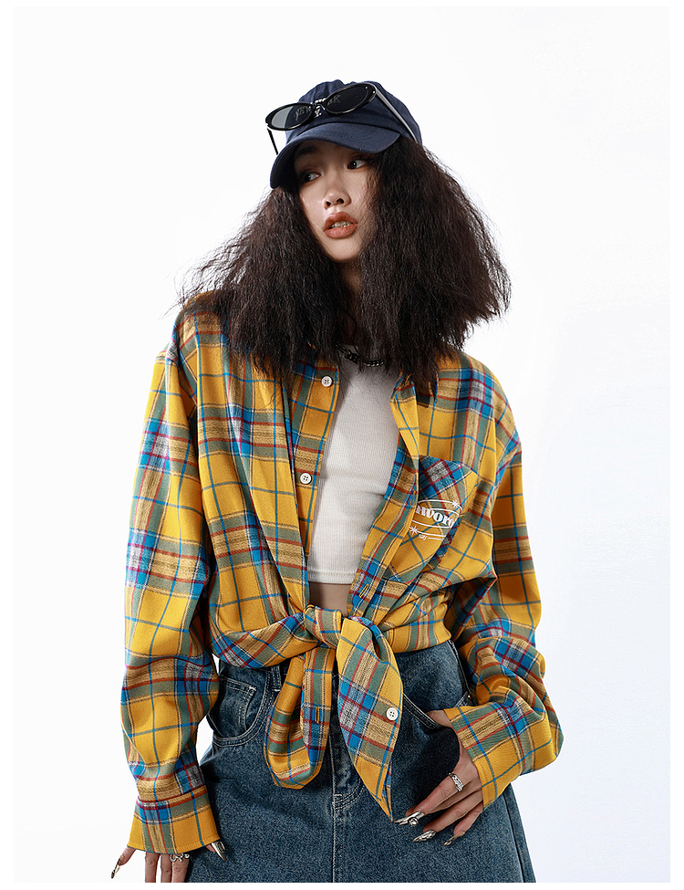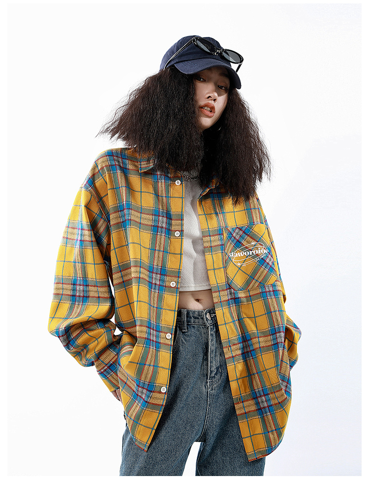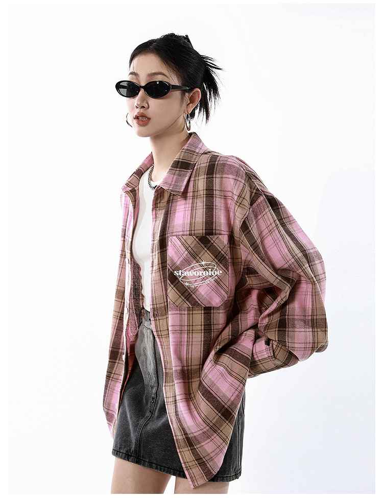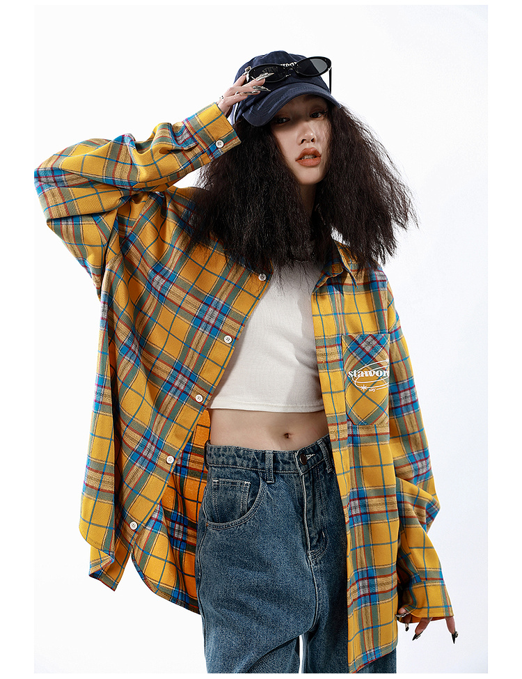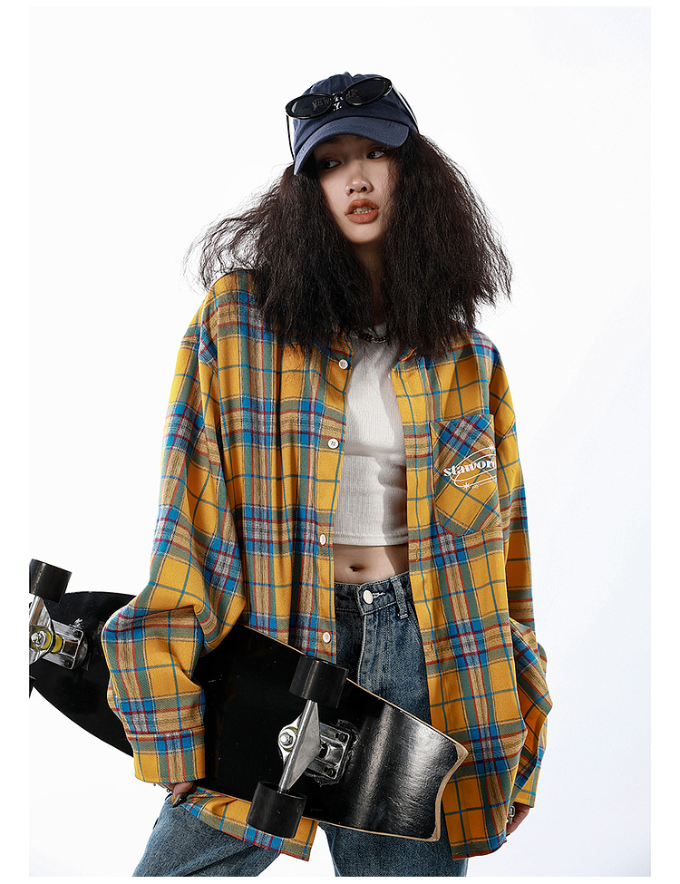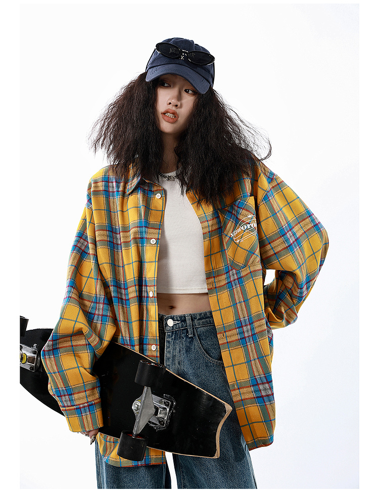 ICH MODE復古美式格紋撞色設計感寬鬆長袖開衫百搭休閒慵懶風襯衫