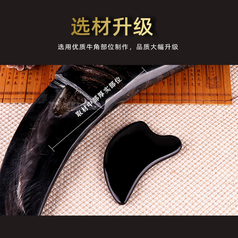 • 天然老牛角厚实的部分取做材料,一根老牛角只能打磨出一片厚实的刮痧板,刮痧板打磨光滑,并且结实耐用.可以说千年不变型万年不变色.