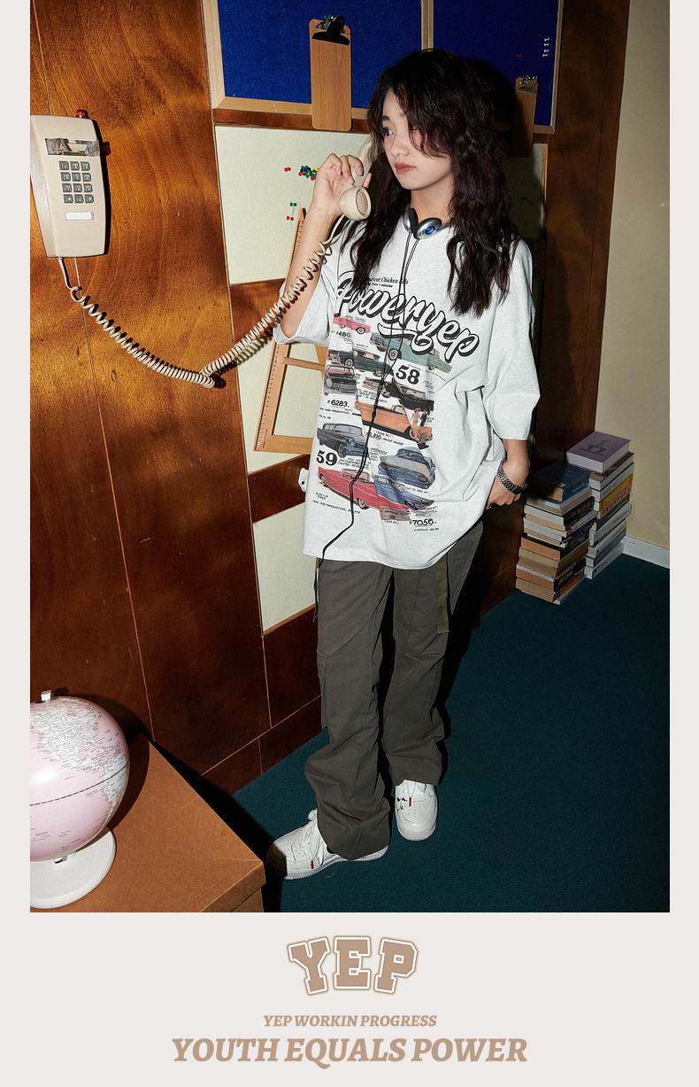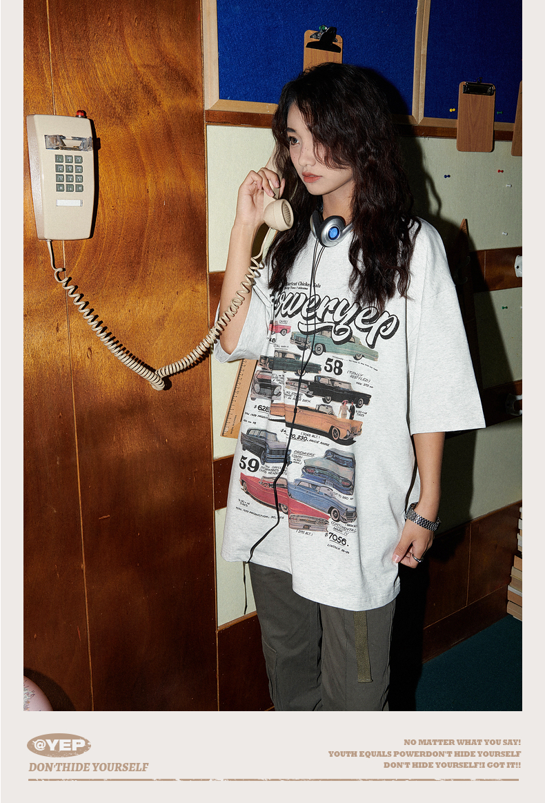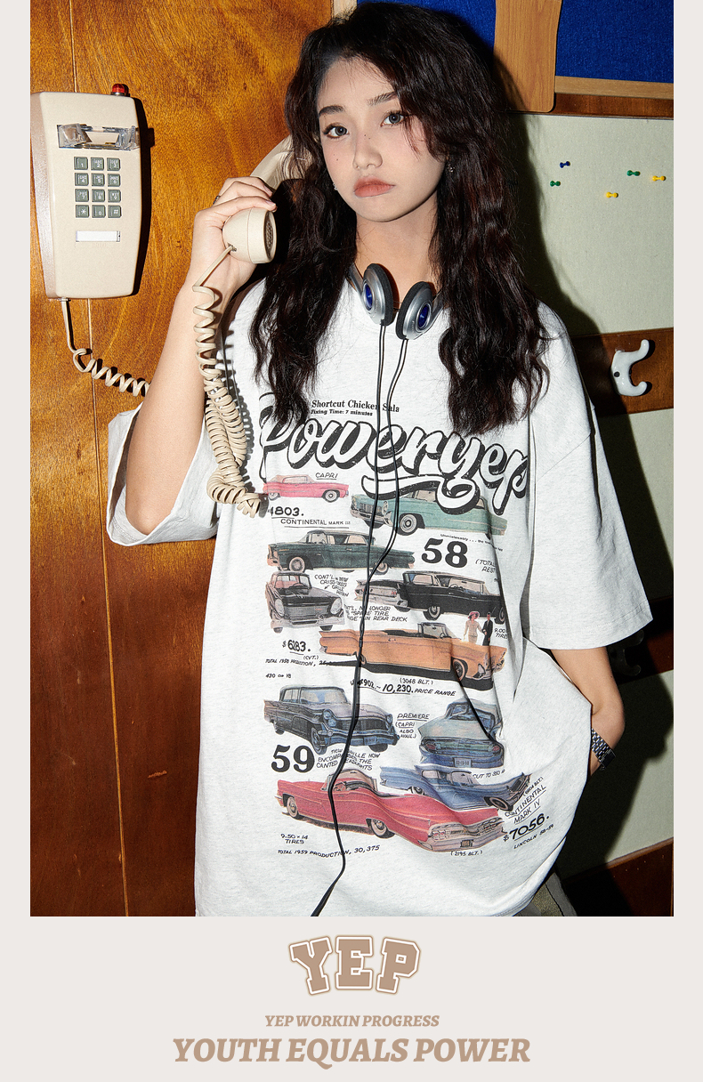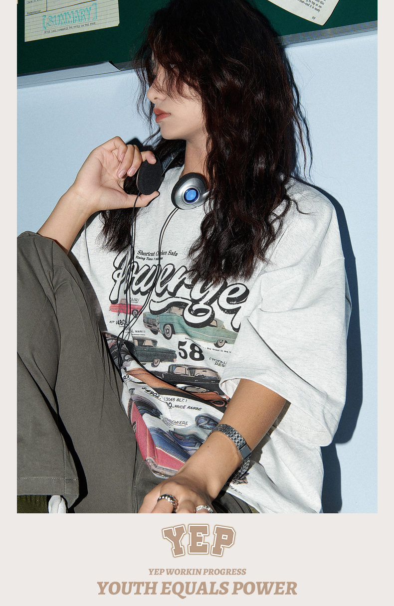 YEP美式復古汽車印花T恤女短袖ins潮設計感小眾夏季純棉半袖上衣