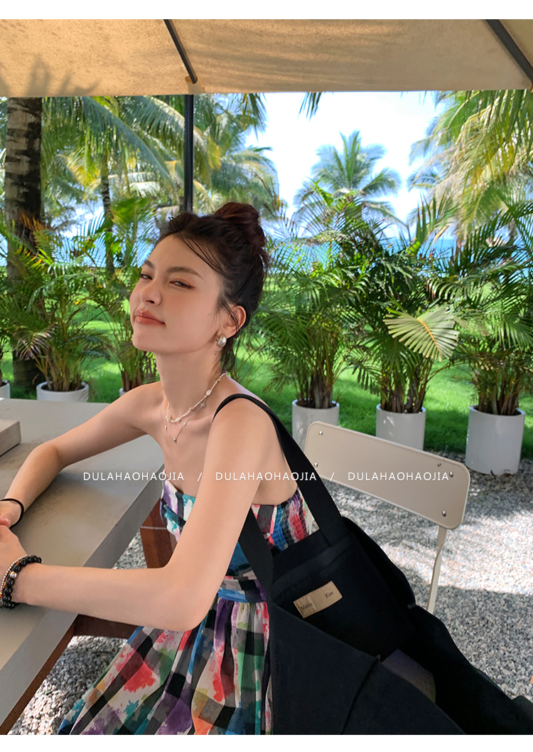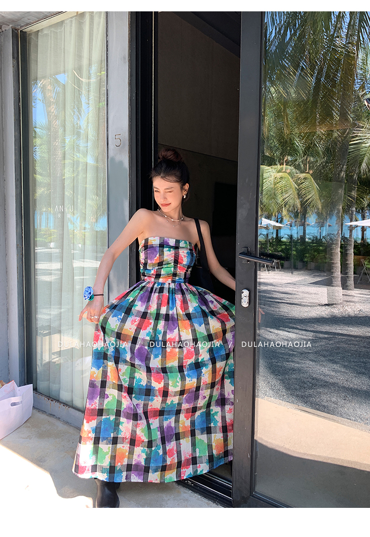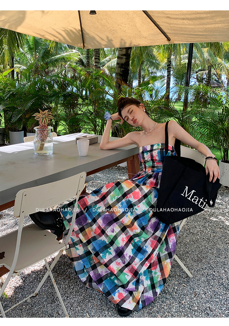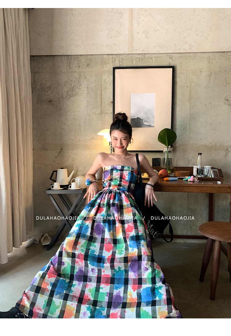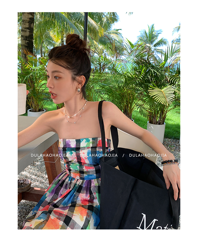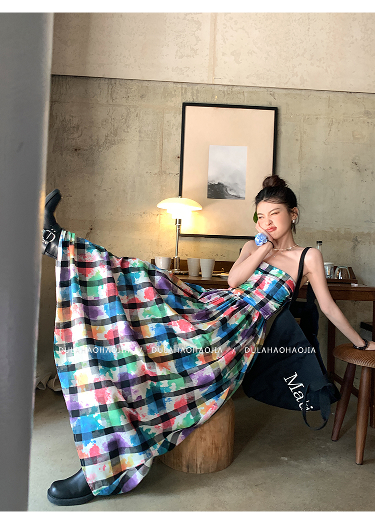 DULA好好家 塗鴉抹胸洋裝女2023年夏季新款法式高腰顯瘦長裙子