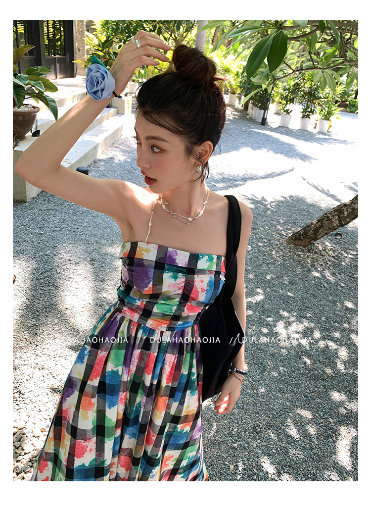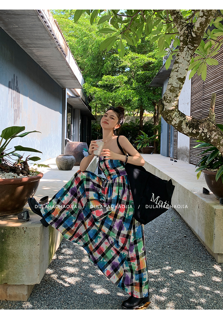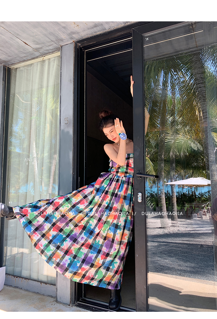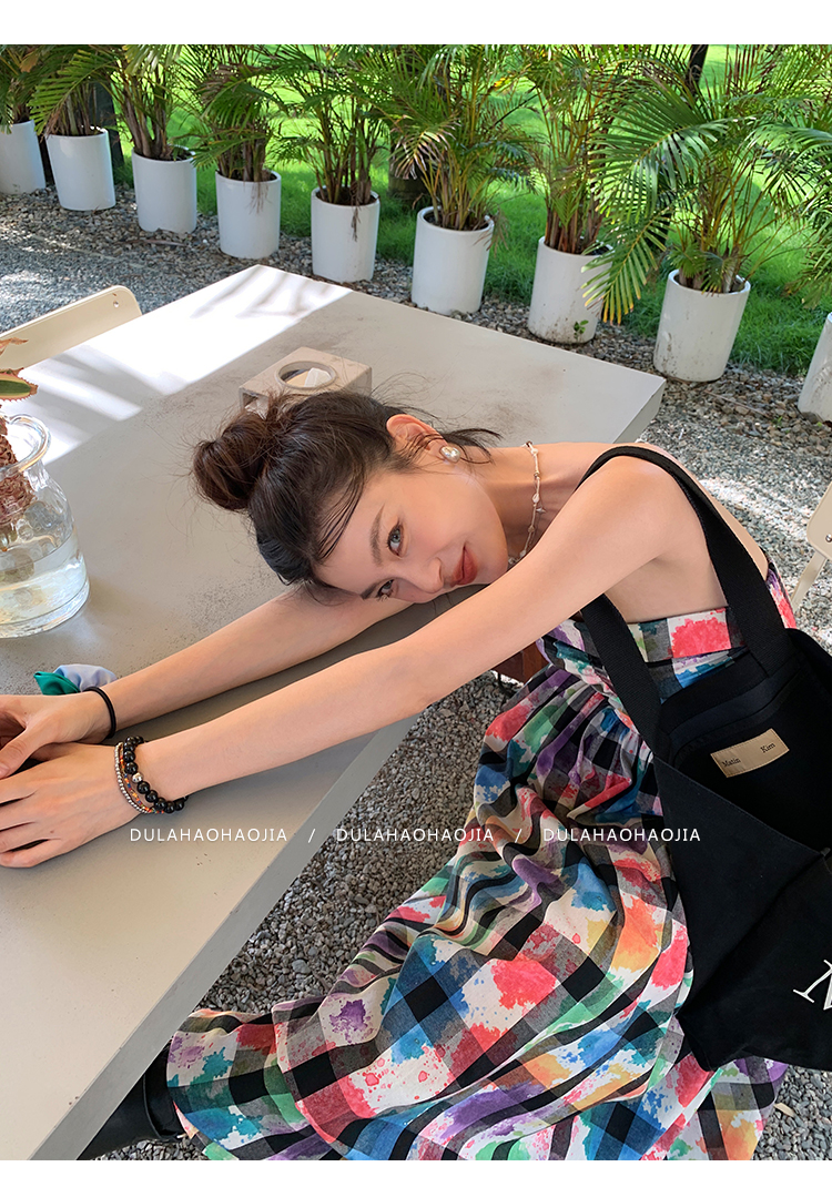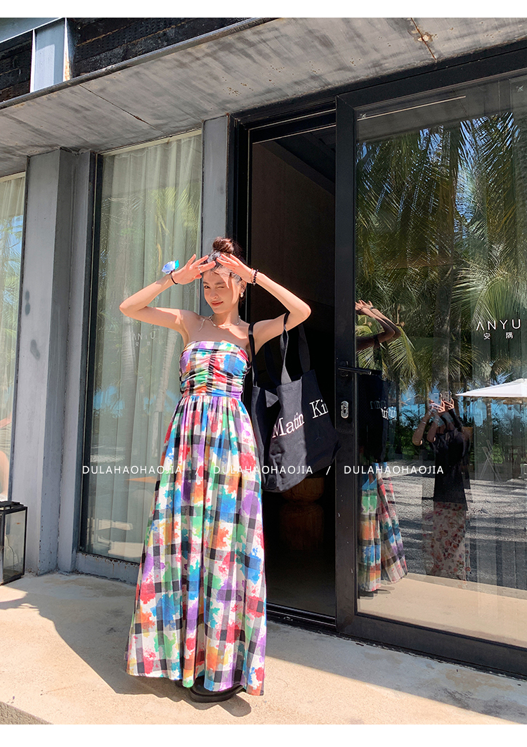 DULA好好家 塗鴉抹胸洋裝女2023年夏季新款法式高腰顯瘦長裙子