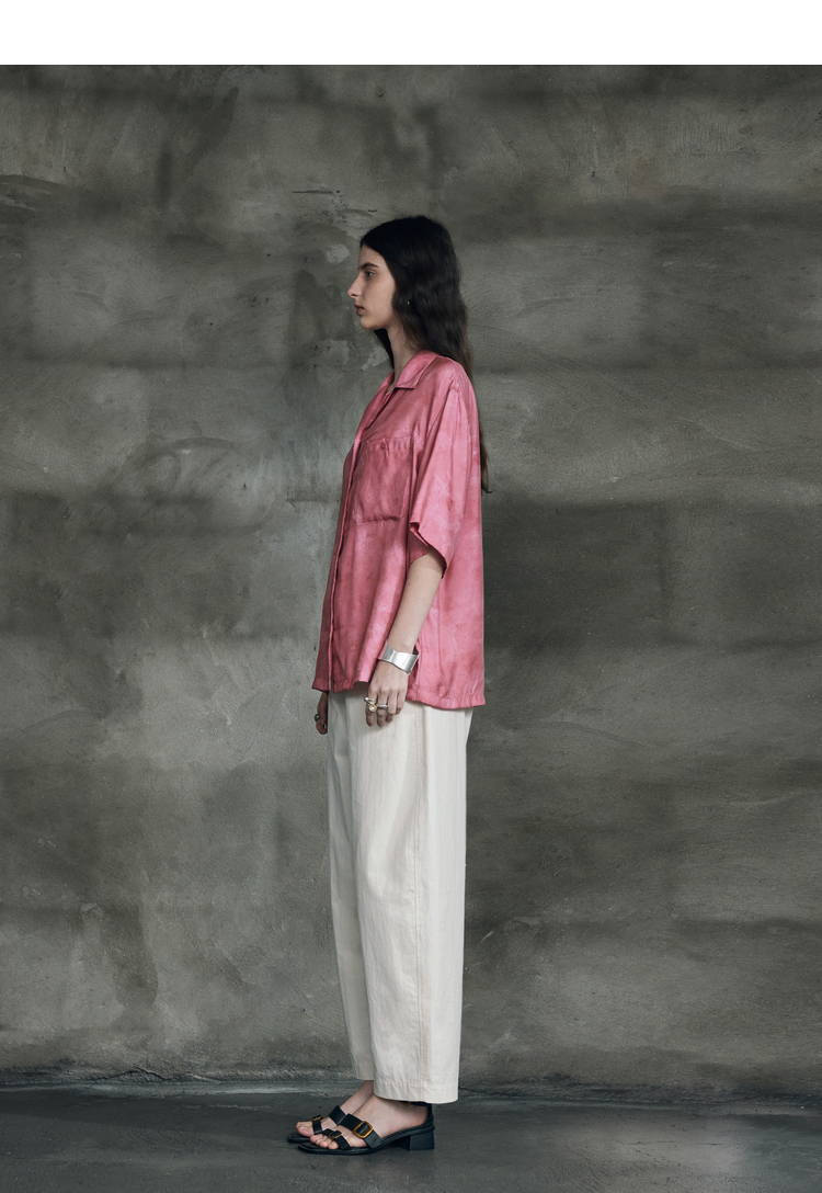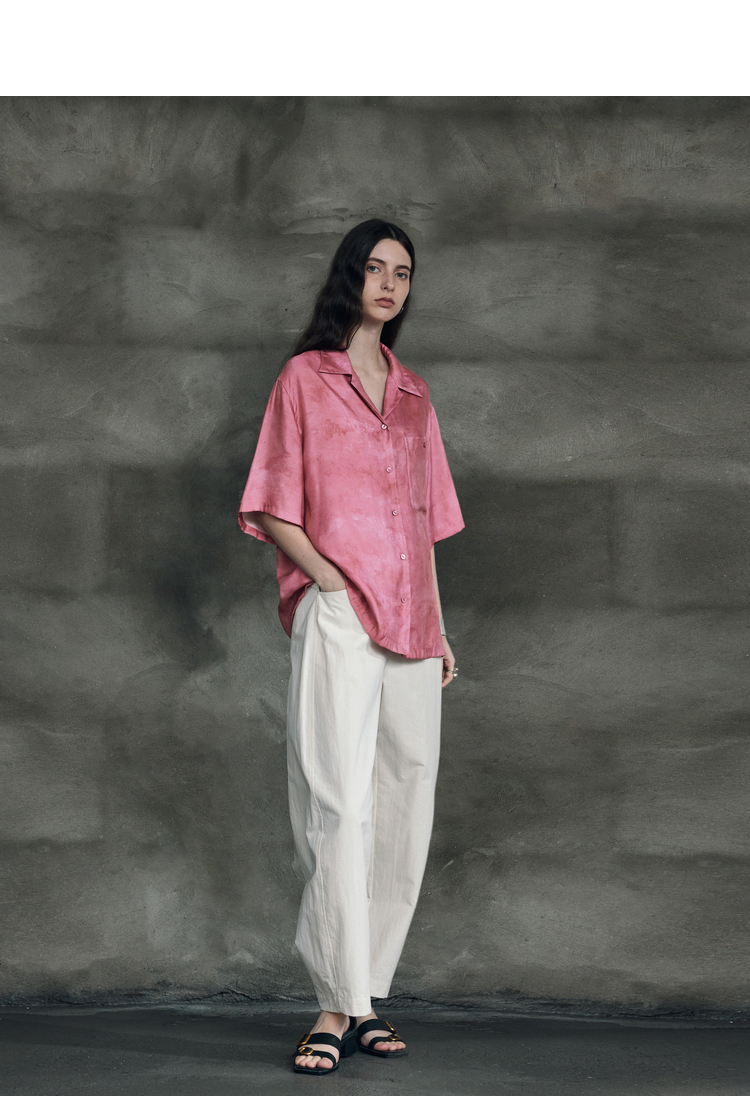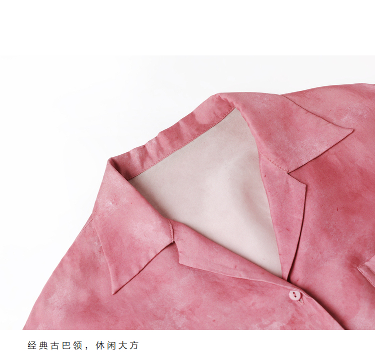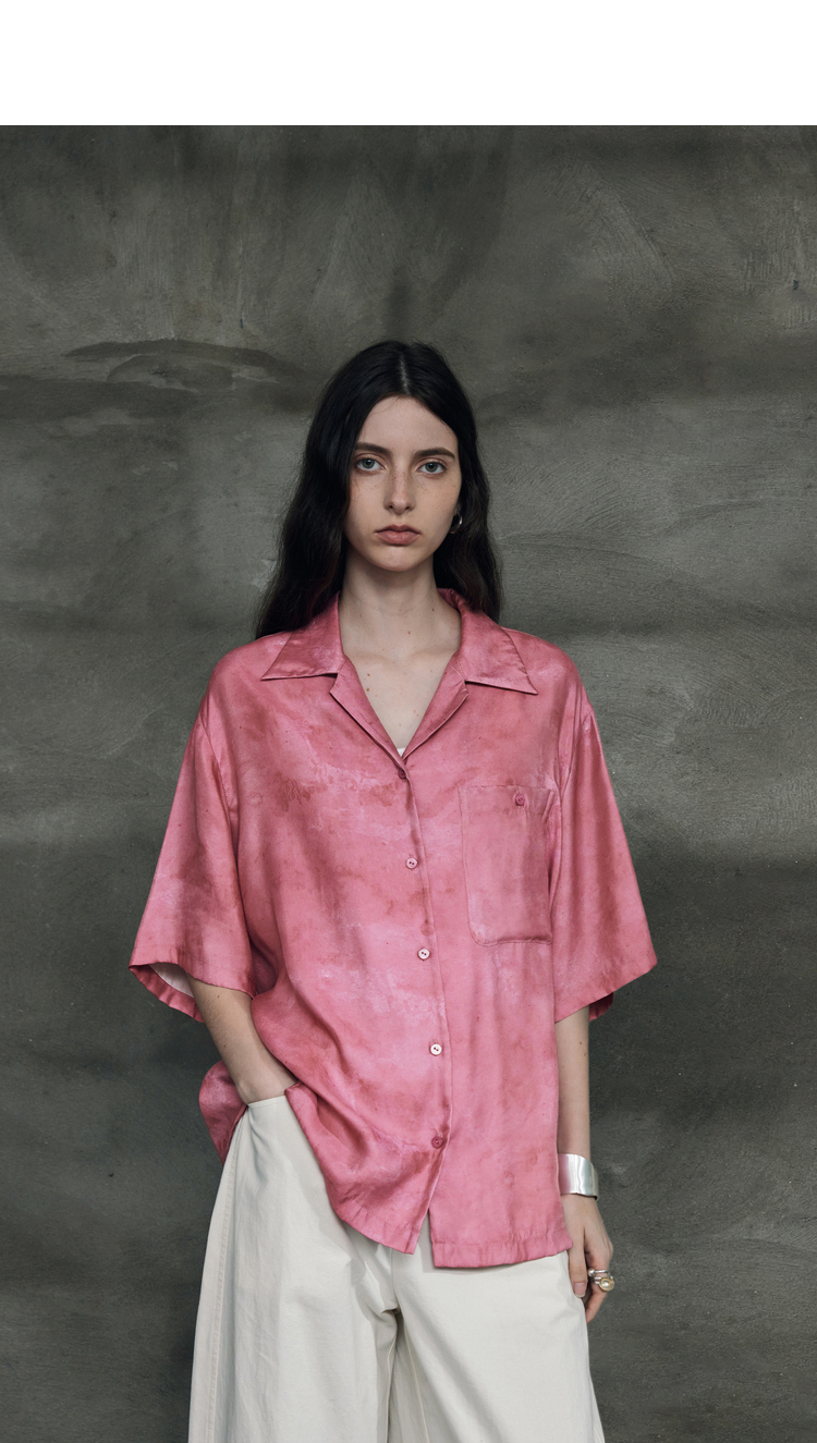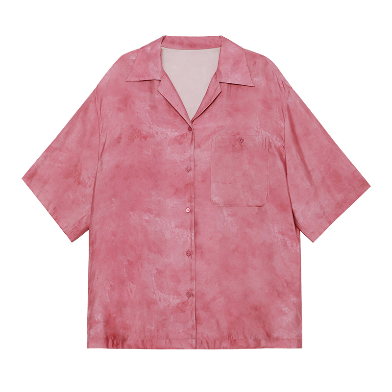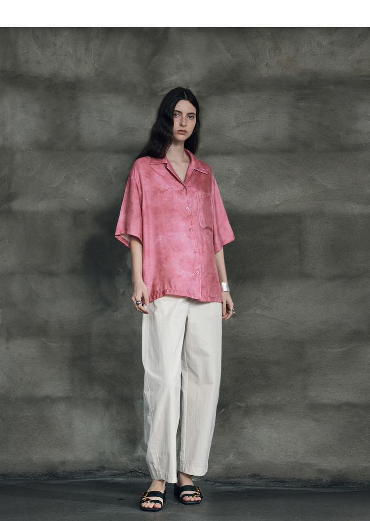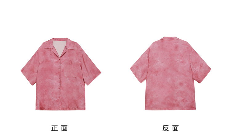 暈染工藝半圓原創設計2023夏季新款古巴領印花上衣寬鬆爽滑柔軟