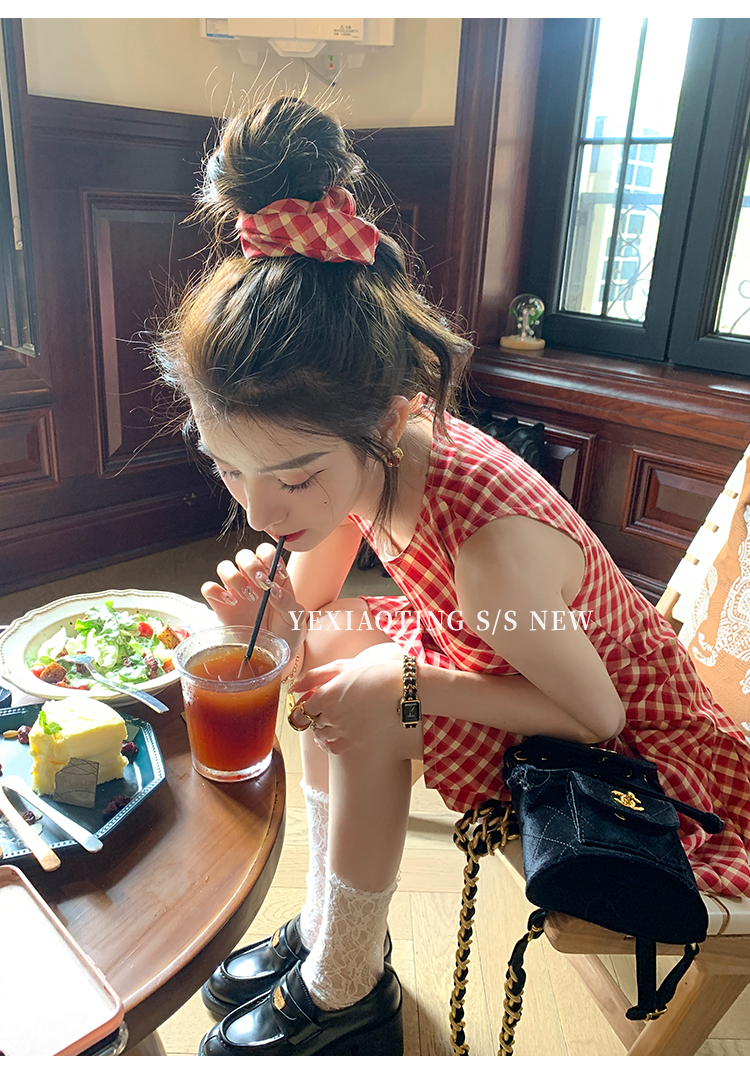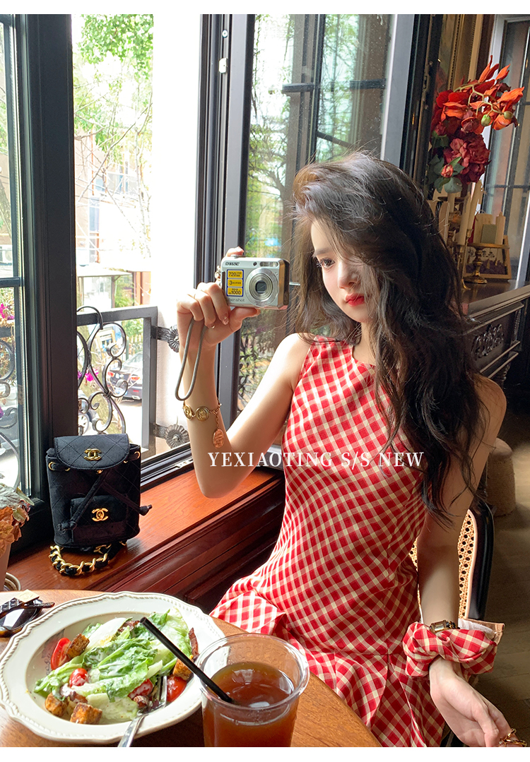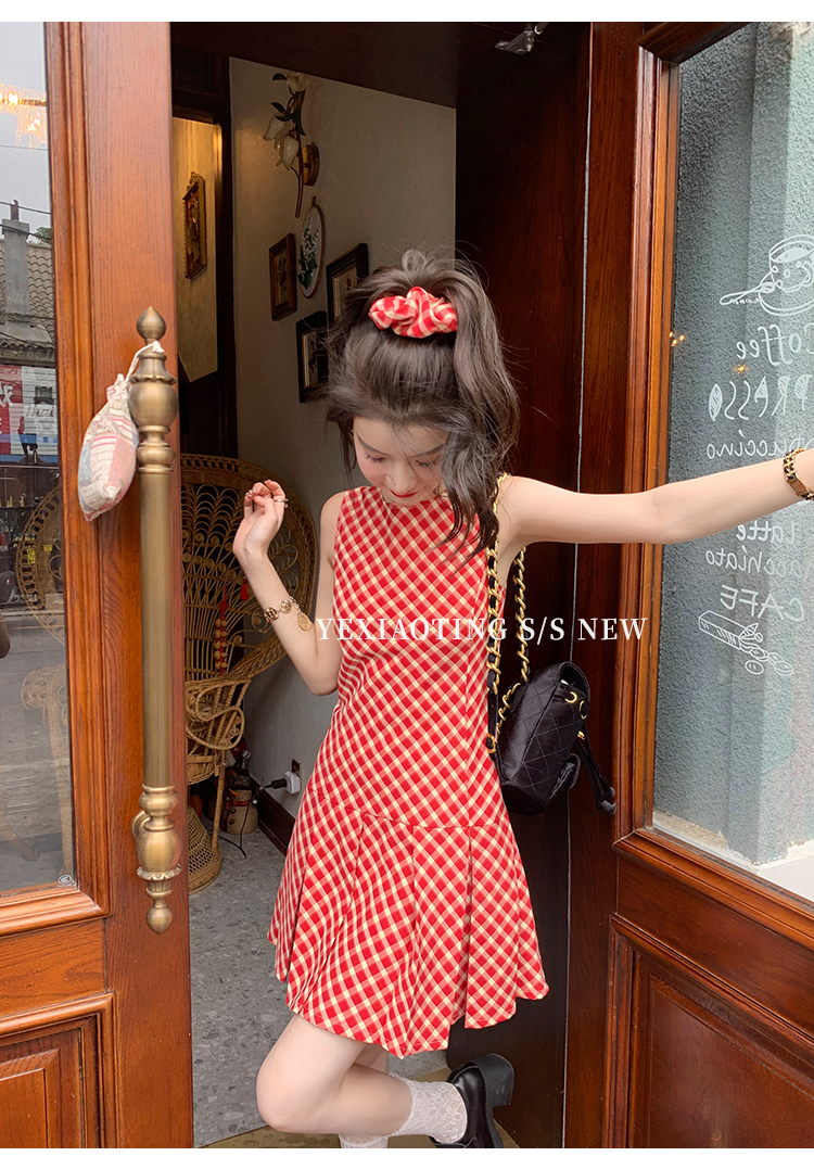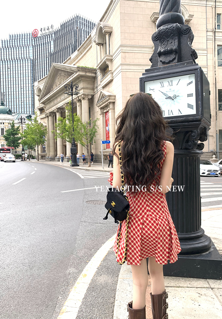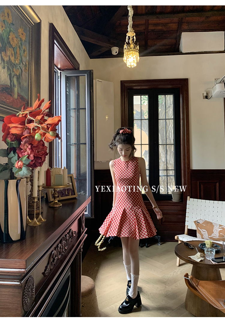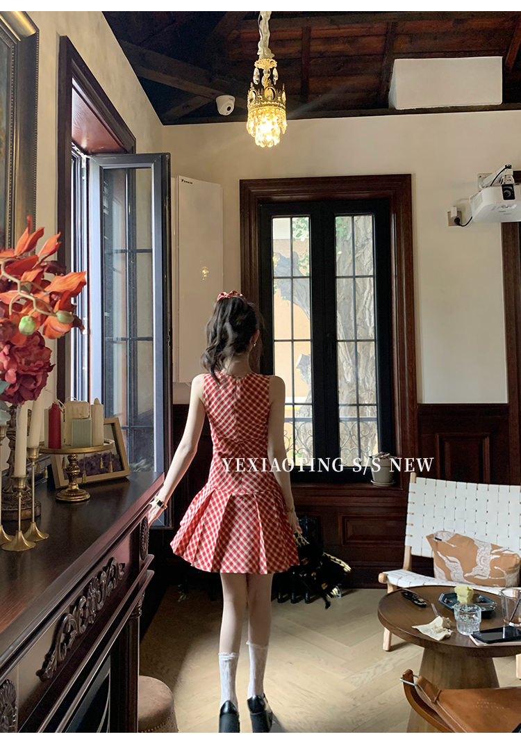 YEXIAOTING葉小婷 聽見玫瑰低語 草莓紅白格紋裙無袖洋裝女夏