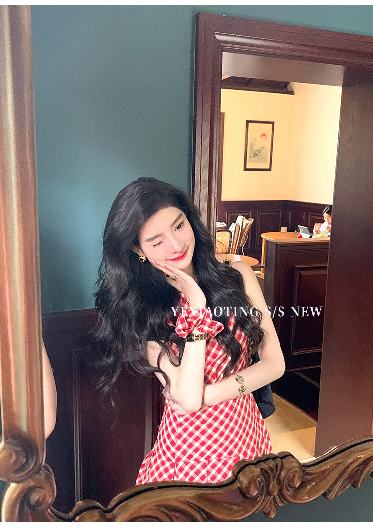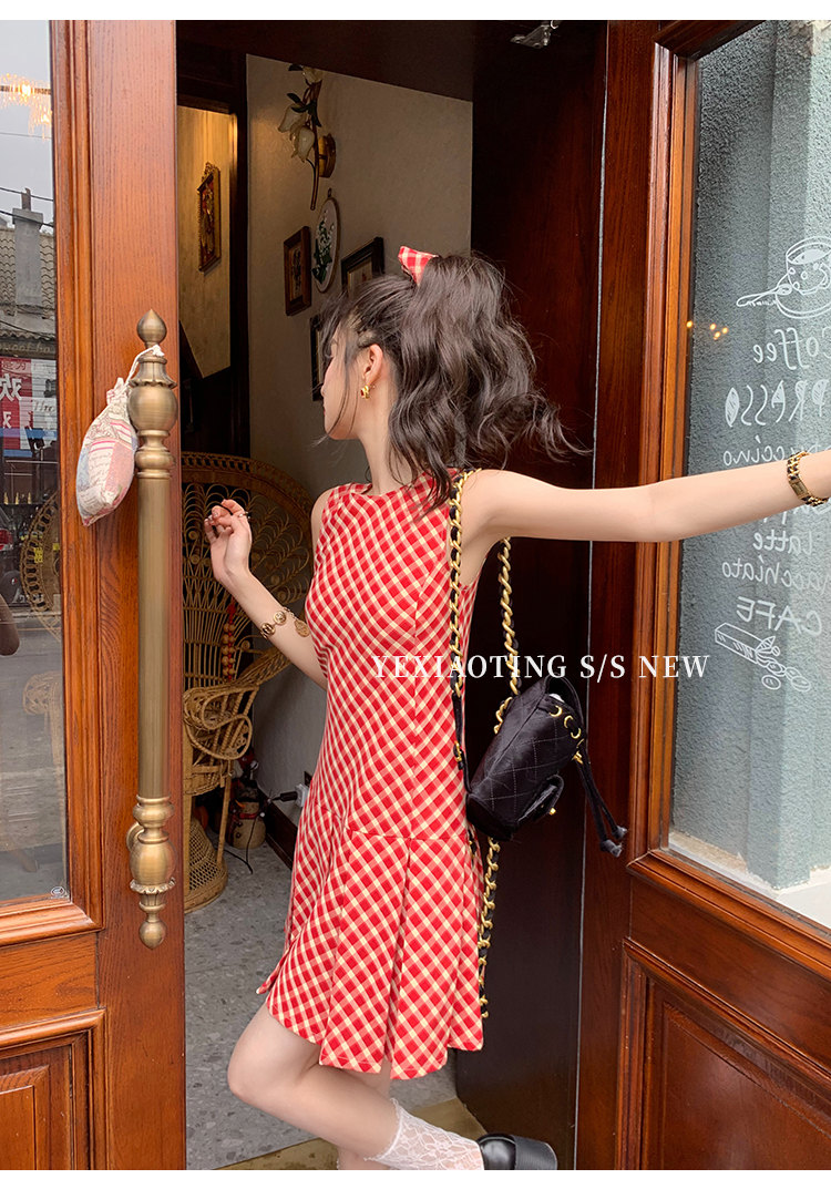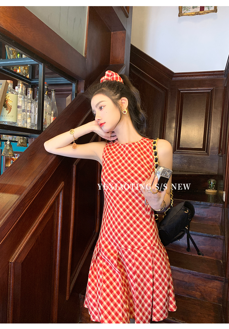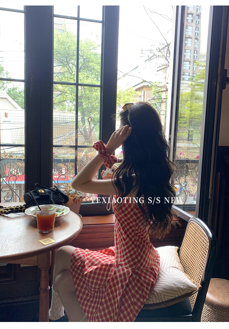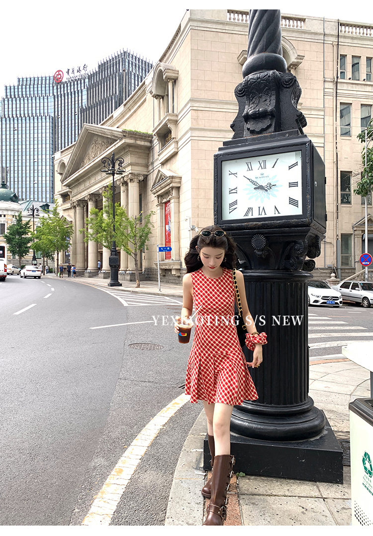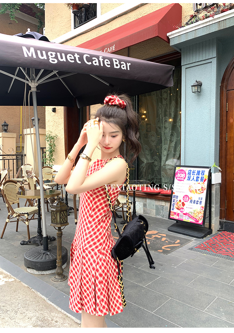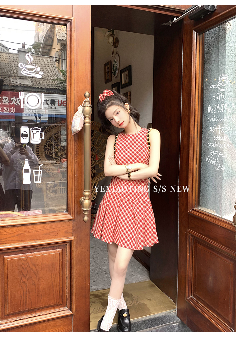 YEXIAOTING葉小婷 聽見玫瑰低語 草莓紅白格紋裙無袖洋裝女夏