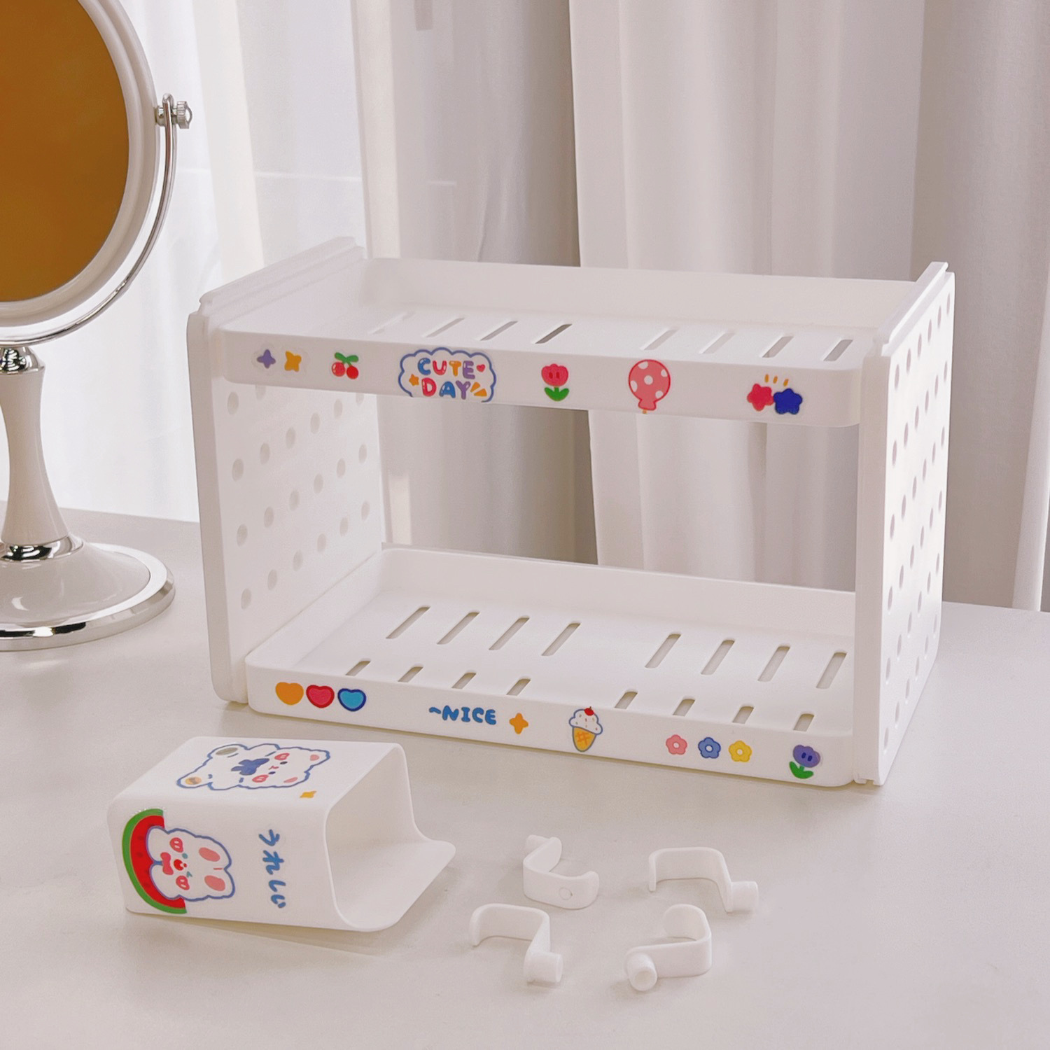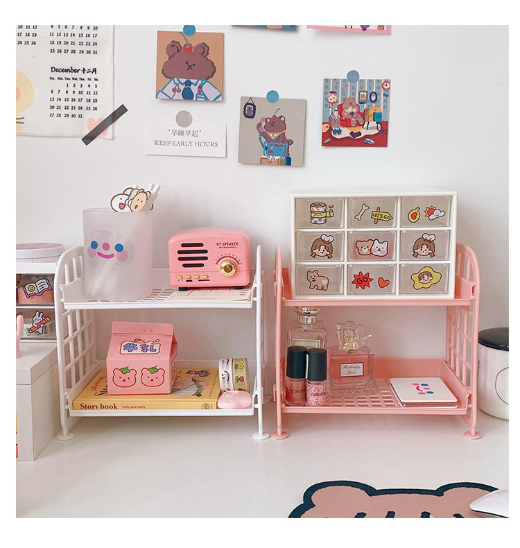 颜色 1#粉色双层收纳架,2#蓝色双层收纳架,3#紫色双层收纳架,4#柠檬黄双层收纳架,5#浅绿双层收纳架,6#白色双层收纳架,7#浅紫双层收纳架,8#莫兰迪蓝色,1#桌面收纳架,1#白色收纳架,2#粉色收纳架,1#米白两层(桶+3勾),2#米白三层(2桶+6勾),3#浅粉两层(桶+3勾),4#浅粉三层(2桶+6勾),5#米白两层(桶+3勾+送贴纸),6#米白三层(2桶+6勾+送贴纸),7#浅粉两层(桶+3勾+送贴纸),8#浅粉三层(2桶+6勾+送贴纸)