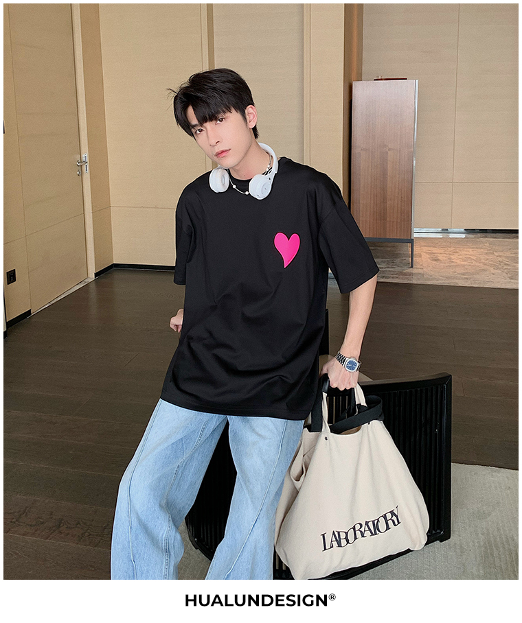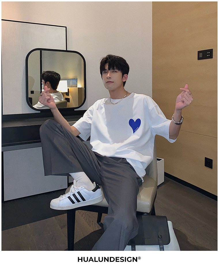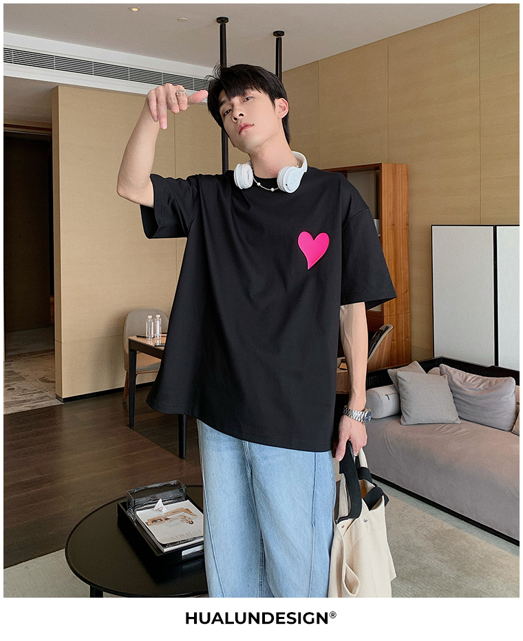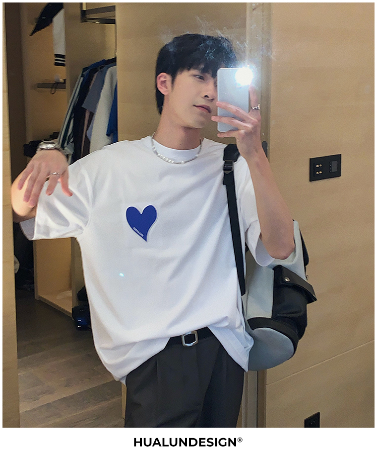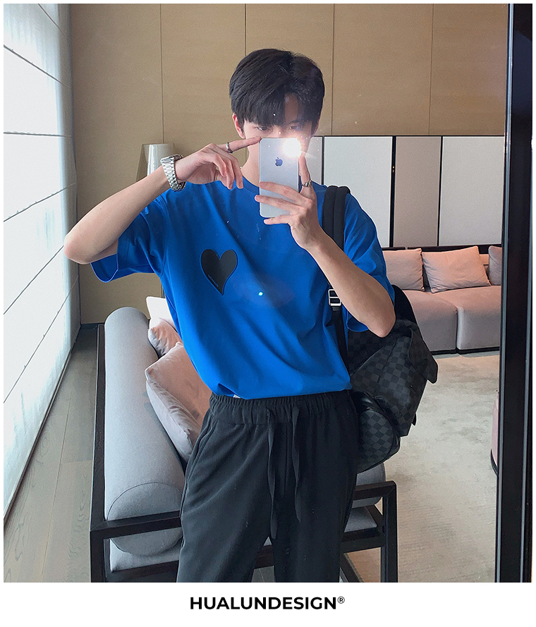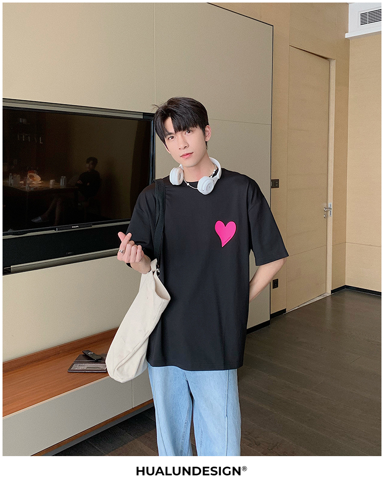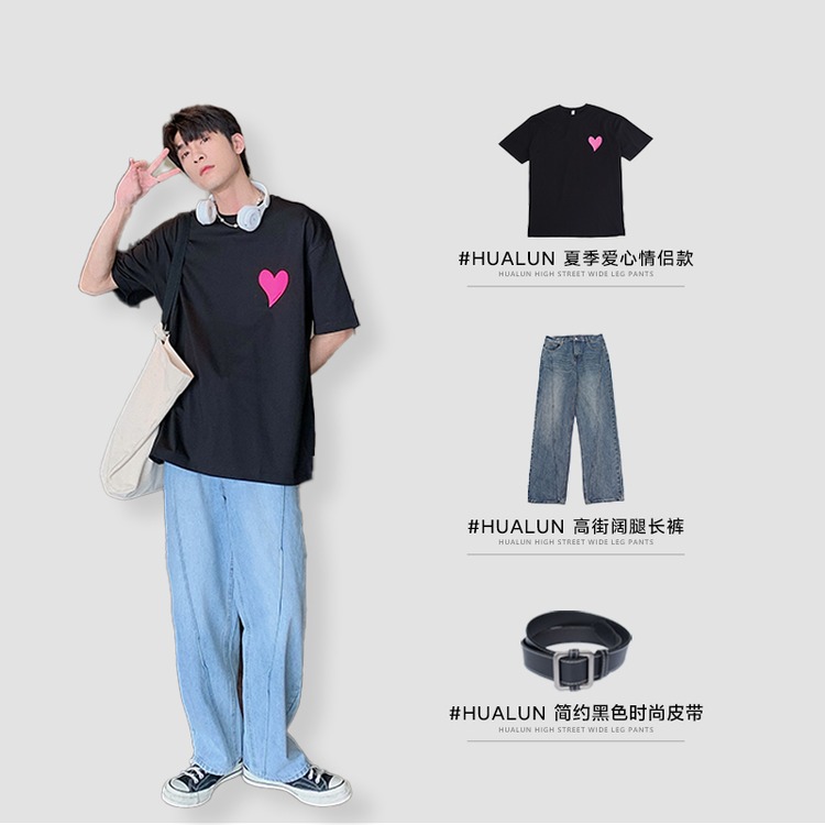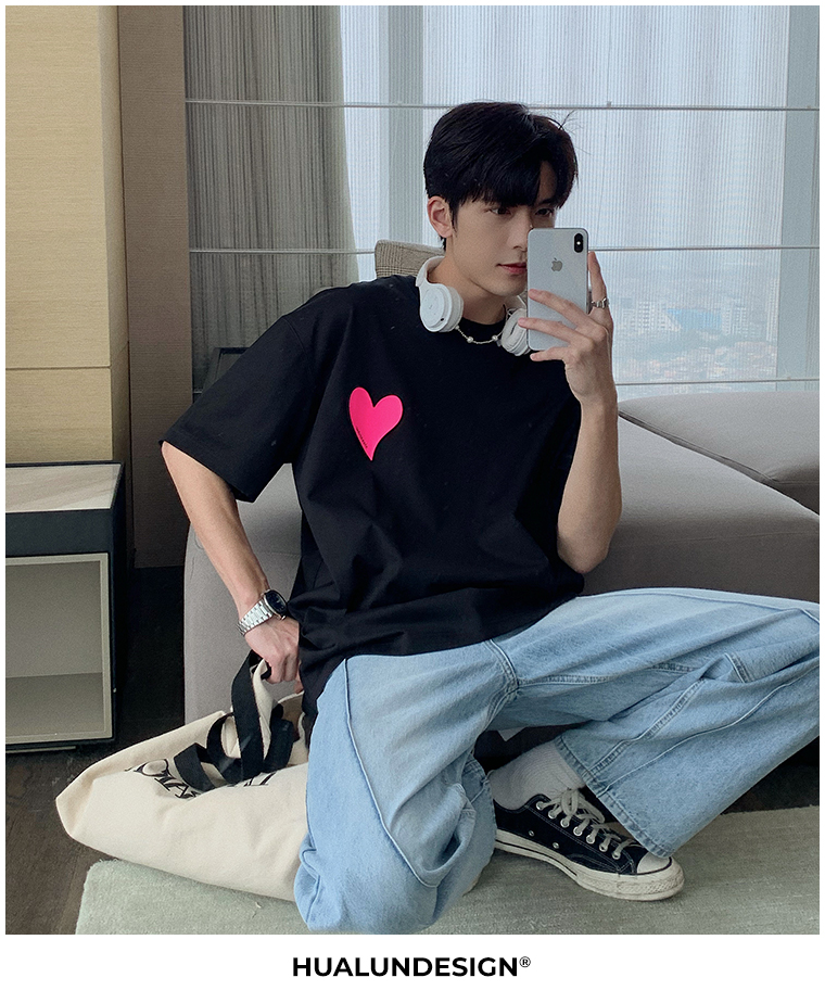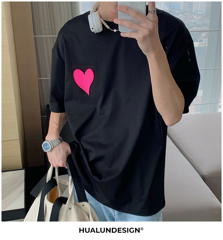 Hualun夏季愛心情侶T恤男韓版寬鬆圓領短袖T恤日系百搭潮ins上衣