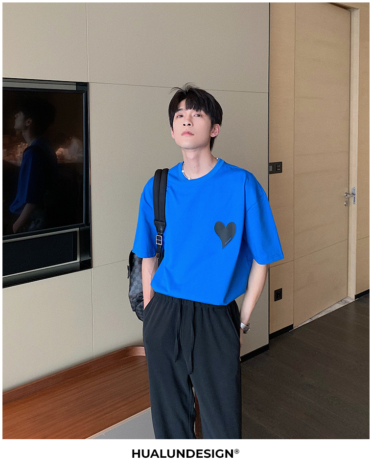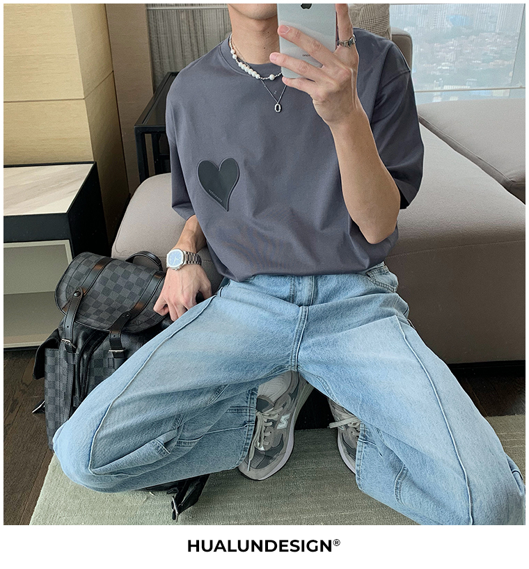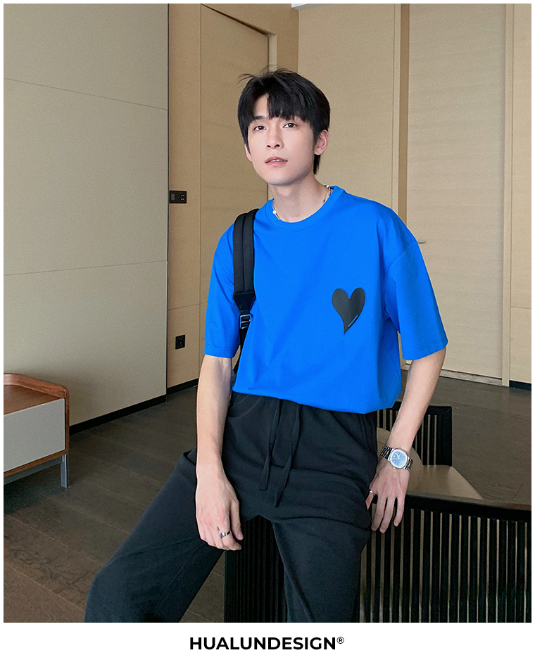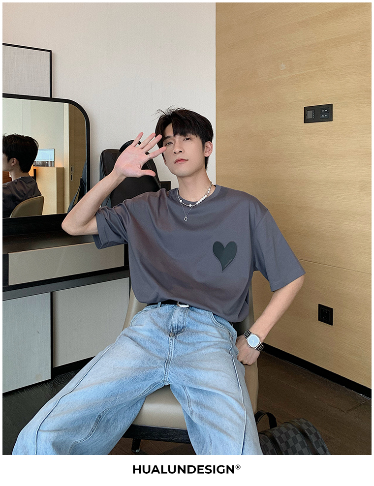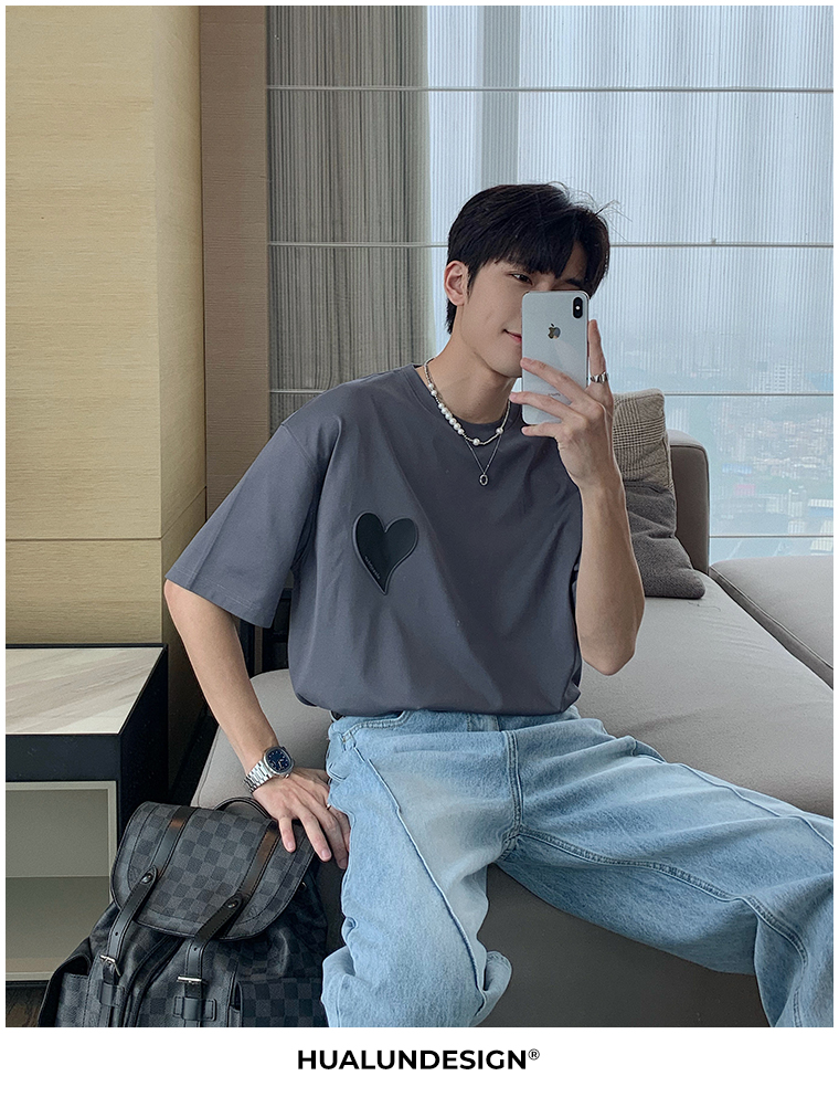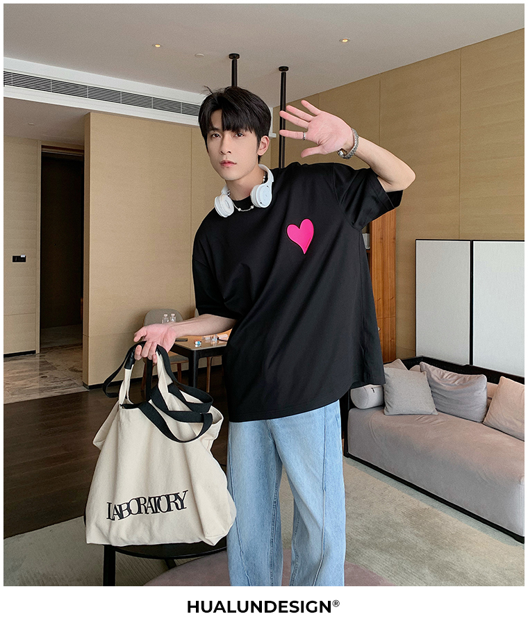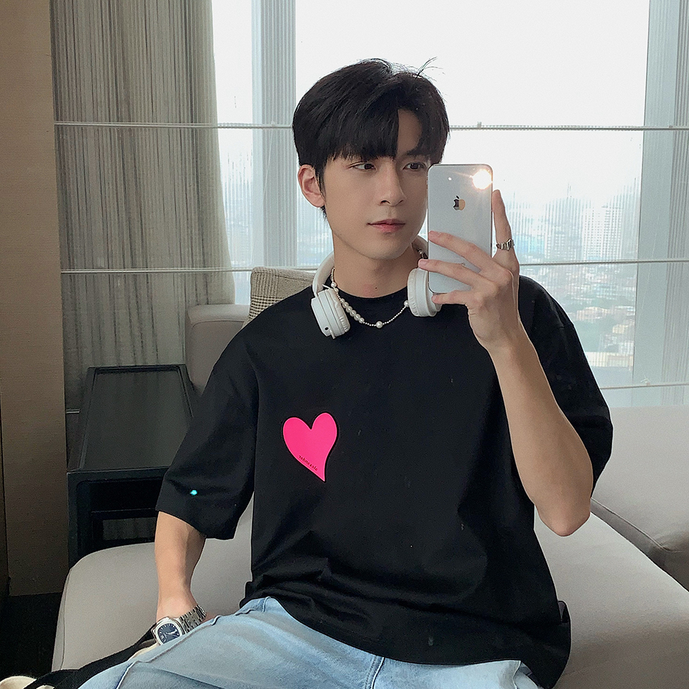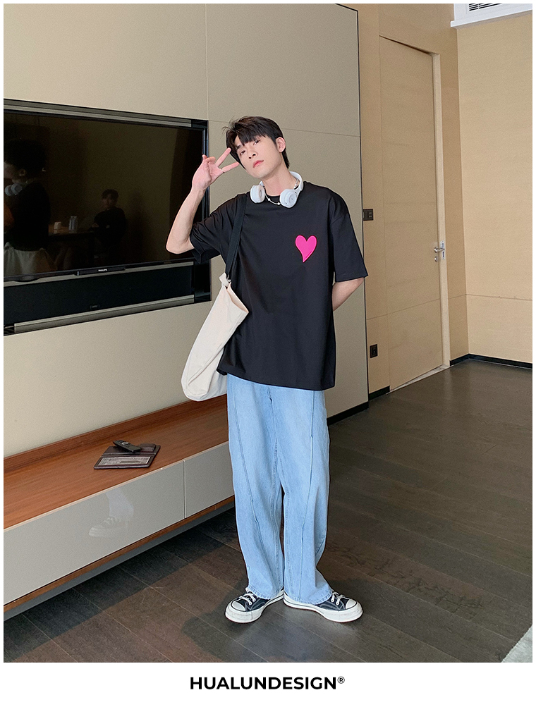 Hualun夏季愛心情侶T恤男韓版寬鬆圓領短袖T恤日系百搭潮ins上衣