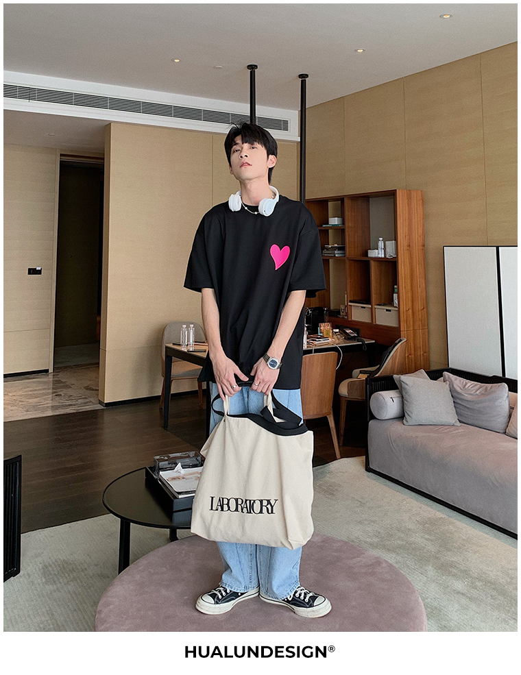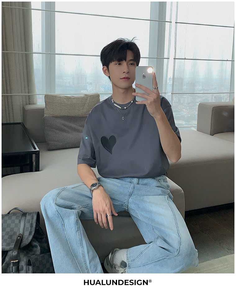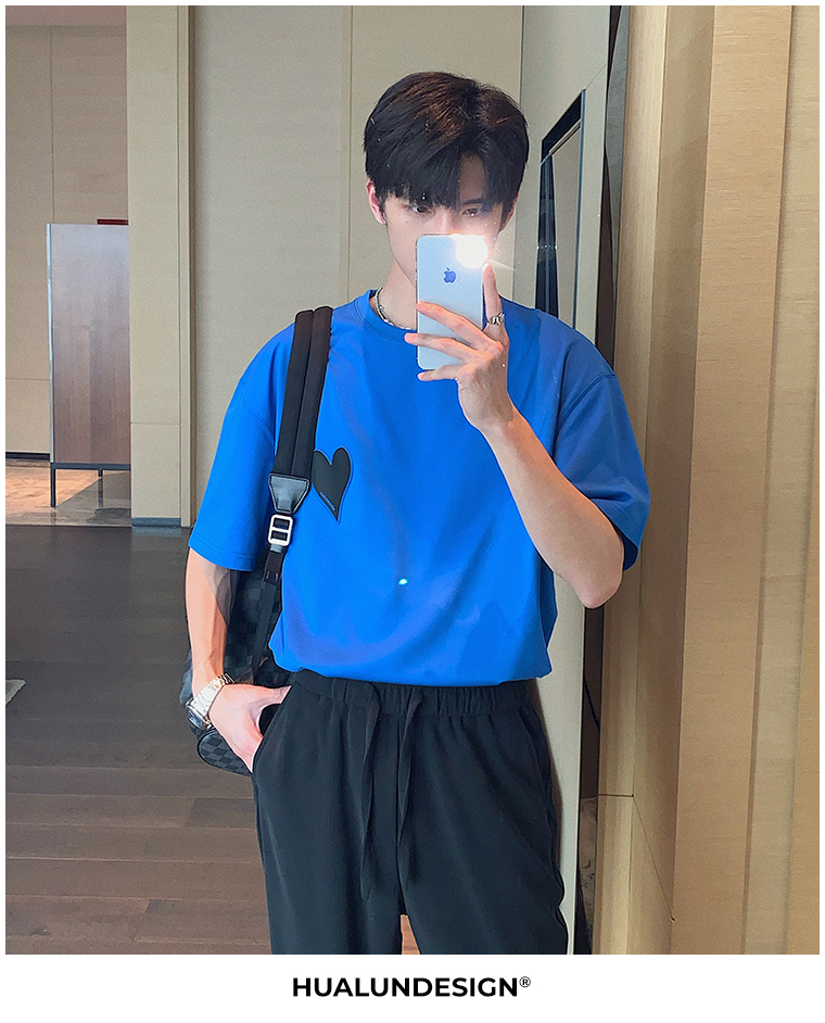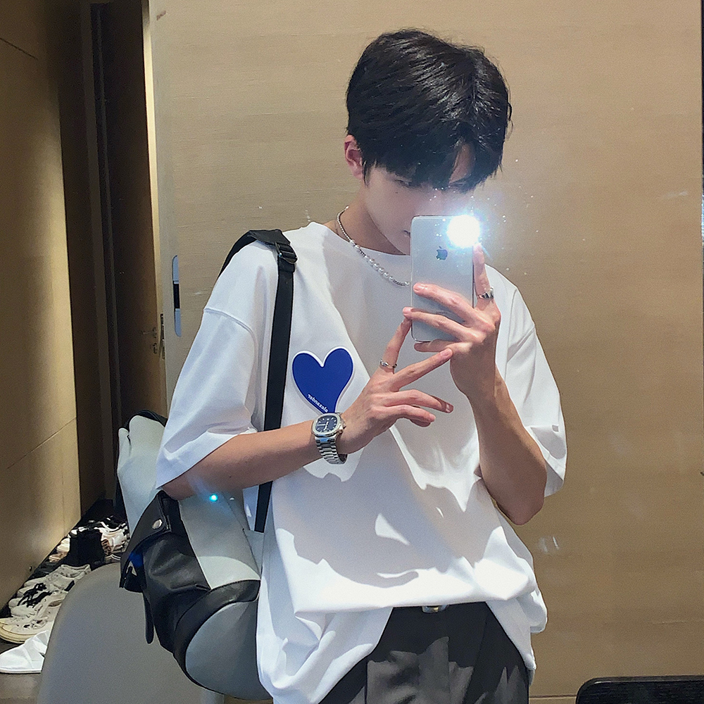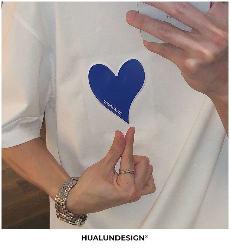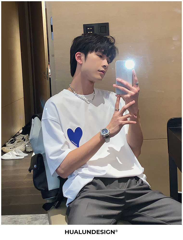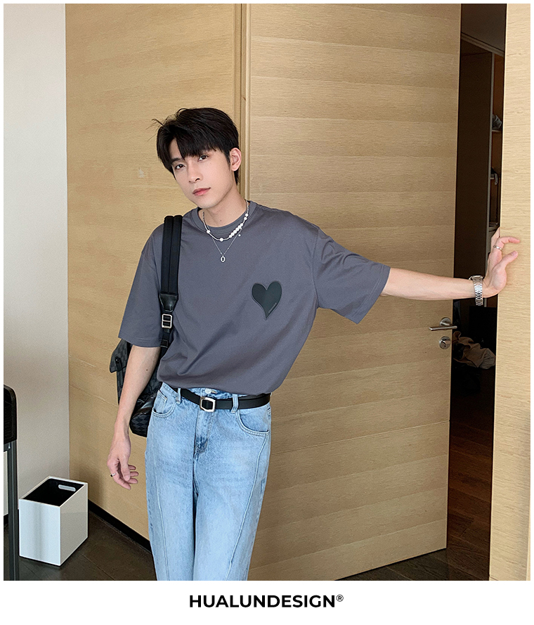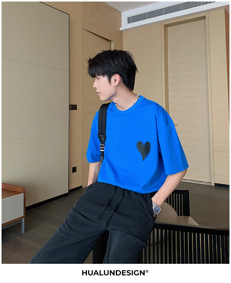 Hualun夏季愛心情侶T恤男韓版寬鬆圓領短袖T恤日系百搭潮ins上衣